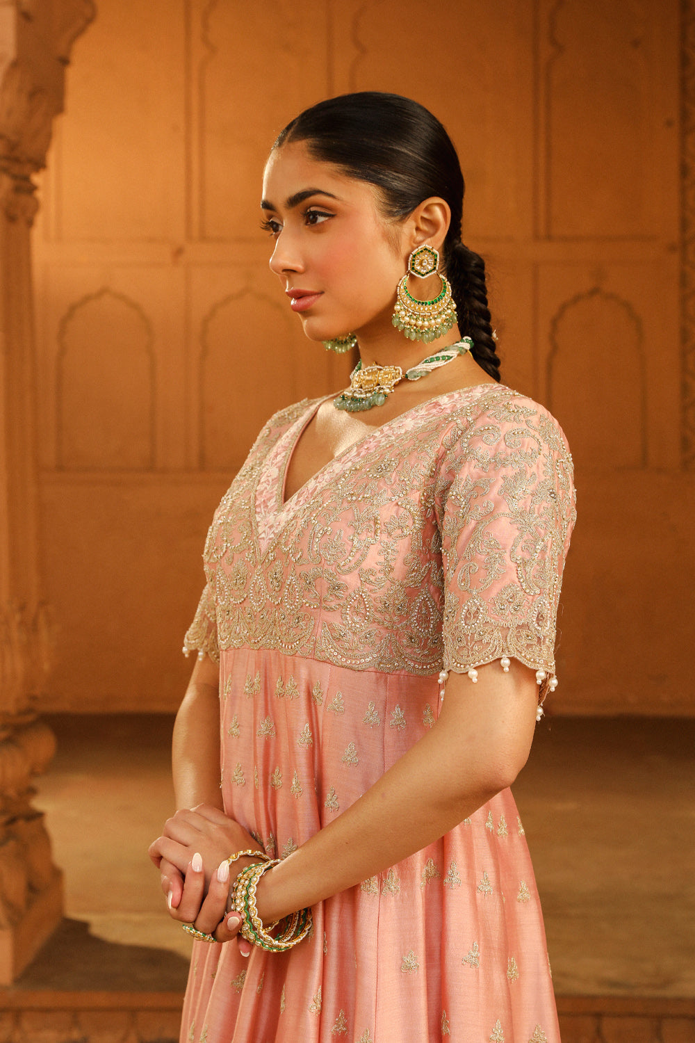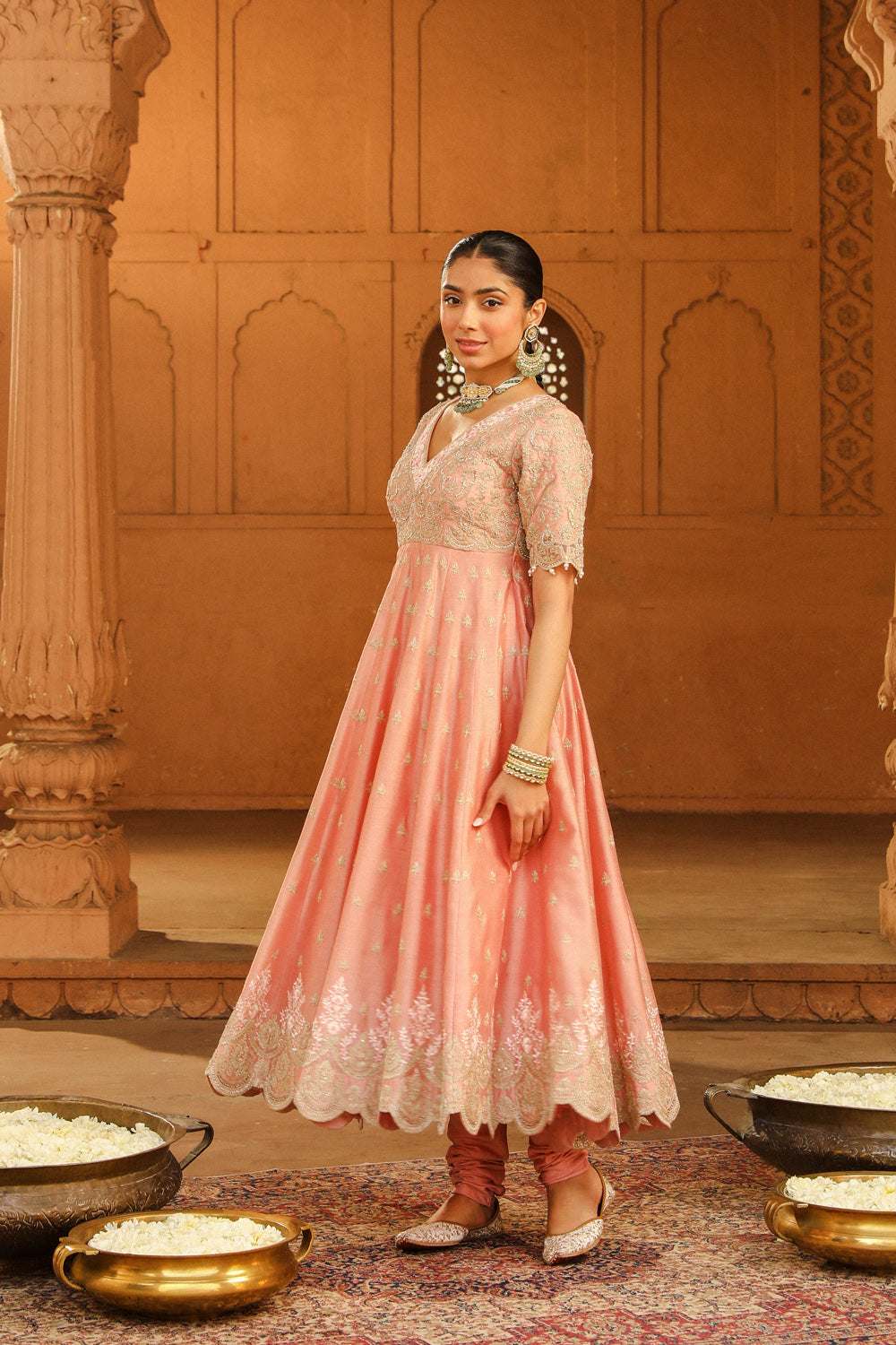 The long ankle length kalidaar anarkali is made in pure silk chanderi fabric teamed up with a chooridaar and a silk organza dupatta. The outfit is having a broad deep V neck at front, a zero back and elbow sleeves. The outfit is adorned with Kashmiri tilla and parsi gara embroidery highlighted with basra moti. The outfit is finished with scallop detailing.