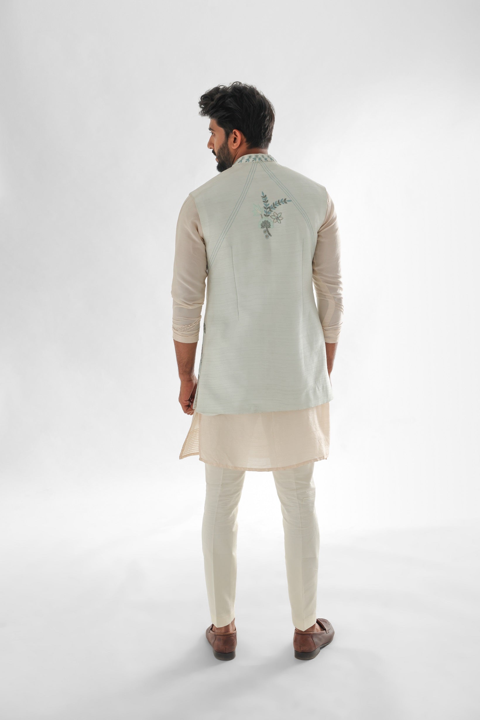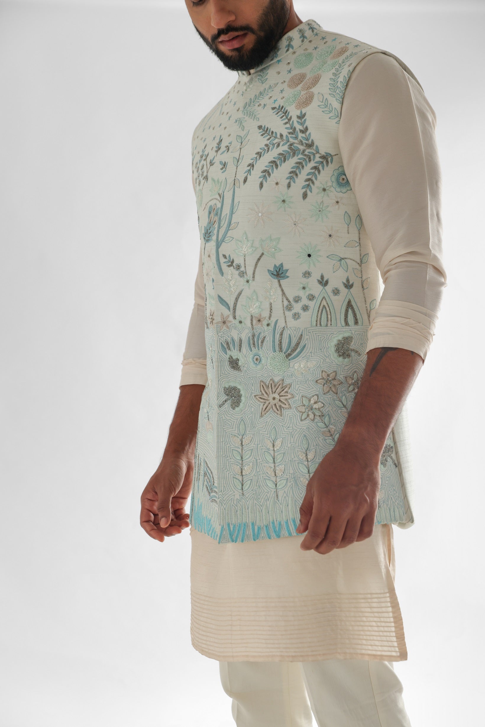 LIGHT BLUE LONG NEHRU JACKET WITH THE USE OF THREADWORK , MIRROR HIGHLIGHTED WITH SILVER SEQUENCE