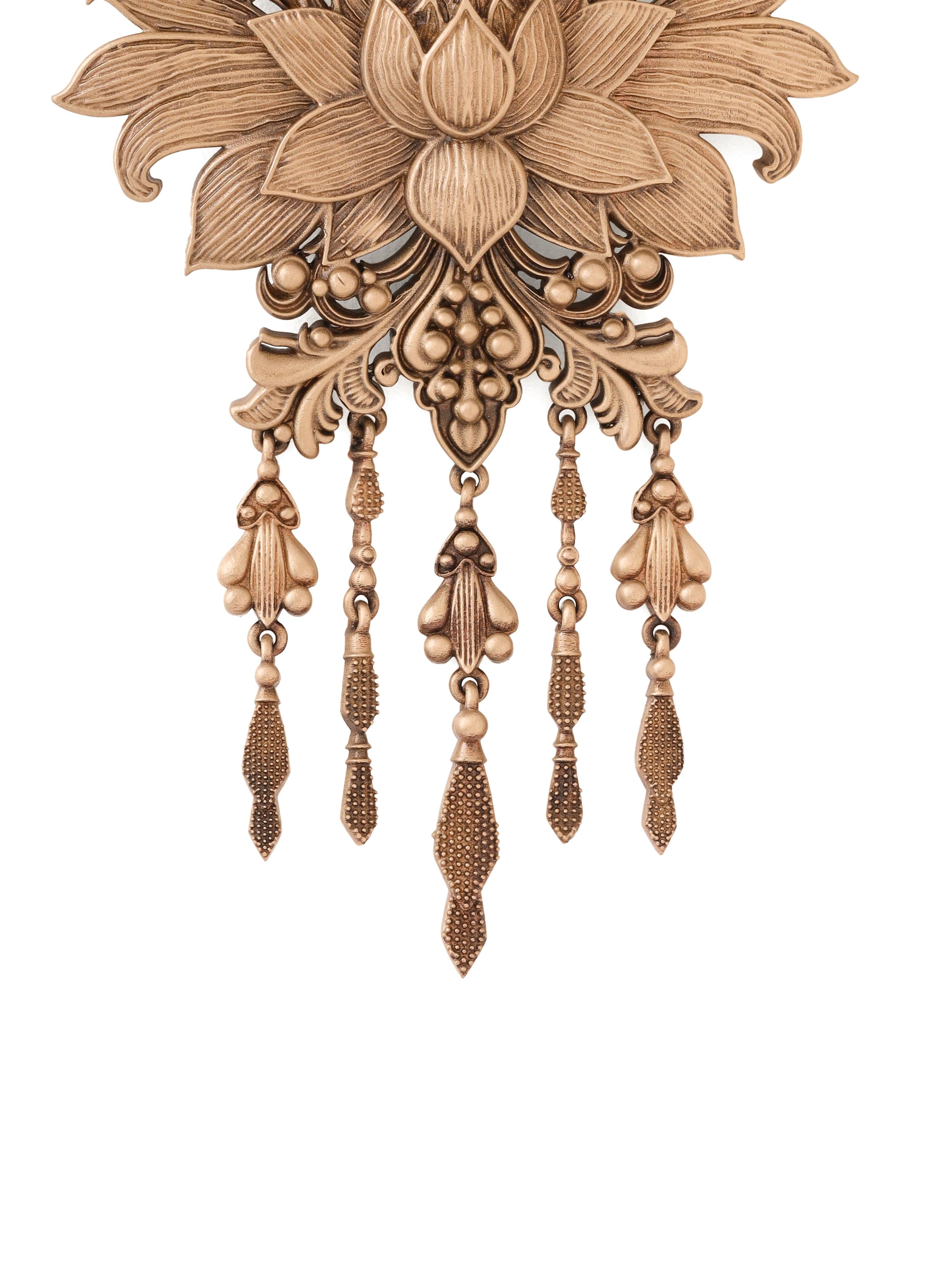 | The Lotus Splendor Brooch is a stunning piece of craftsmanship, capturing the delicate beauty of the lotus in its intricate design. Light in weight and versatile, this brooch adds an element of elegance to coats, jackets, and bandhgalas. With its gracefully cascading accents, it is perfect for those seeking to make a refined and sophisticated statement. |