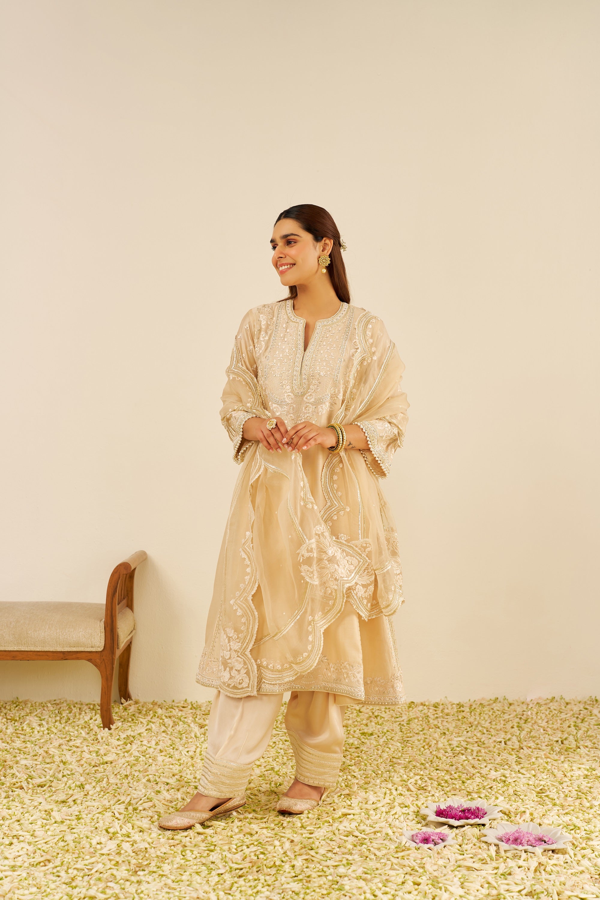 The Choga Is Fully Embroidered With Detailed Panels, Showcasing Exquisite Craftsmanship And Attention To Detail. Paired With An Embroidered Salwar, The Ensemble Radiates Timeless Beauty And Grace. To Complete The Look, The Entire Outfit Is Finished With Scallop Detailing, Providing A Refined And Polished Finish To This Stunning Creation.