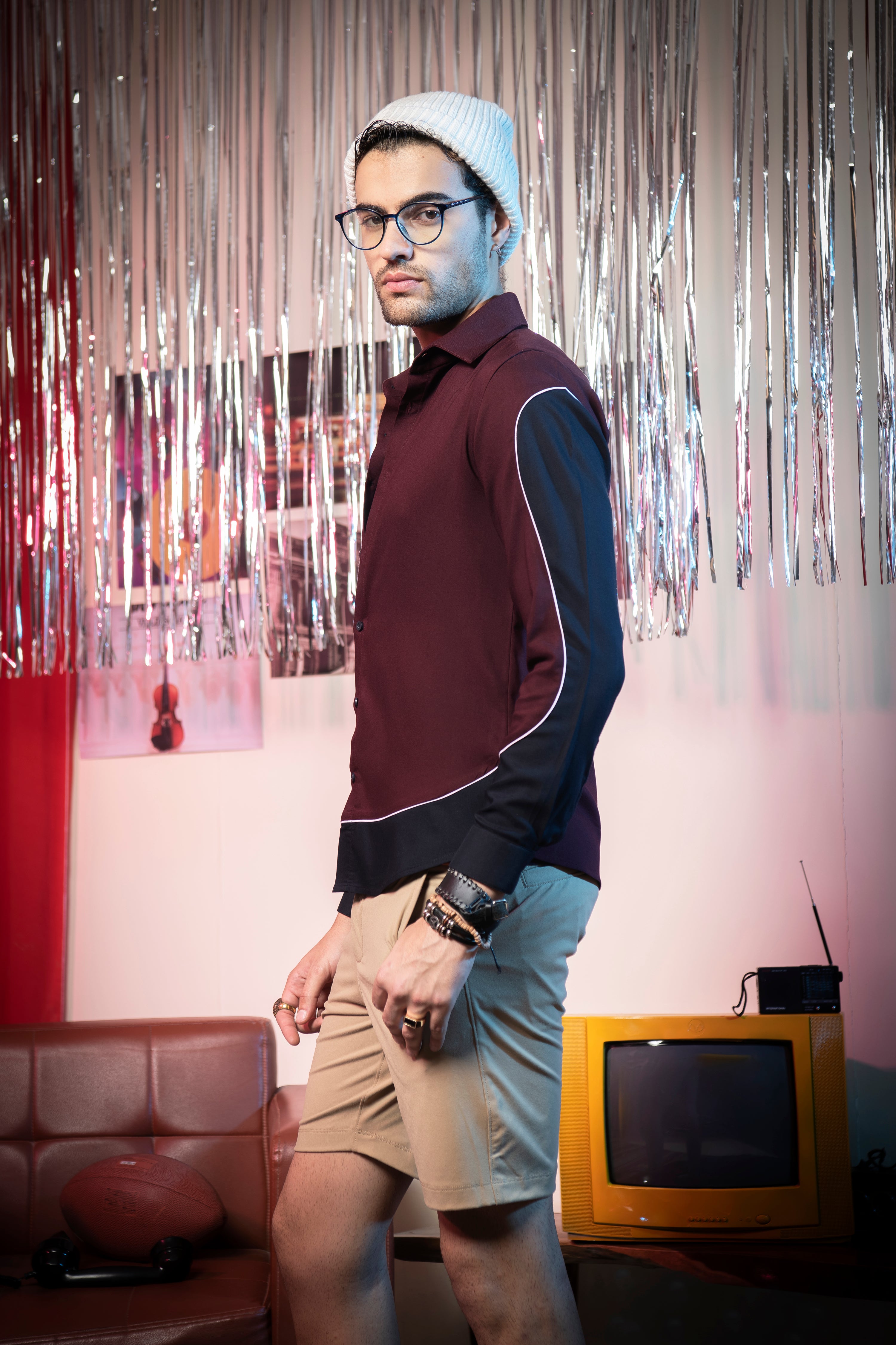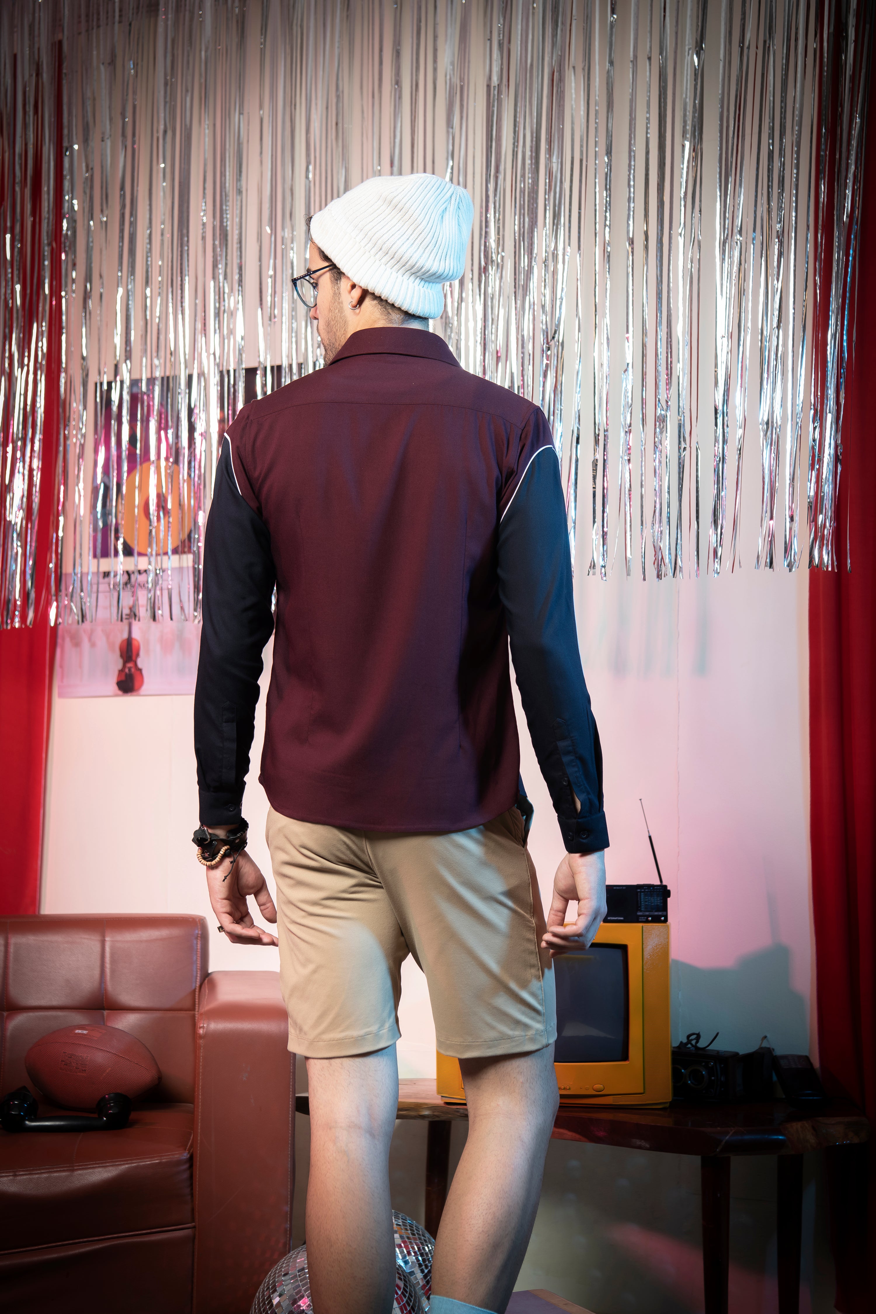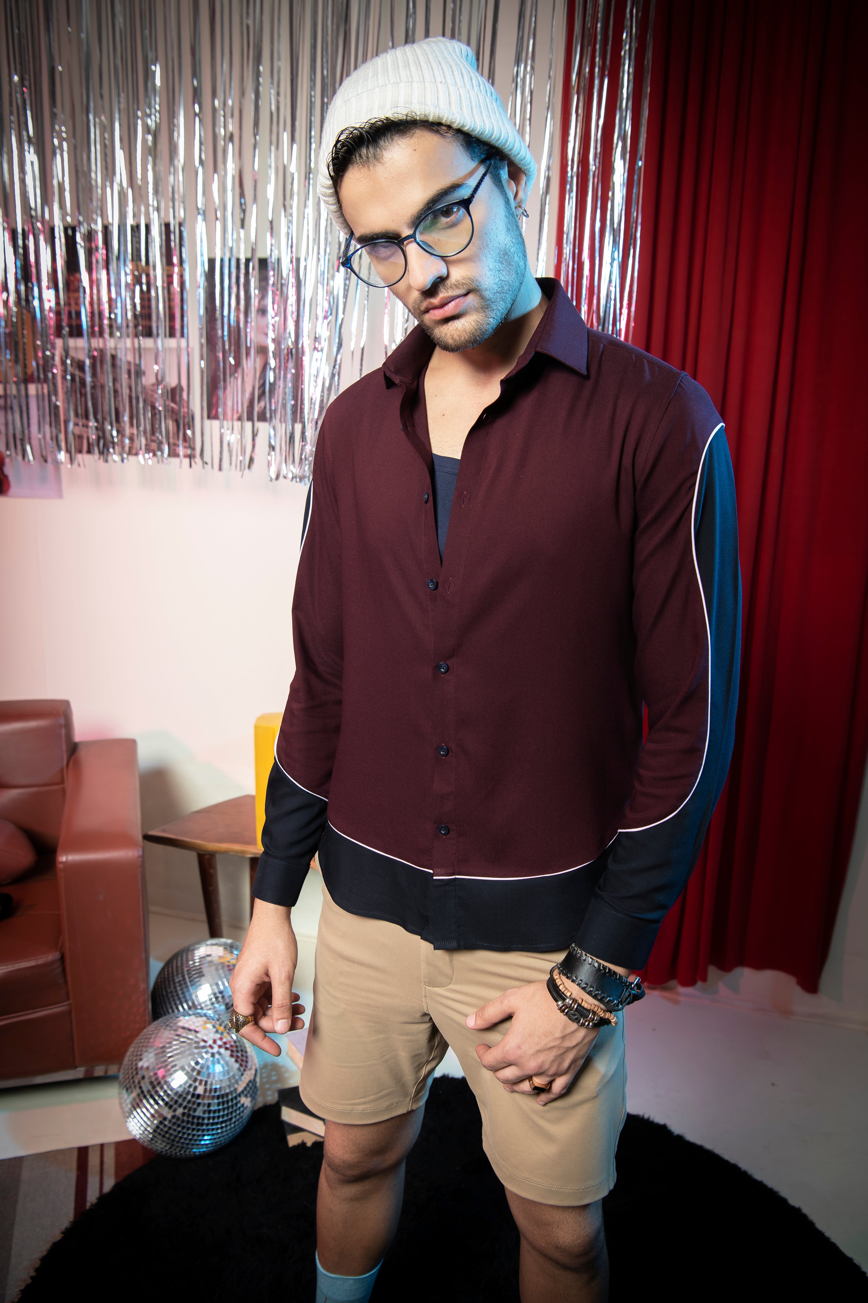 Featuring a maroon and navy blue shirt in poly viscose base with piping, french seam and cuffs detailing.