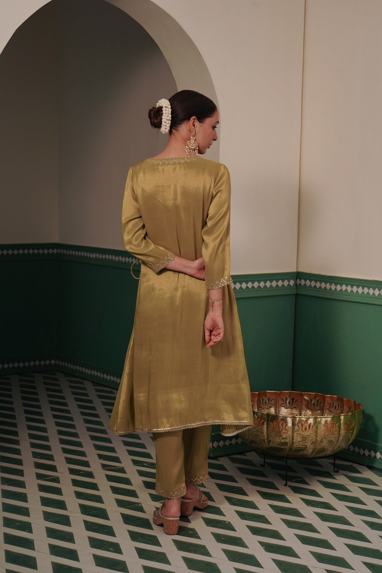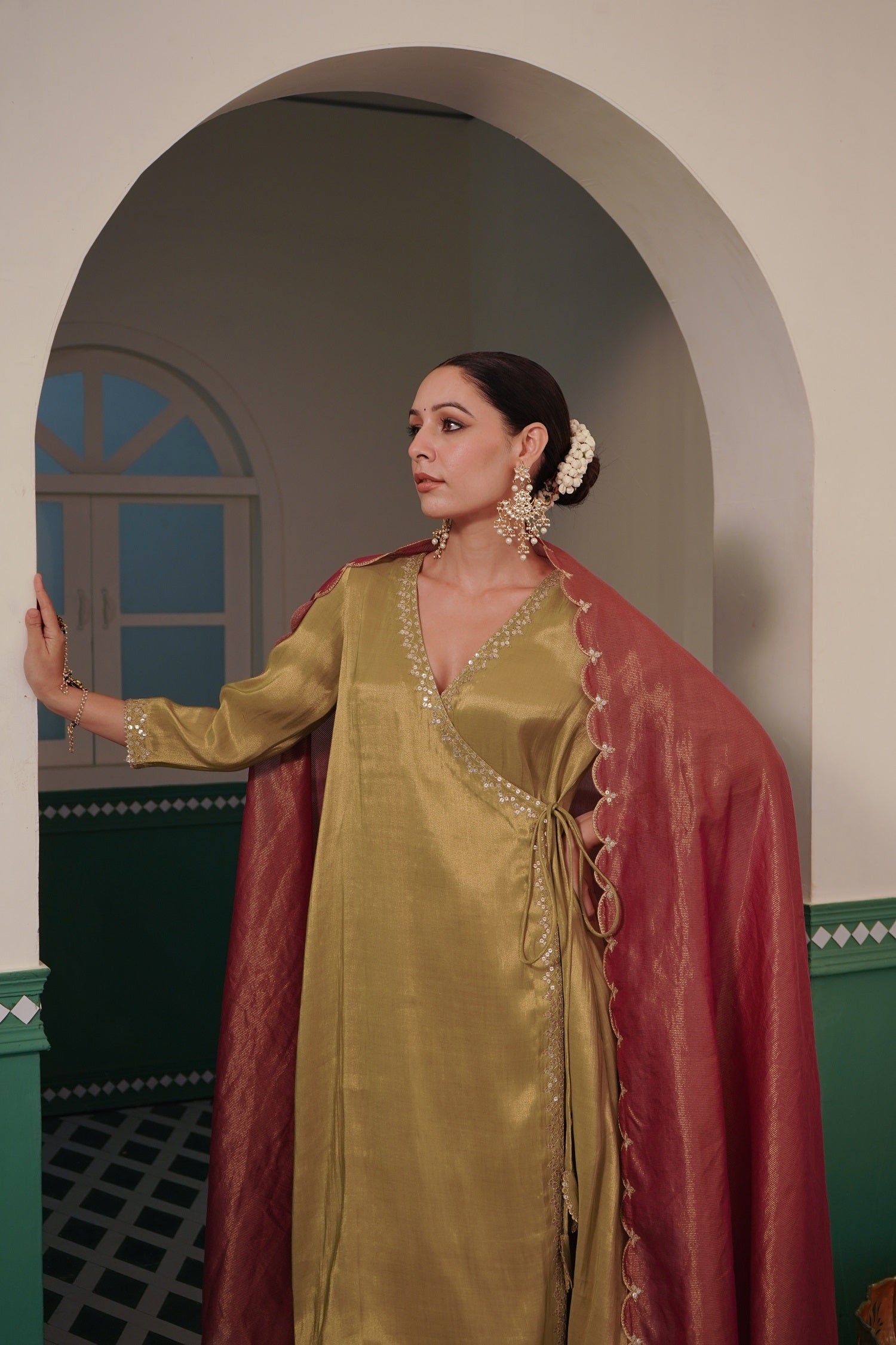 -Angrakha Kurta in Meadow Green Tissue Fabric with side tie up to adjust the waist.