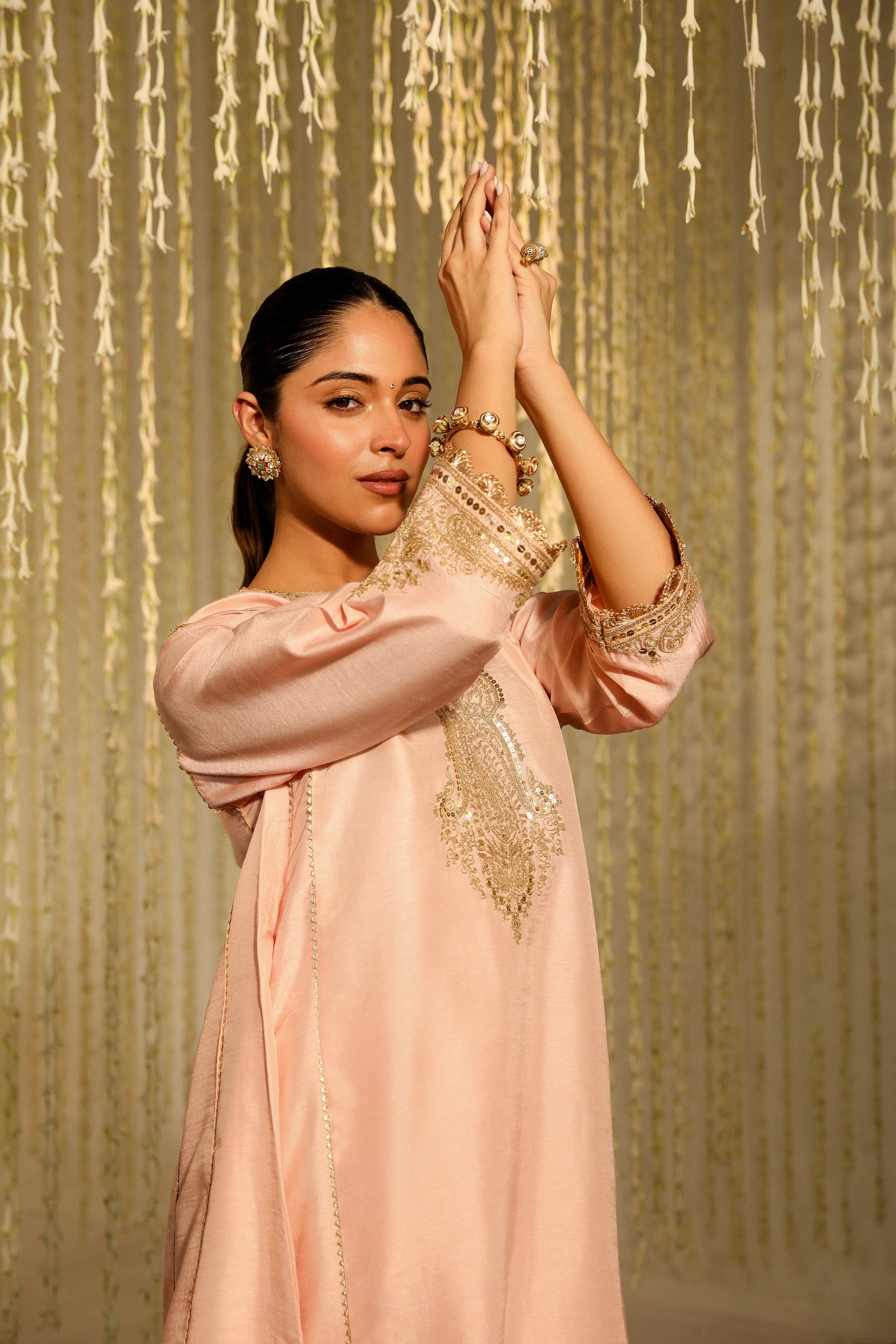 This Mehnaaz ensemble is made in pure silk fabric. The outfit is adorned with kirandori embroidery and sitaara. This ensemble is having a zero neck with slit and three-quarter bell sleeves. The kali is finished with kinari. This outfit comes with a dogri salwar. The whole oufit is finished with a contrast banarsi fabric.