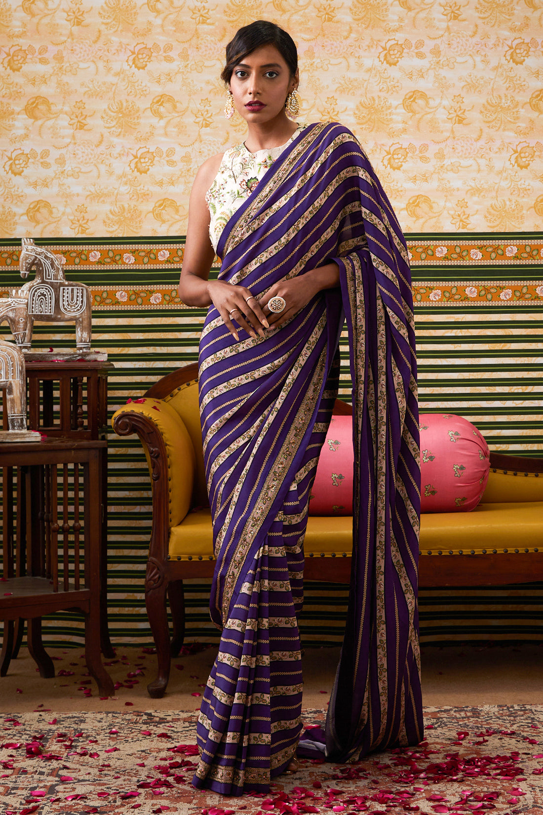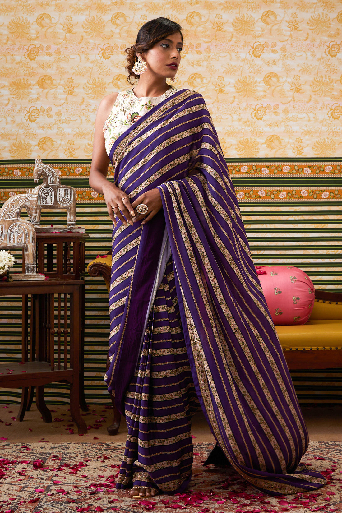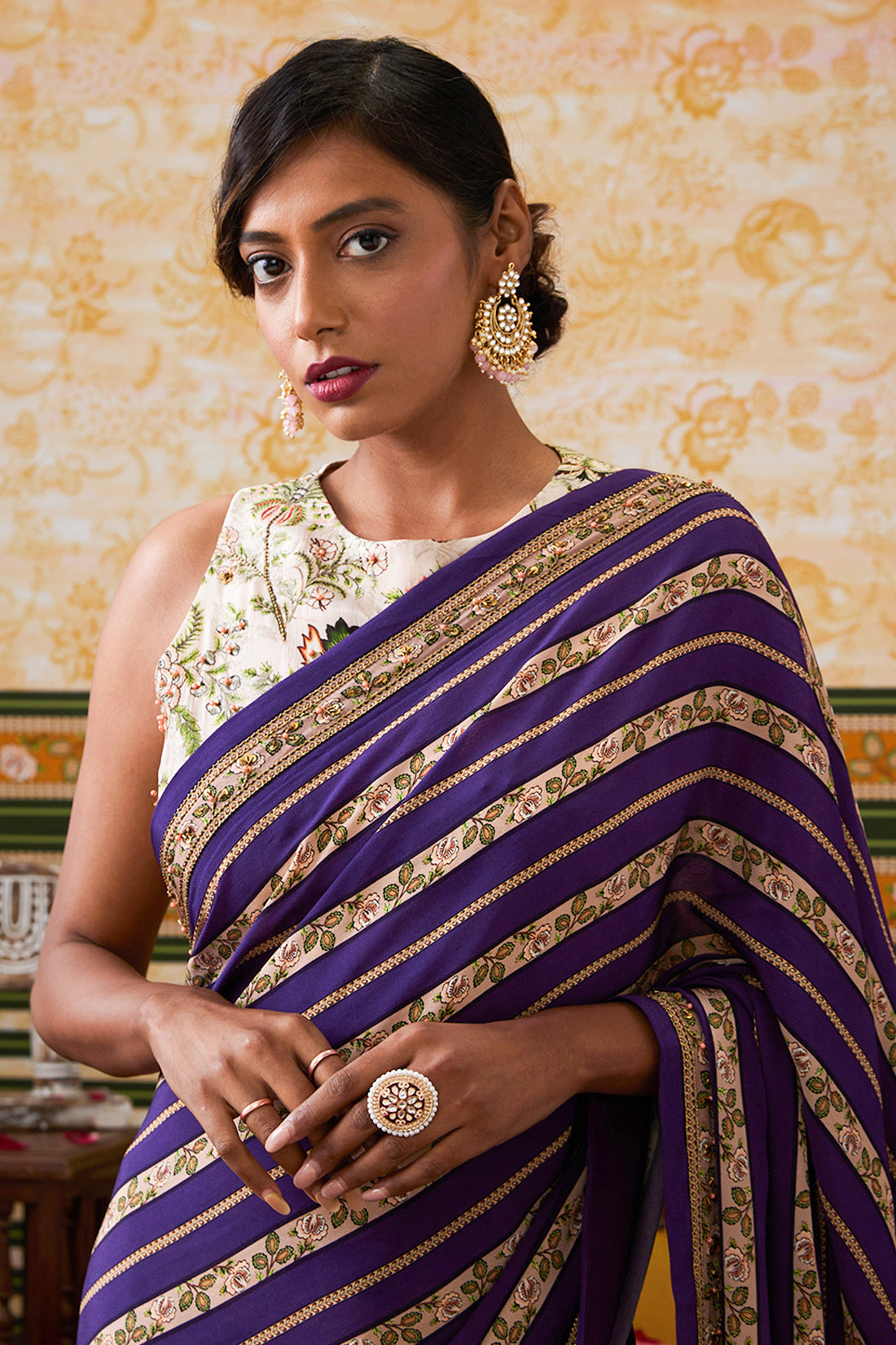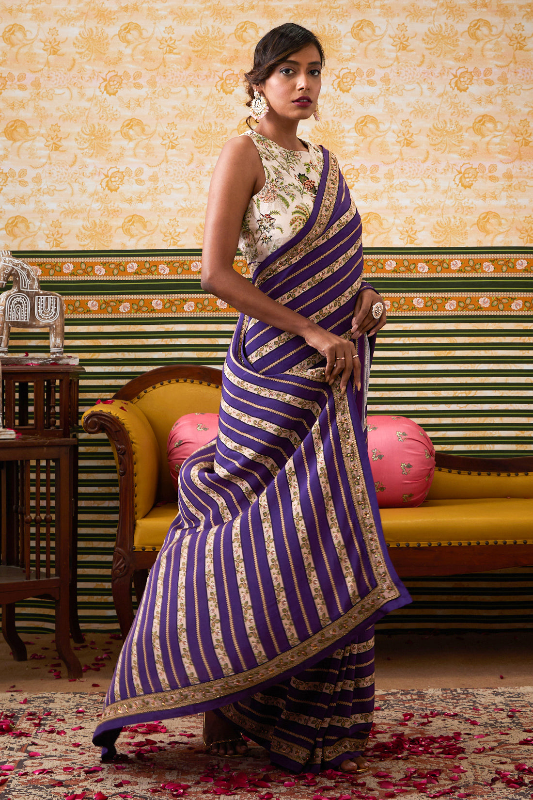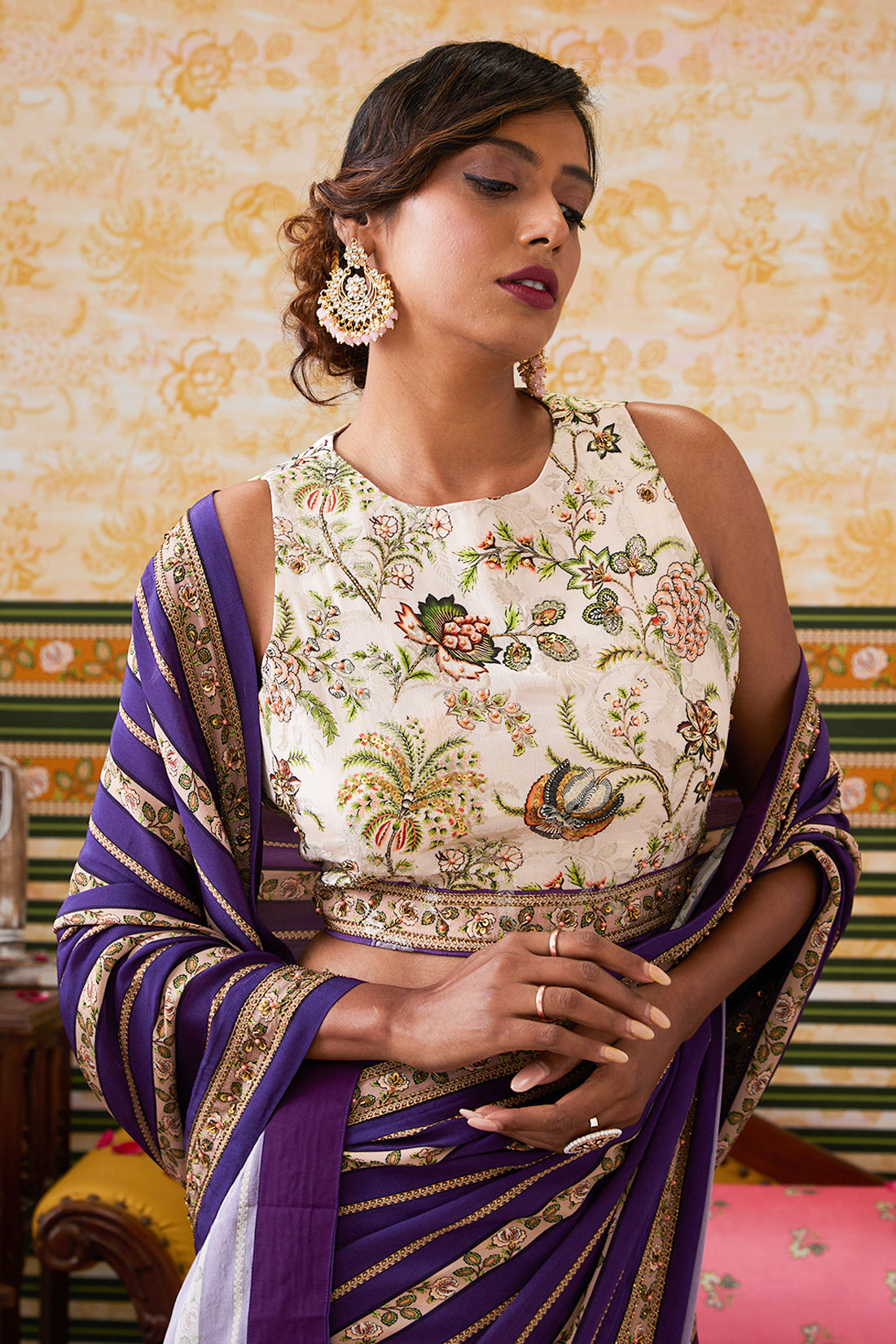 Featuring a Purple & Beige Embroidered Pre-Drapped Saree in crepe fabric. It is paired with an embroidered blouse.