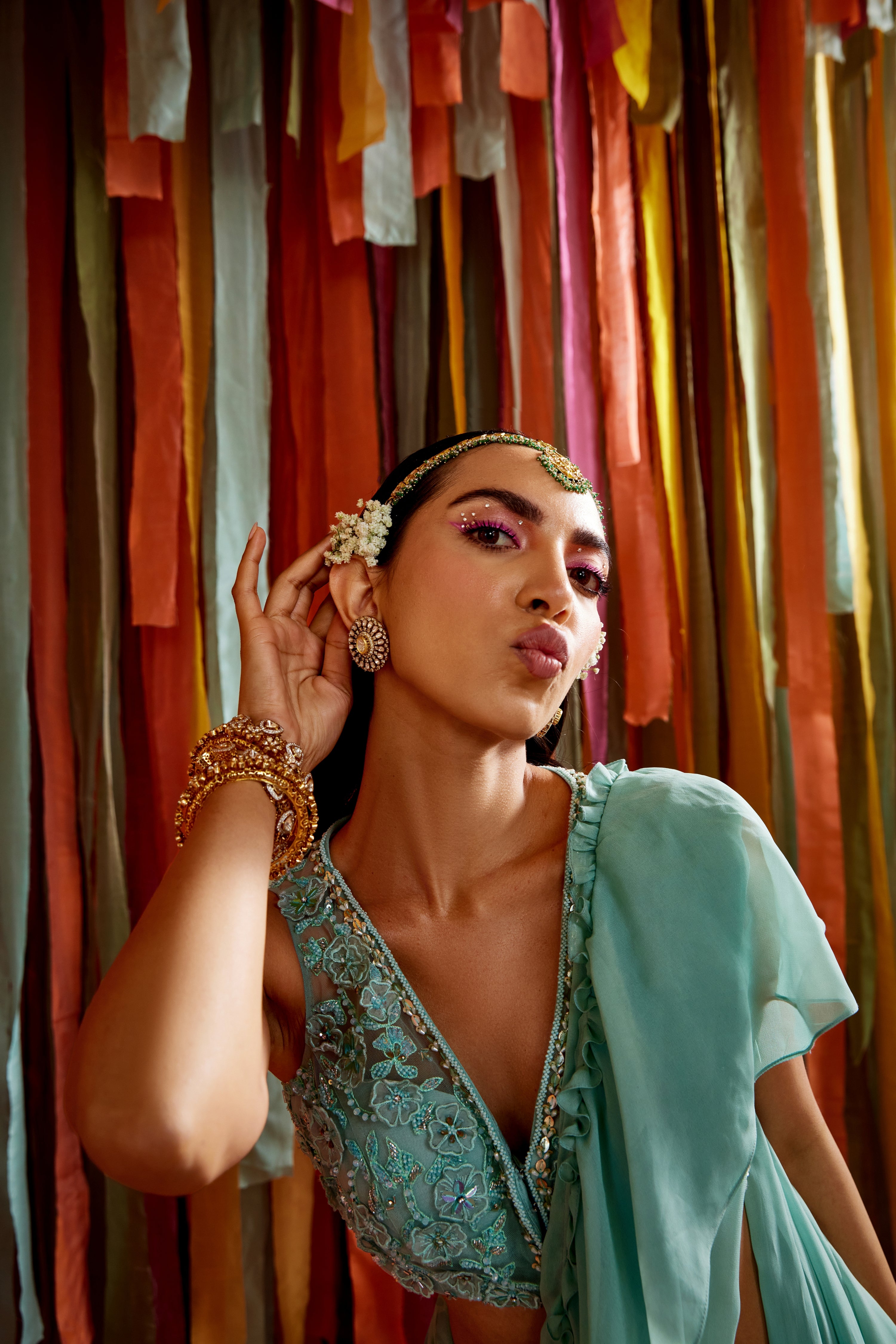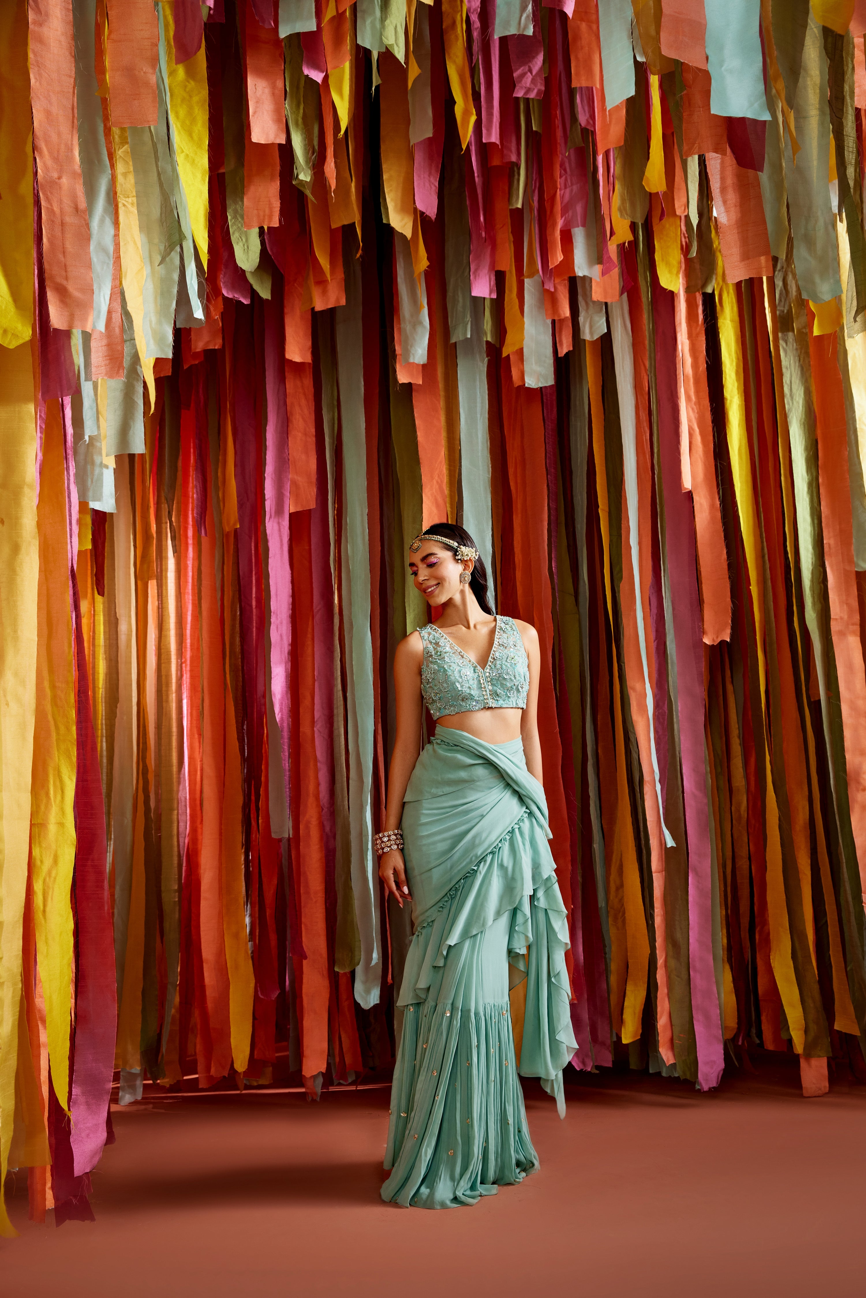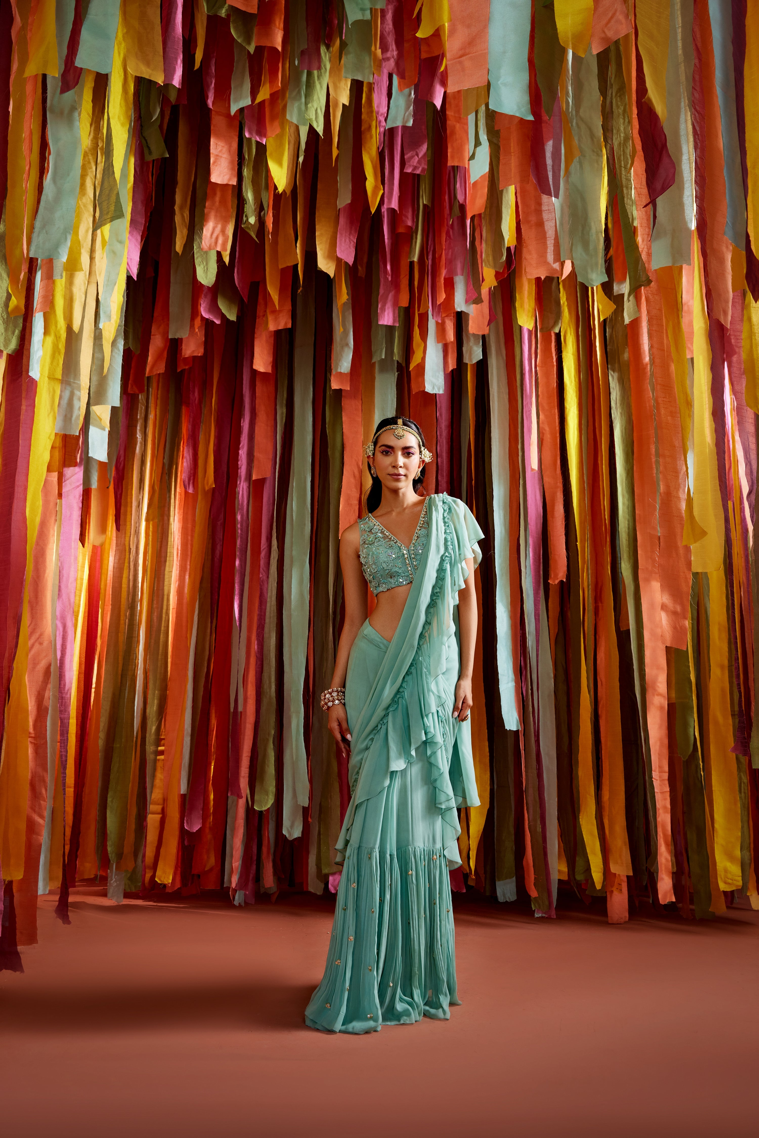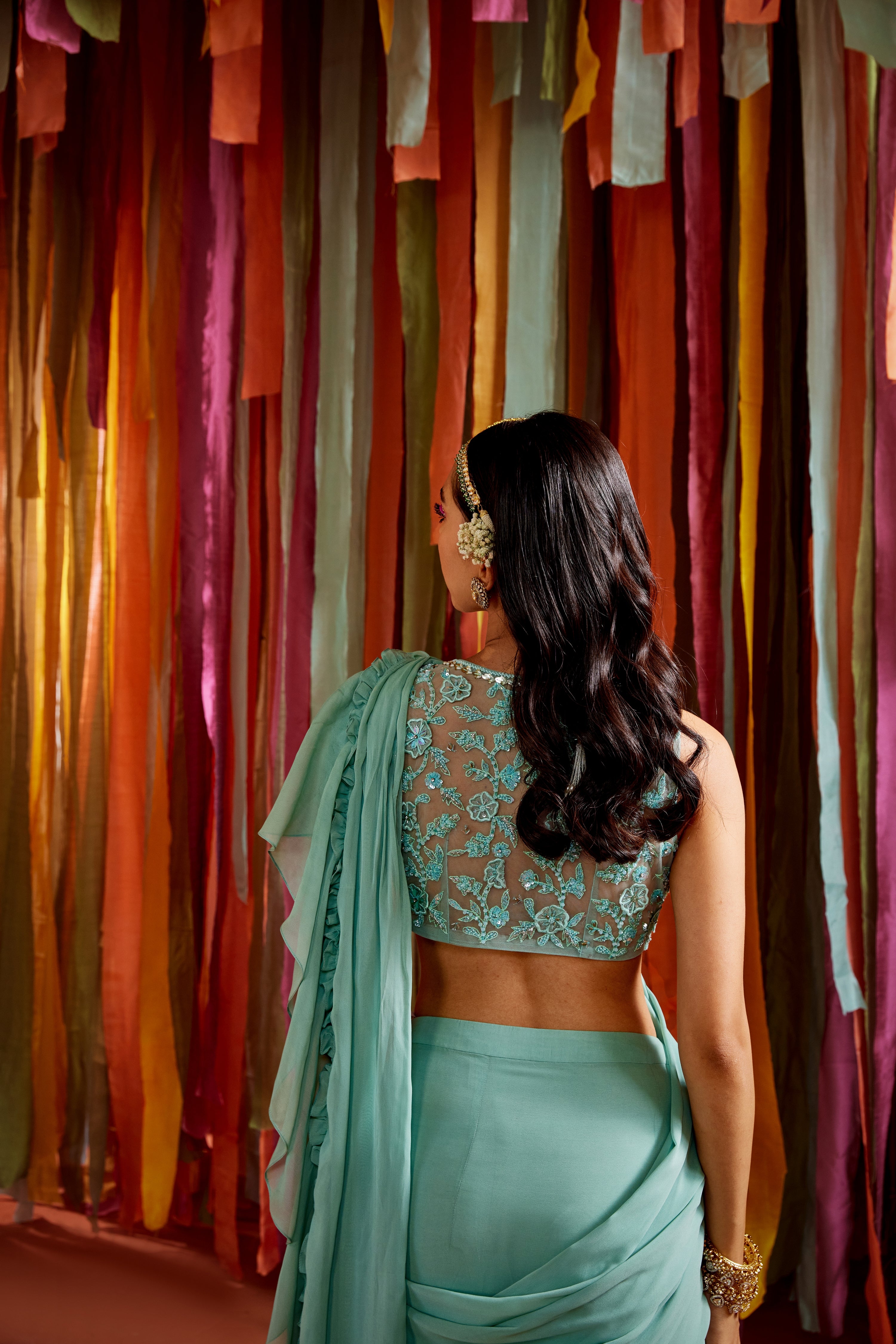 Mint green pre-draped ruffle saree in georgette, it has mini ruffle detailing at the palla, it is paired with a hand embroidered 3D organza flowers blousein net.