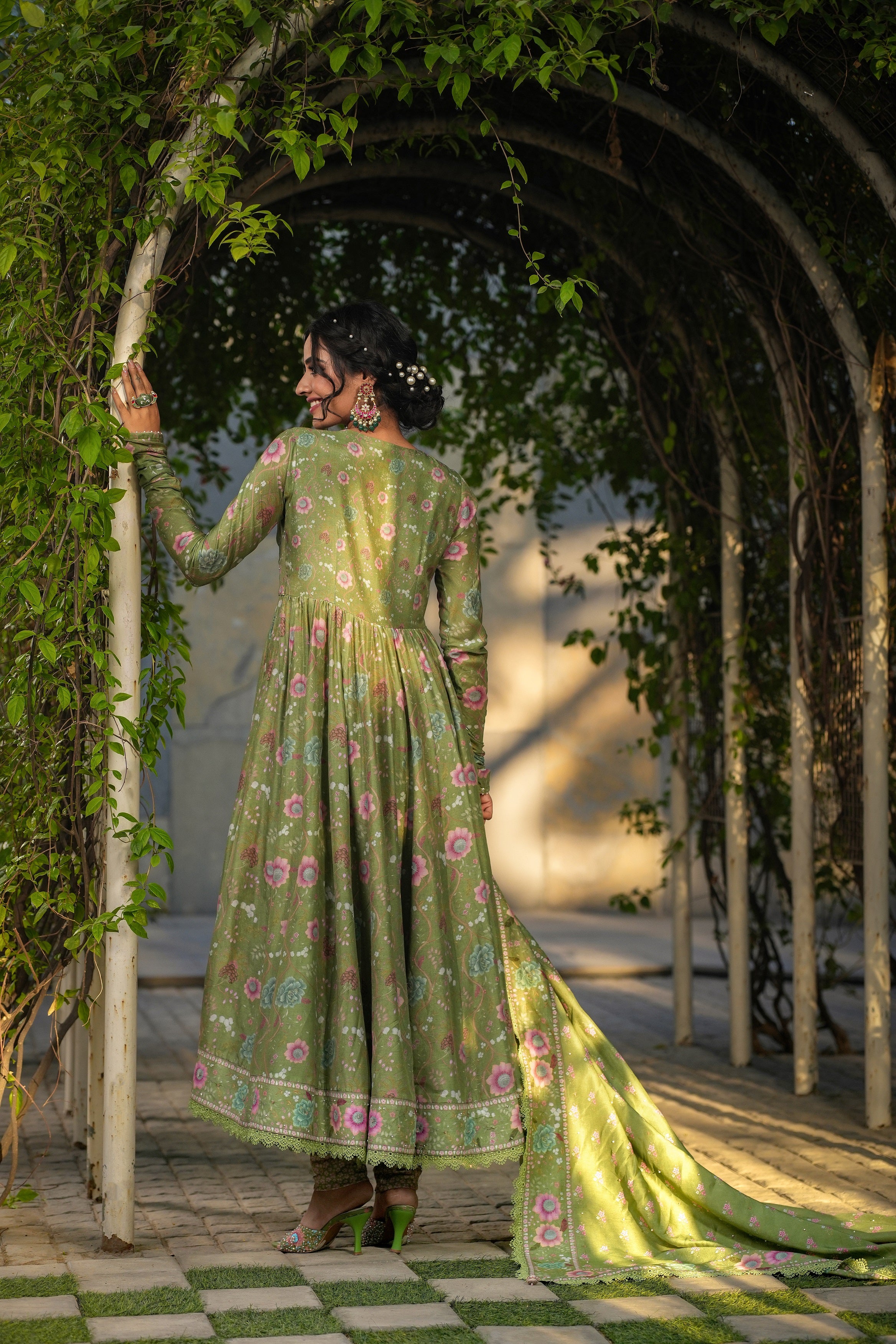 | This 3pc printed kalidar kurta set comes with heavily embroidered neckline and hem line . Also paired with salwar and dupatta carrying embroidery and lacey details |