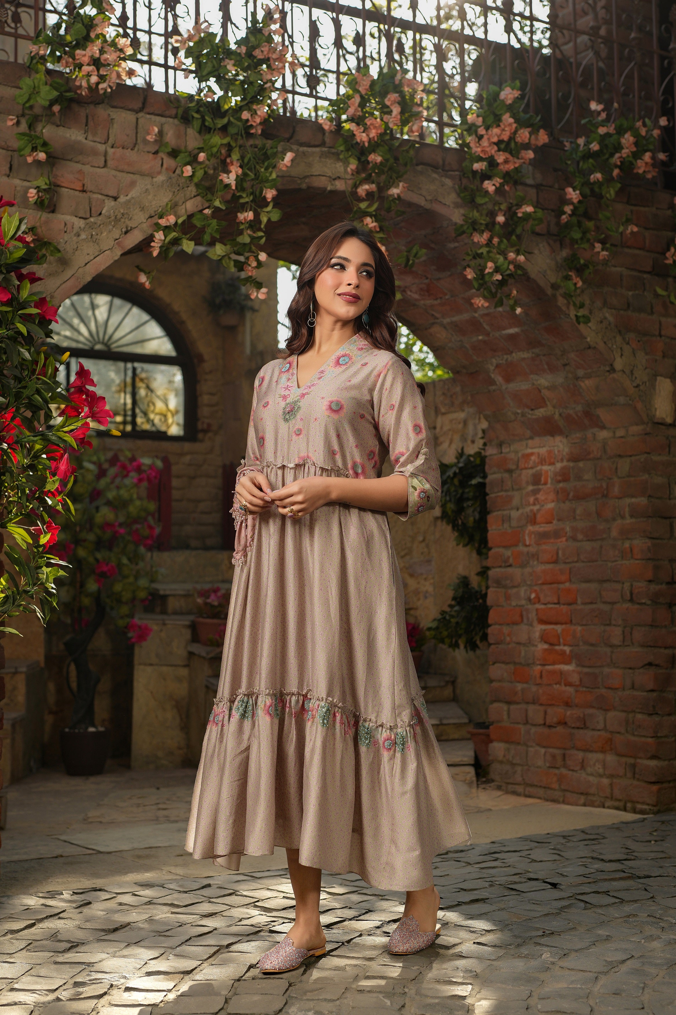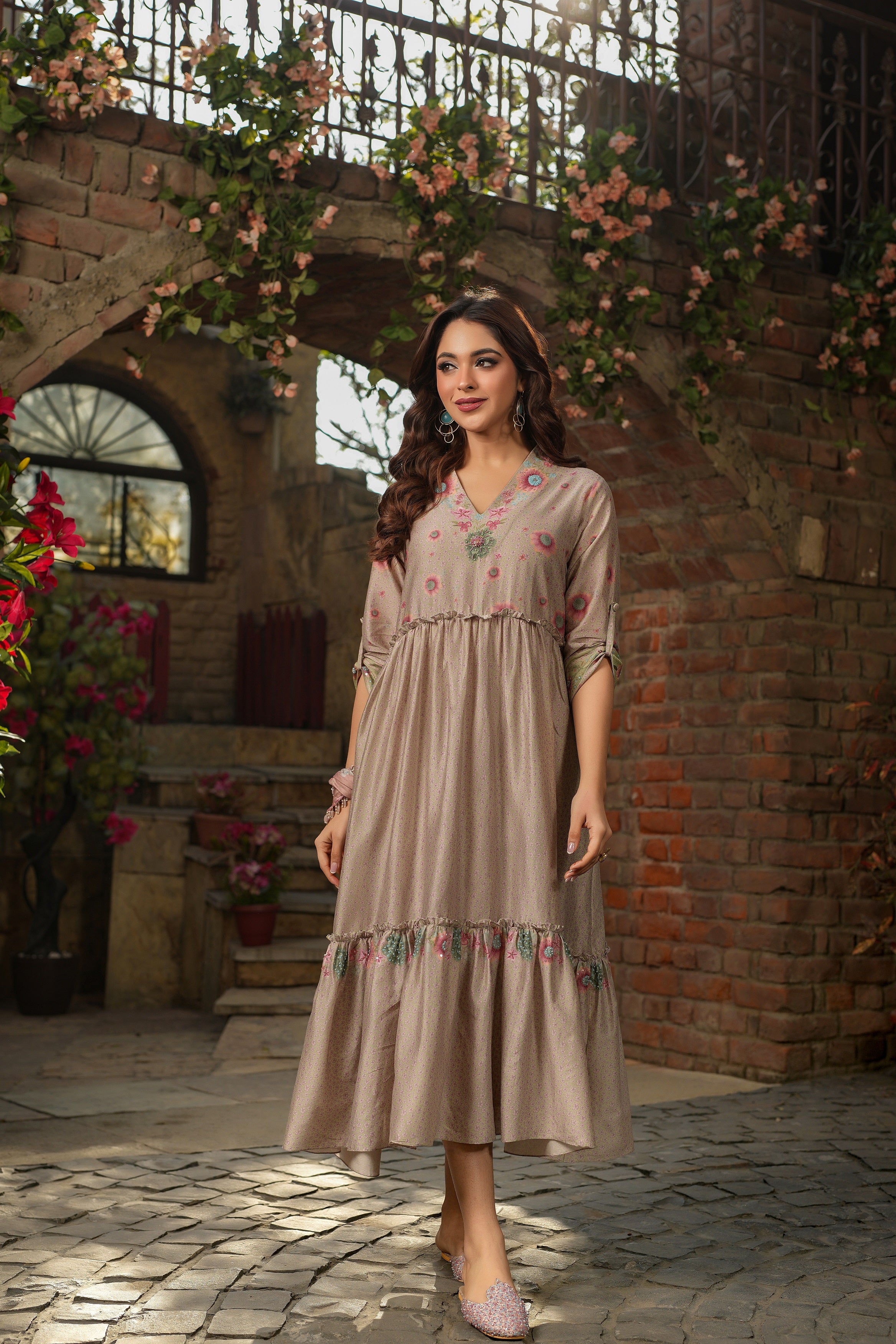 | This 2pc dress comes with printed inner slip and has embroidery around neckline. |