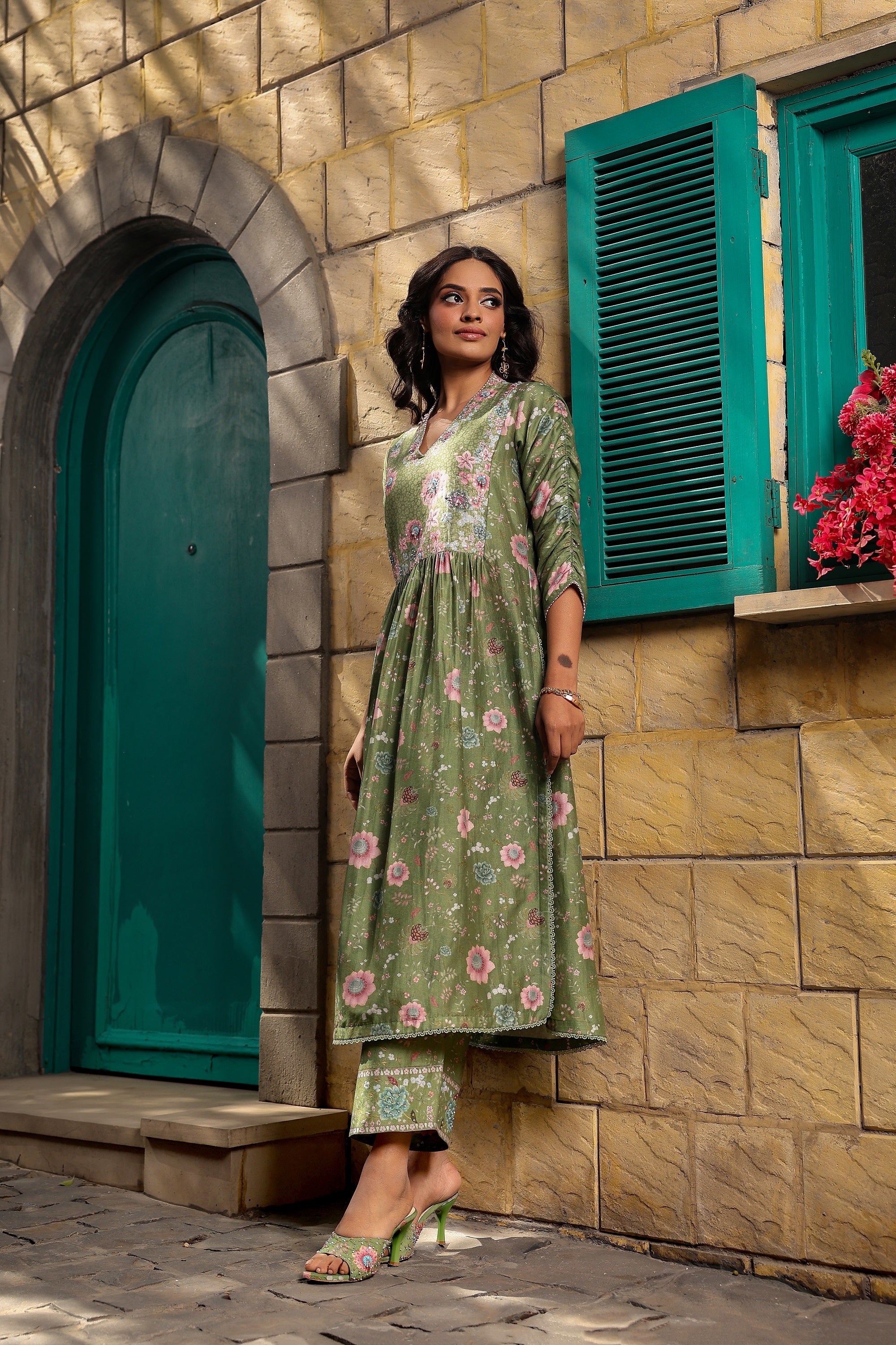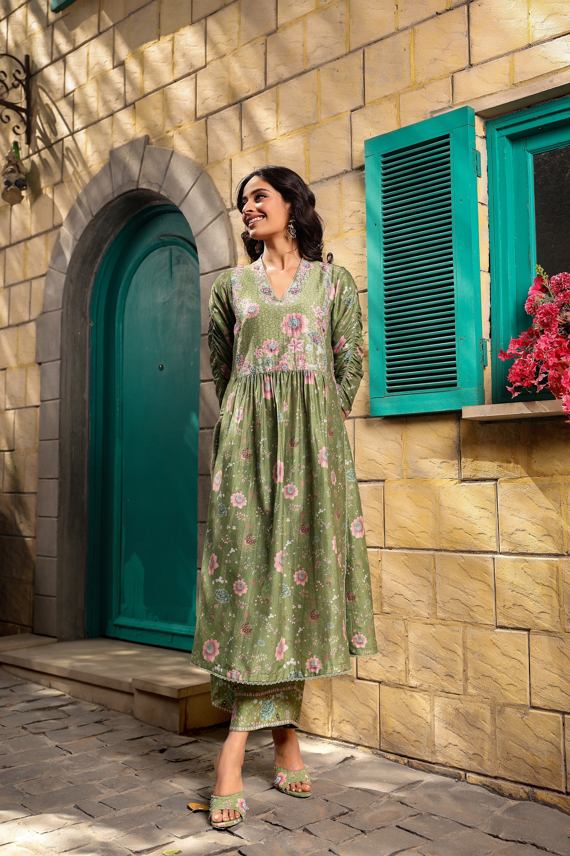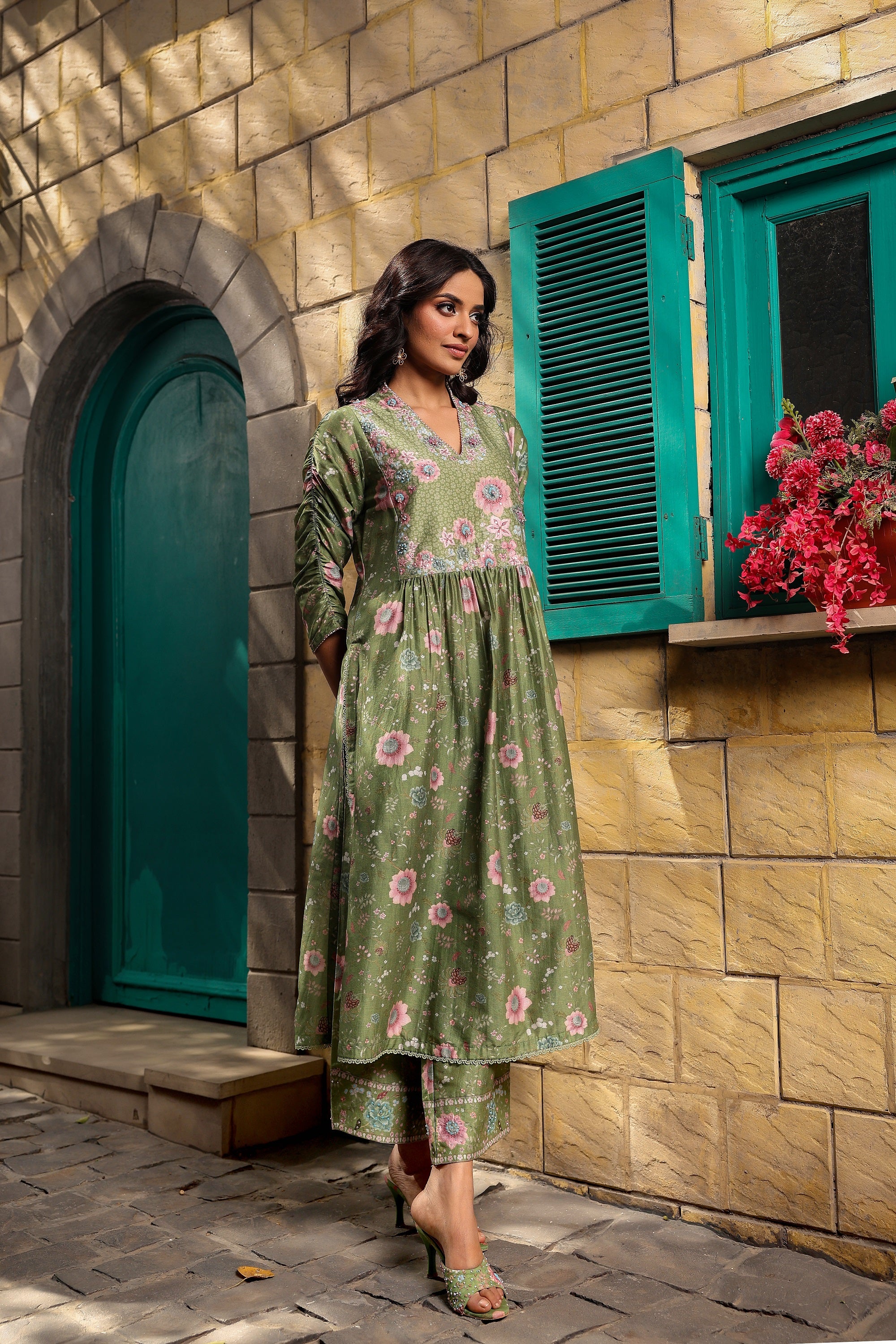 | This 2pc printed frockstyle kurta set comes with embroidery around yoke. |