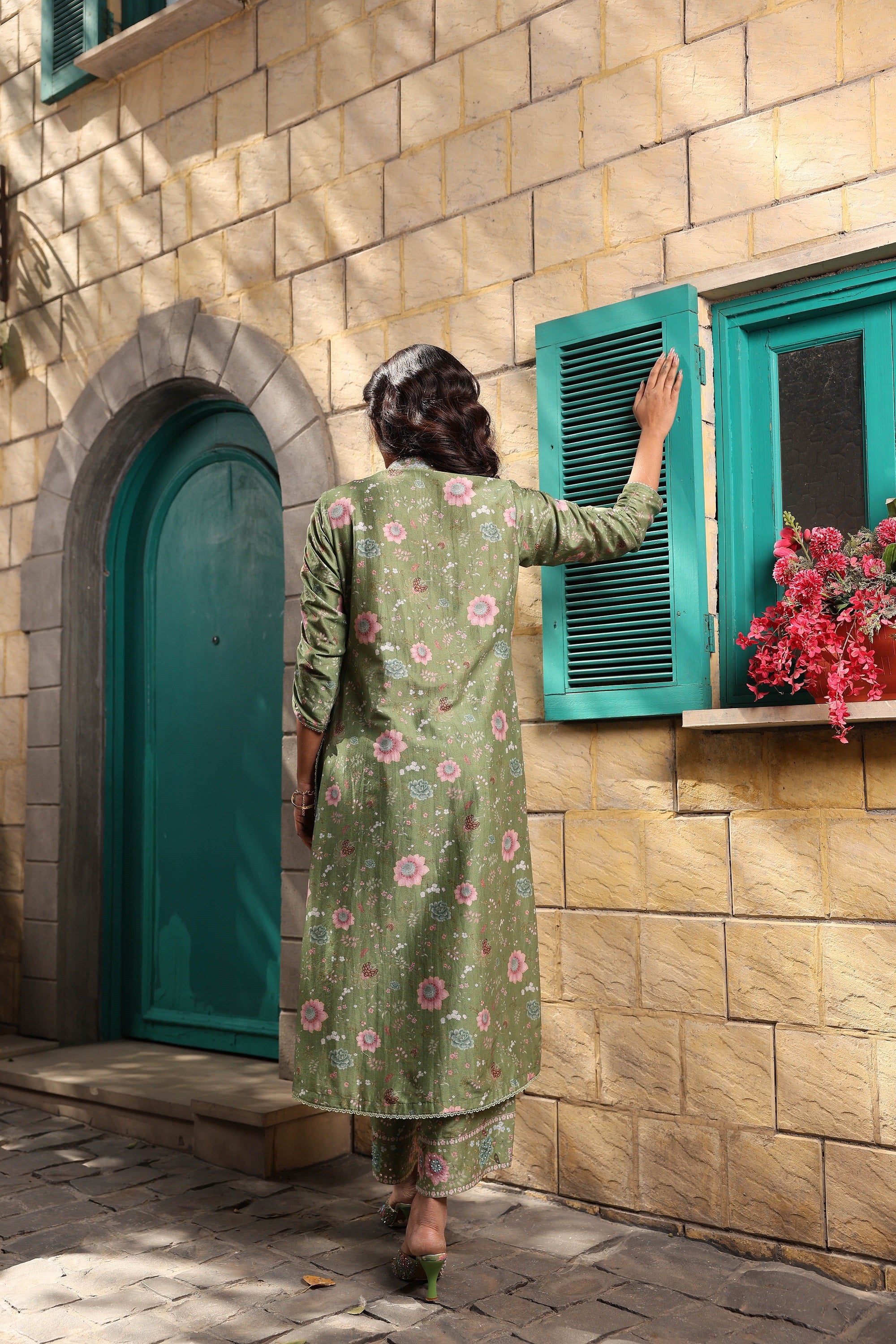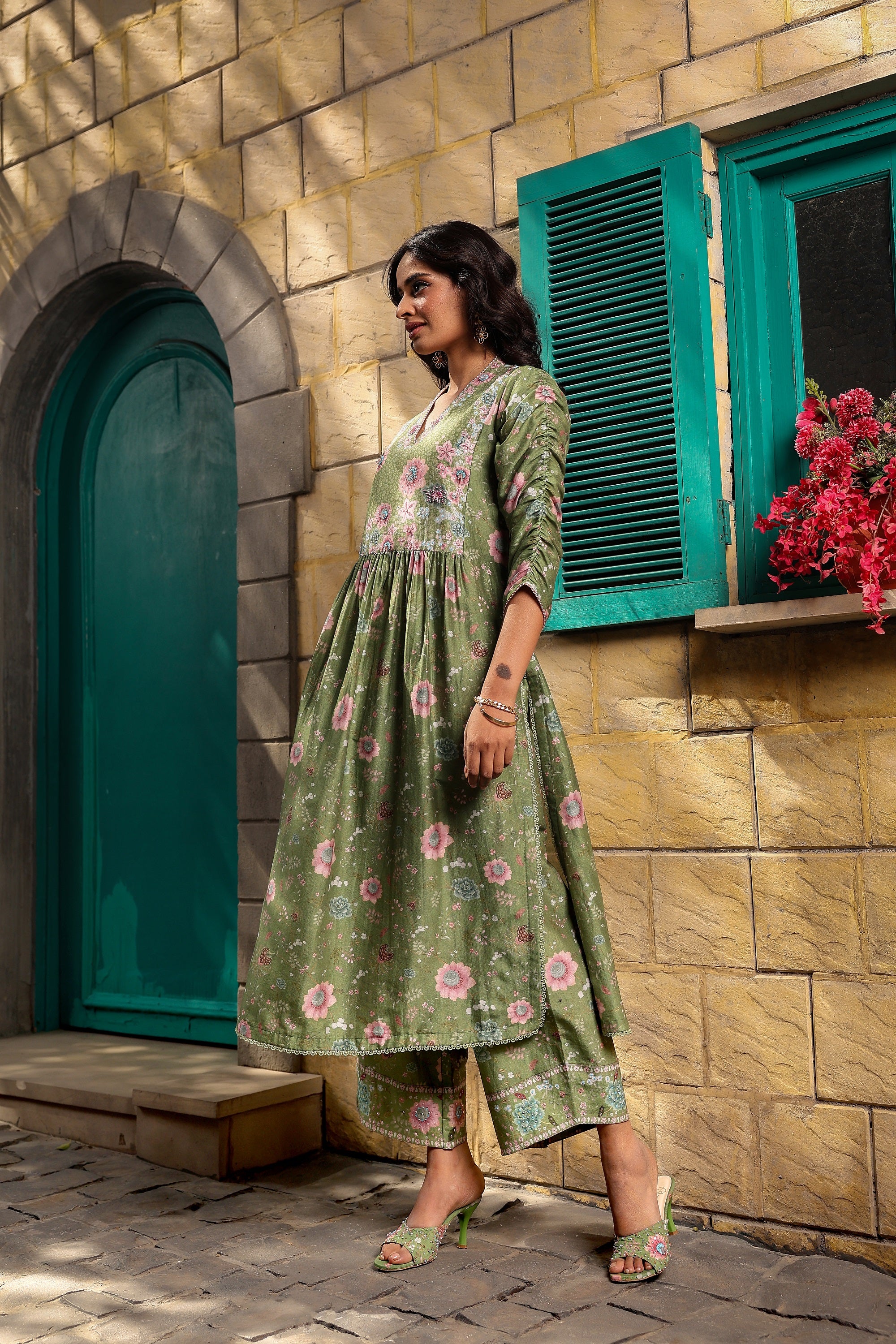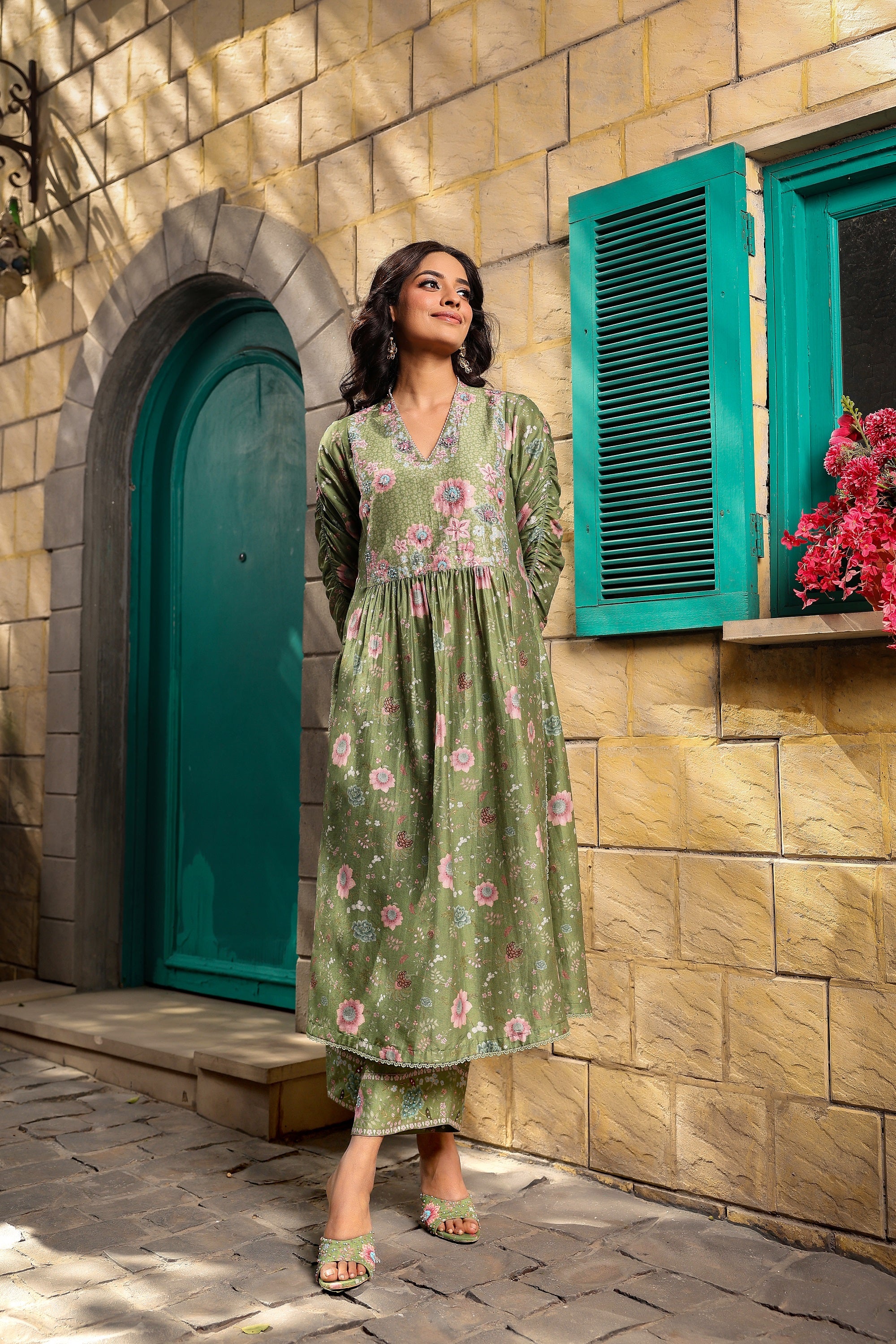 | This 2pc printed frockstyle kurta set comes with embroidery around yoke. |