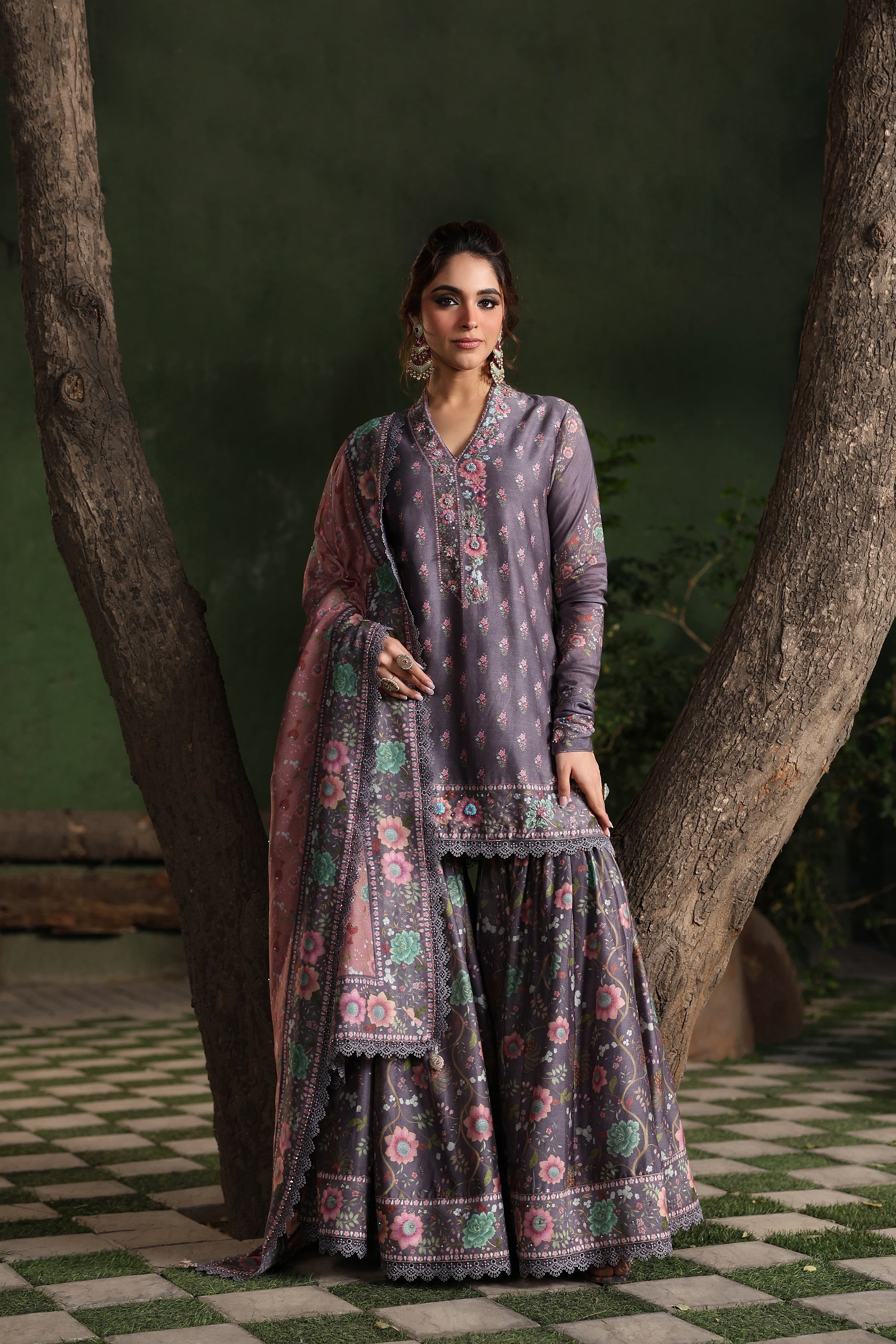 Opt for accessories that complement the embellishments and colors of your sharara set. Statement earrings, a maang tikka, or a bold necklace can elevate your look without overpowering it