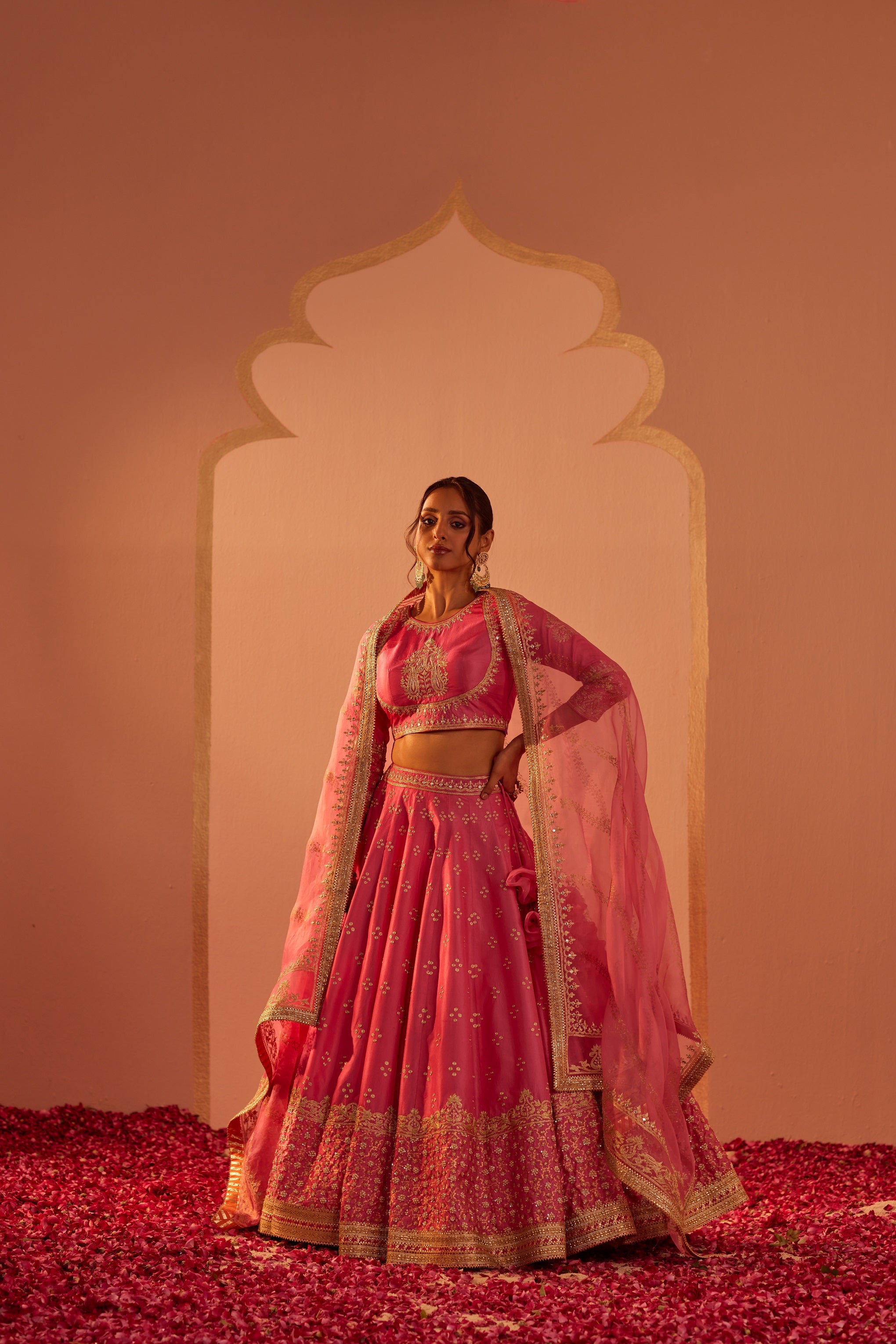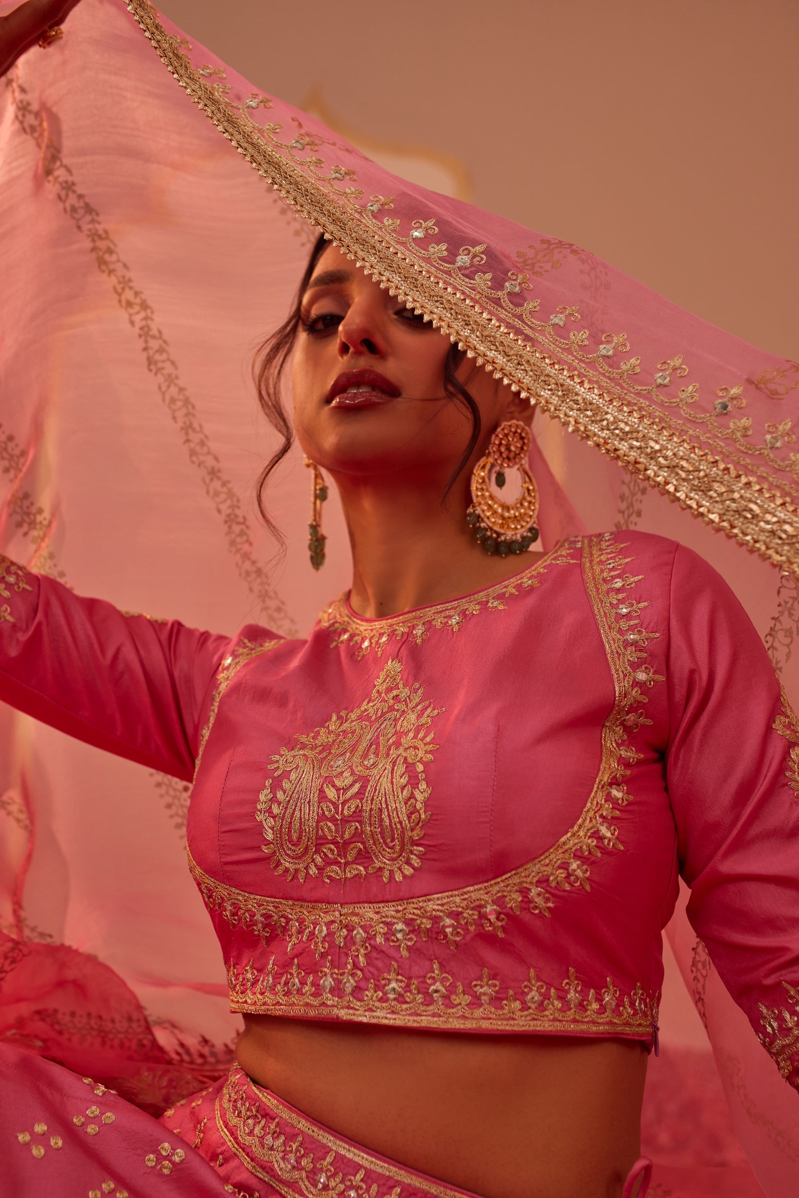 | This ensemble is made in pure silk. The blouse has a zero neck at the front, back with three-quarter sleeves. The lehenga has a broad border and delicate bootis. The outfit is adorned with a signature block print which is highlighted with tilla and patra embroidery. It is finished with a pure benarsi fabric with fine gota detailing. |