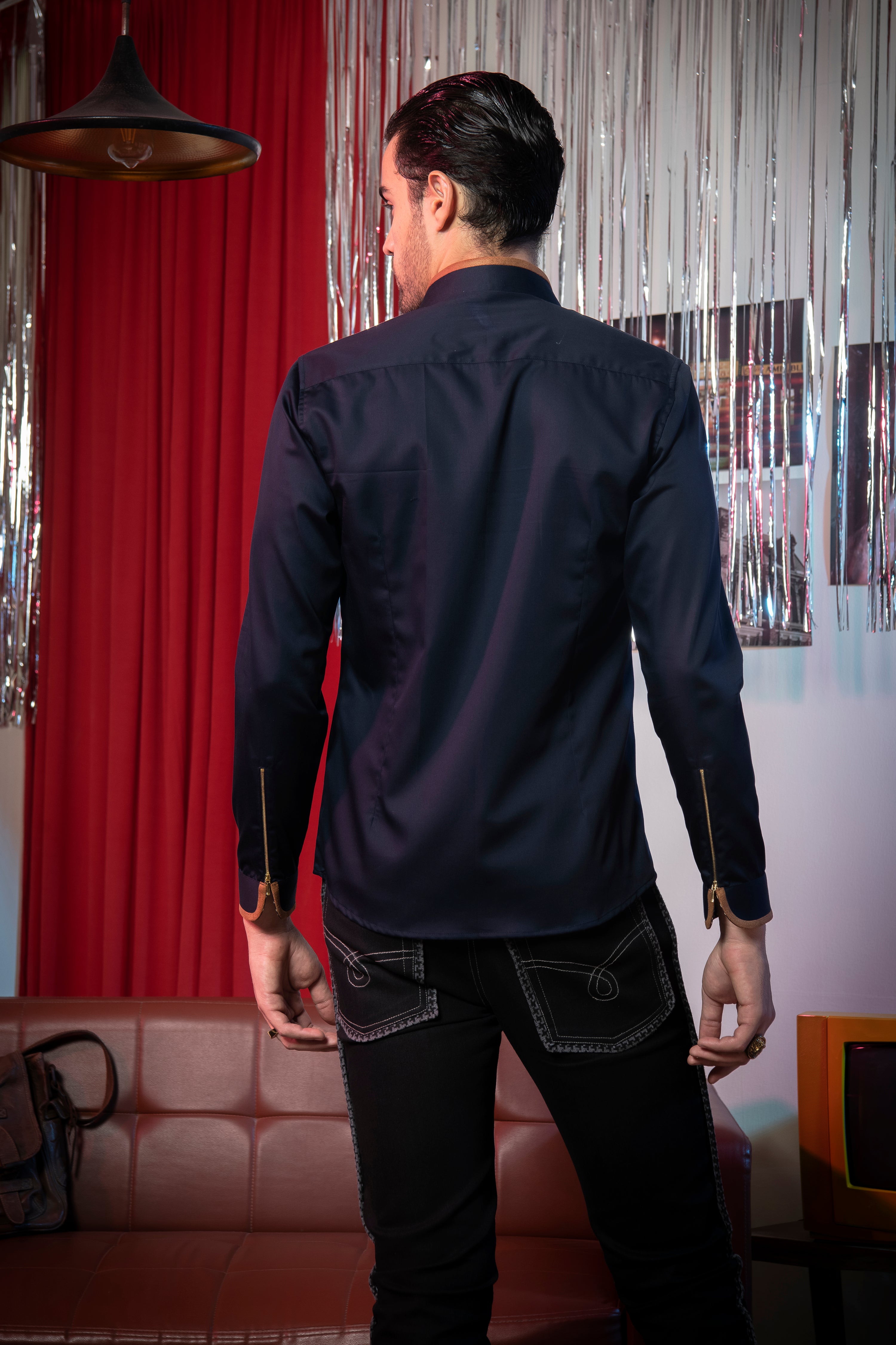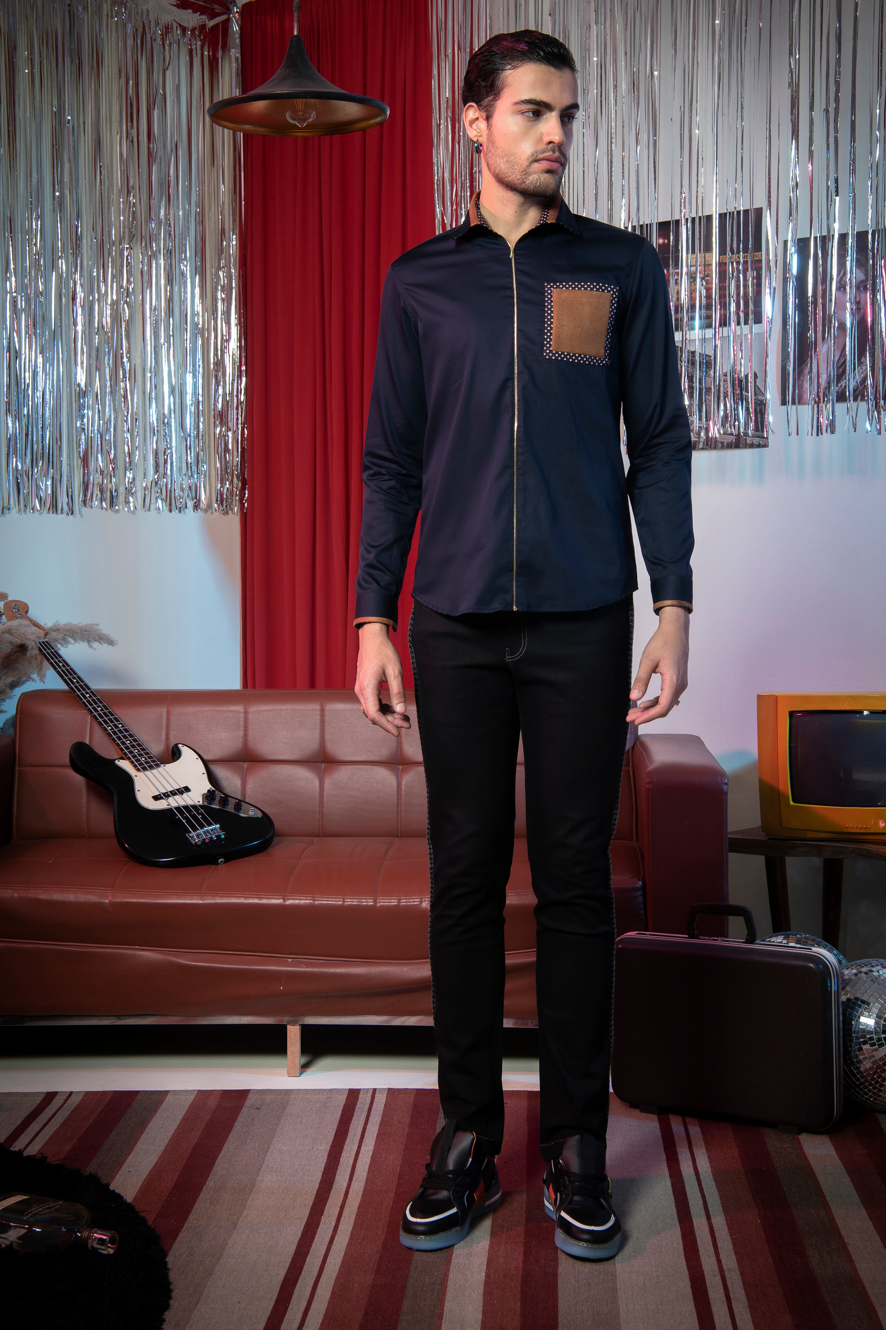 Featuring a navy blue shirt in cotton base with print and a suede pocket. Note: The pants in the image are for styling purposes only.