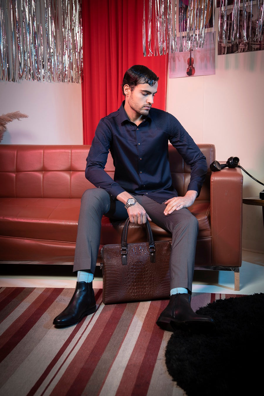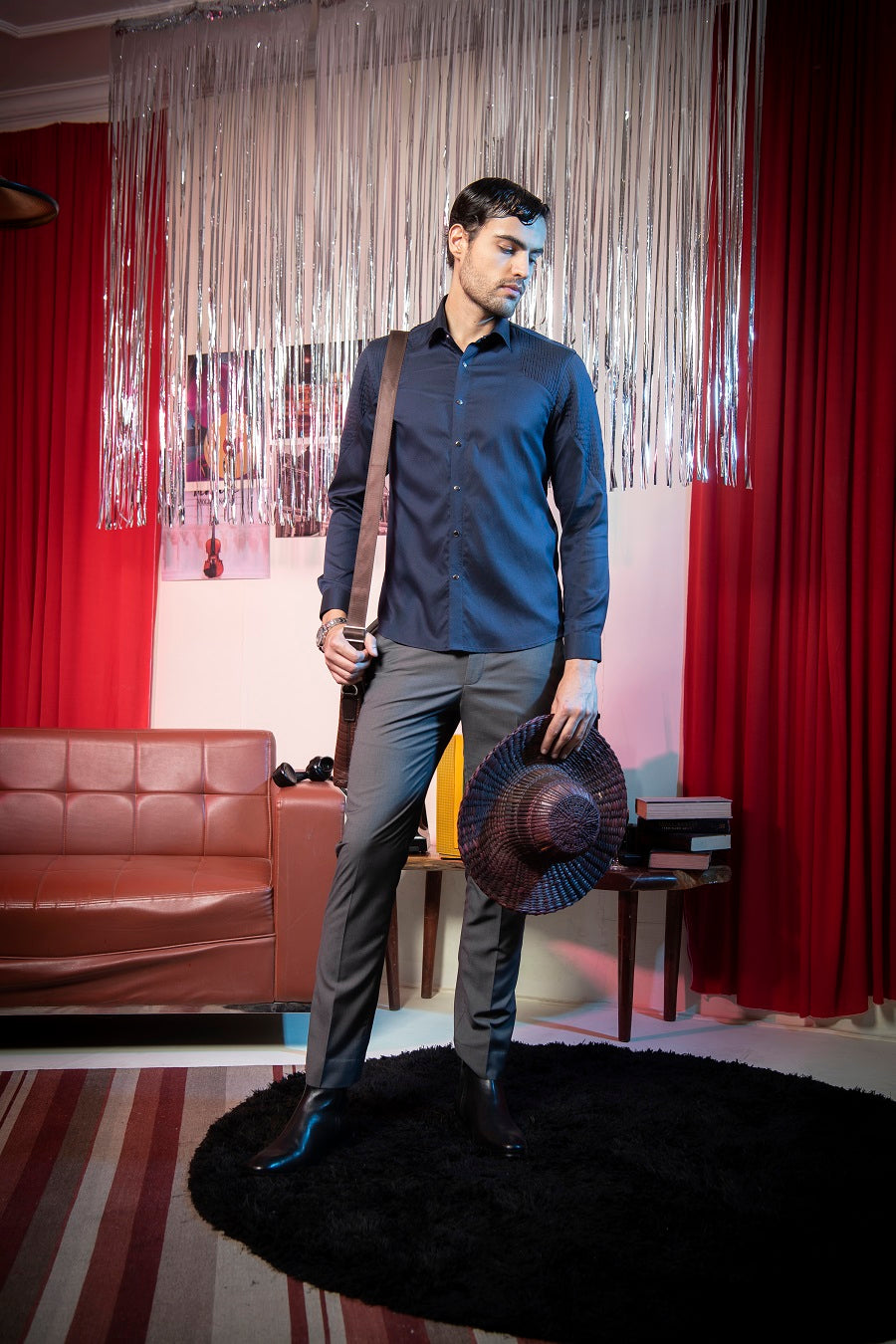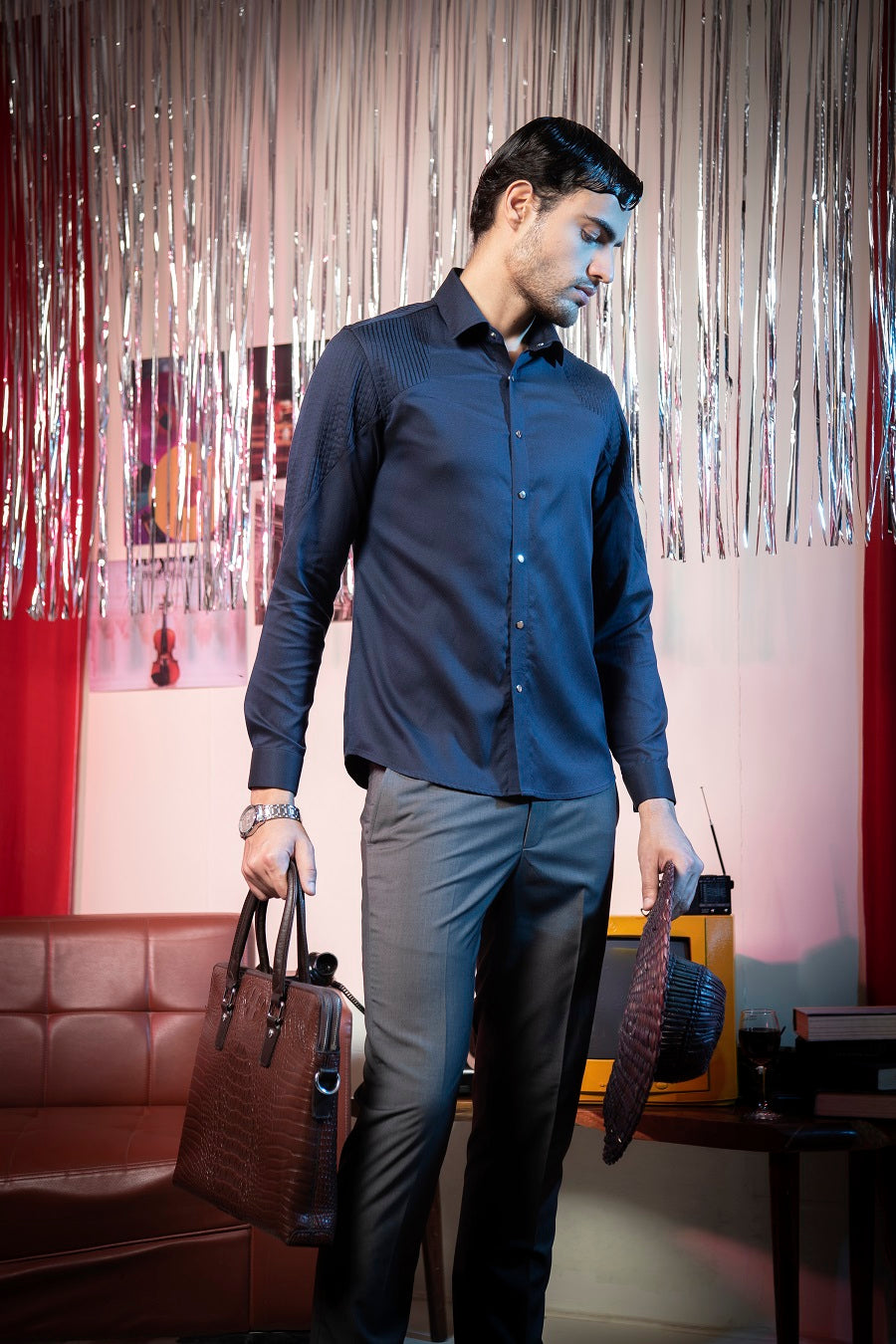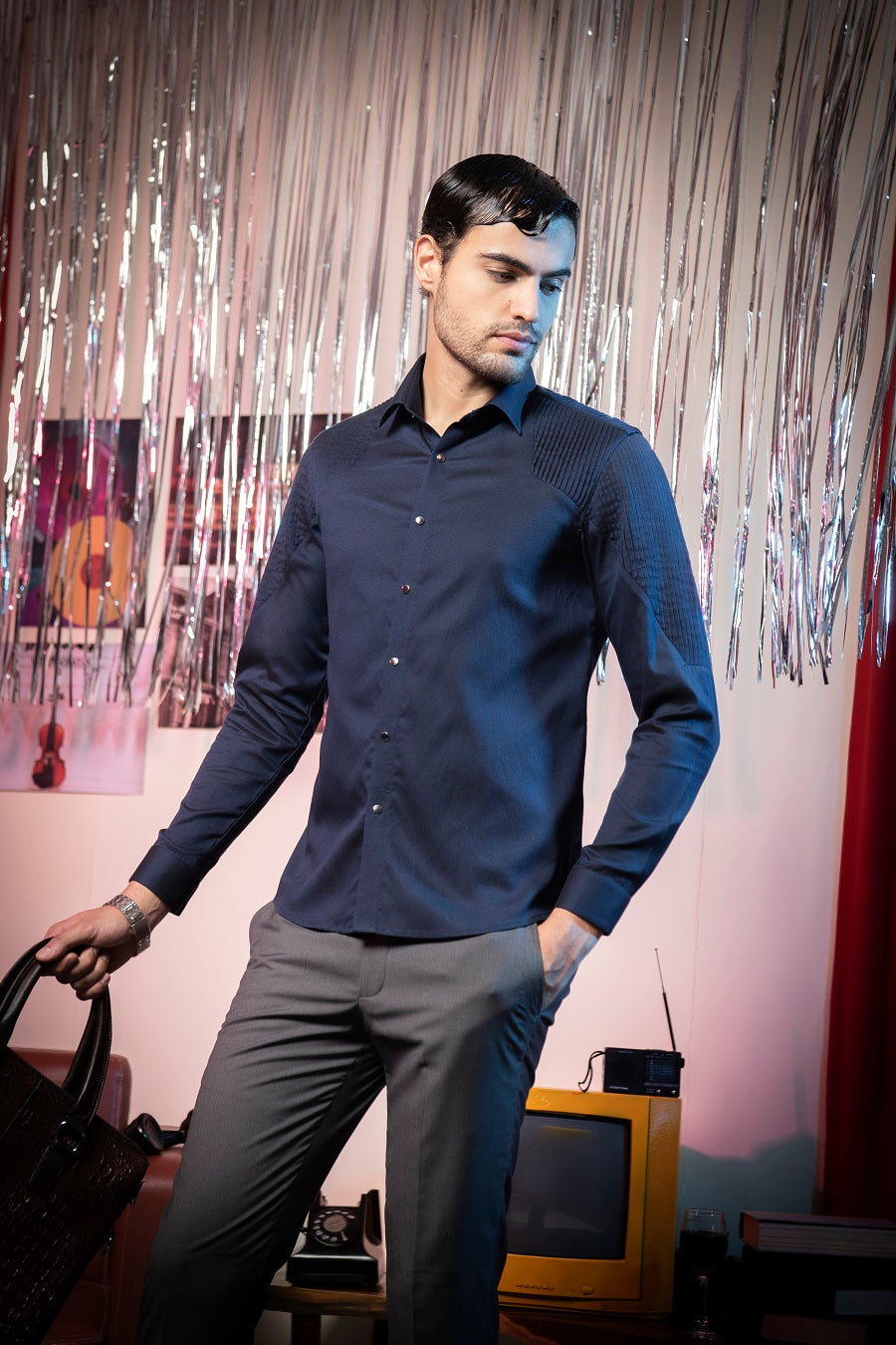 Featuring a navy blue shirt in cotton base with pleats, French seam, and cuffs detailing.