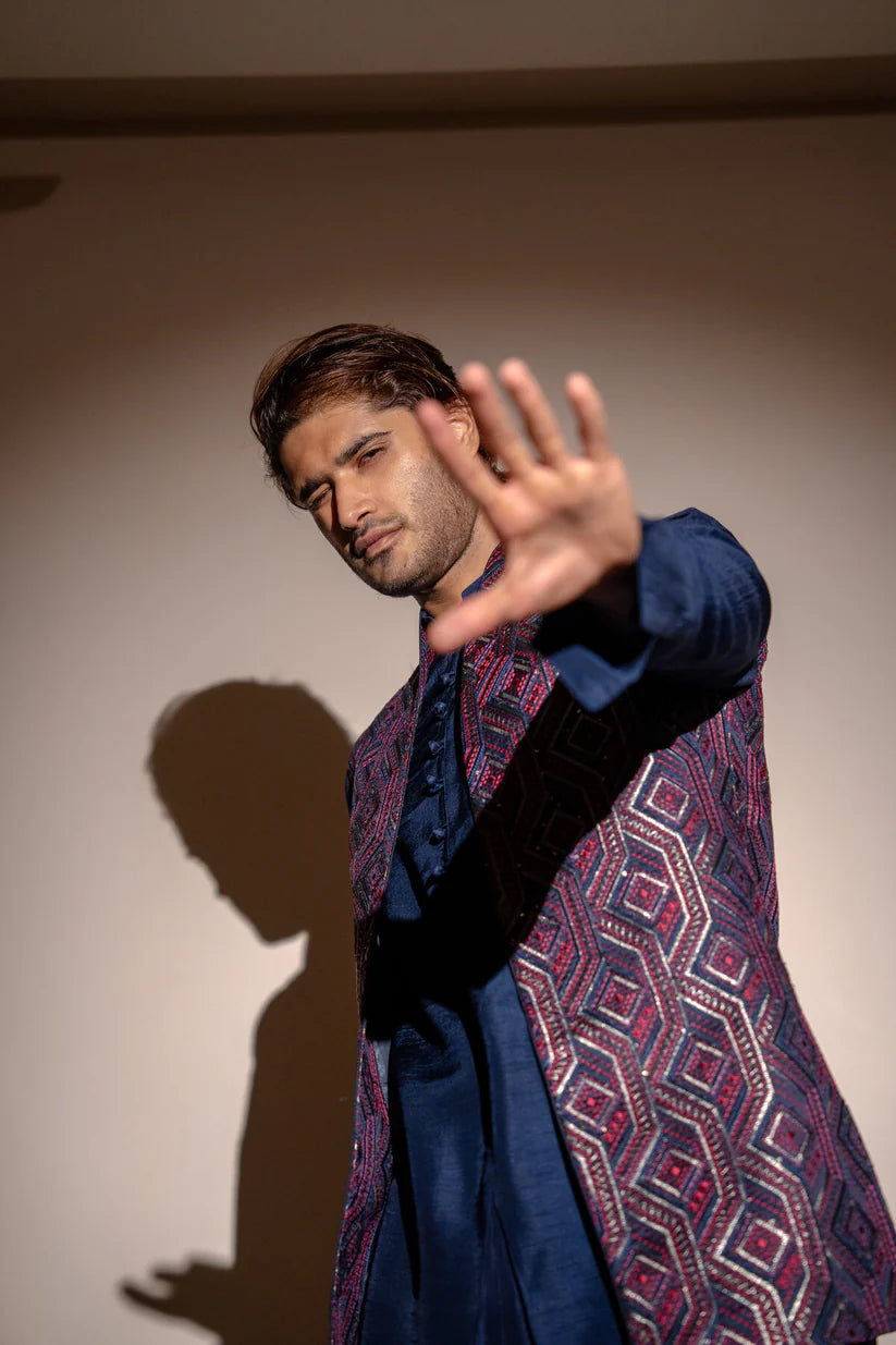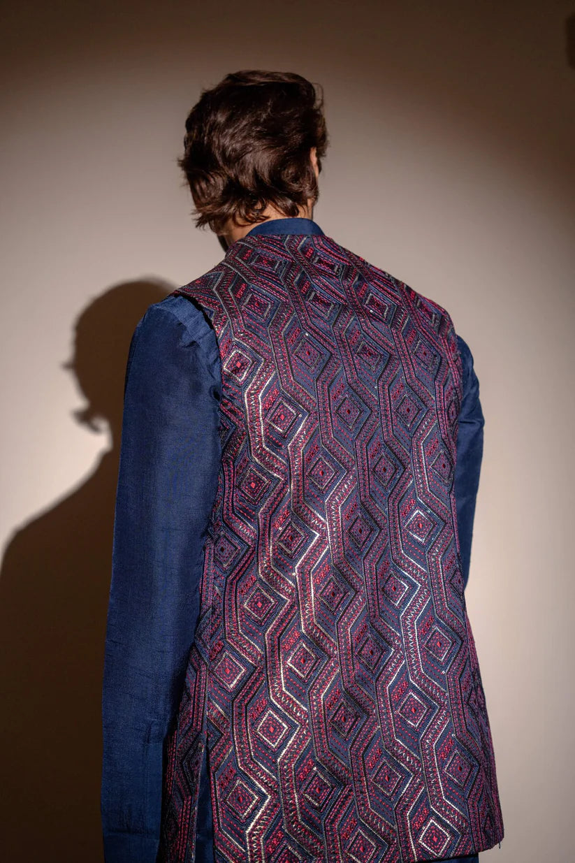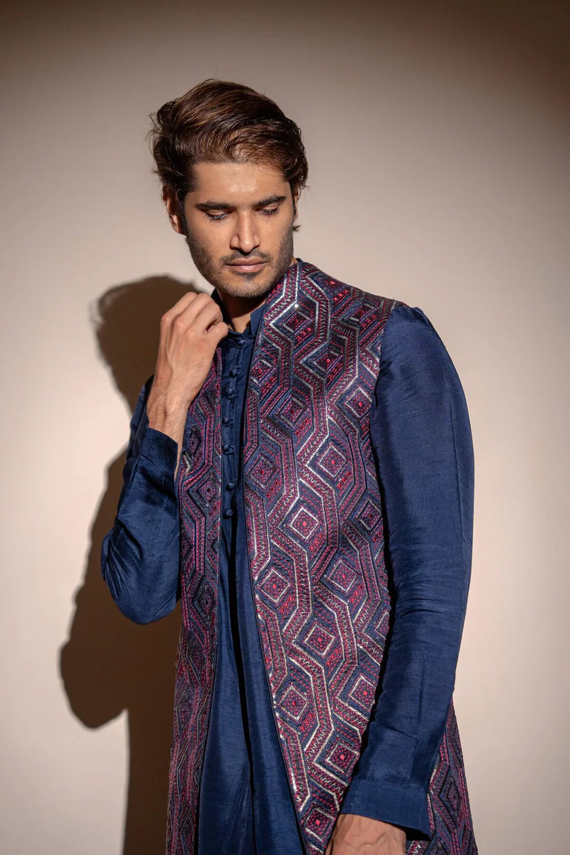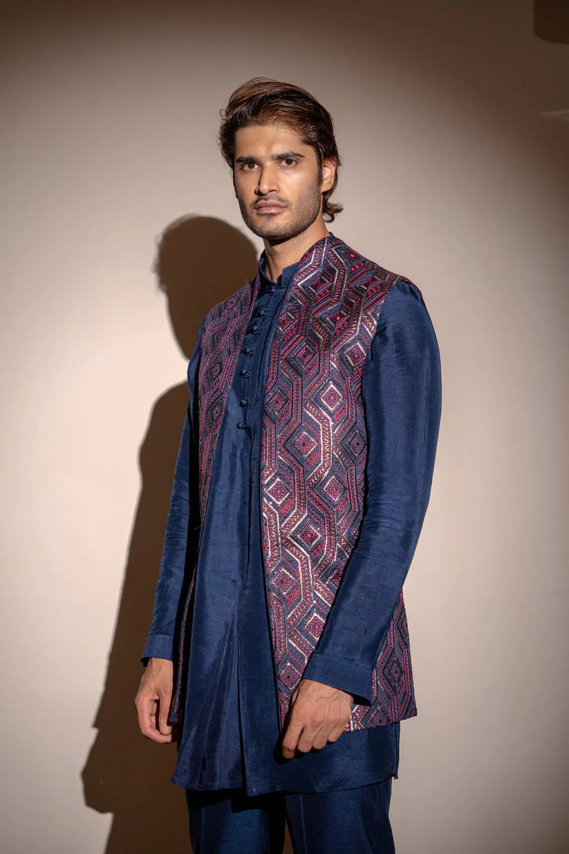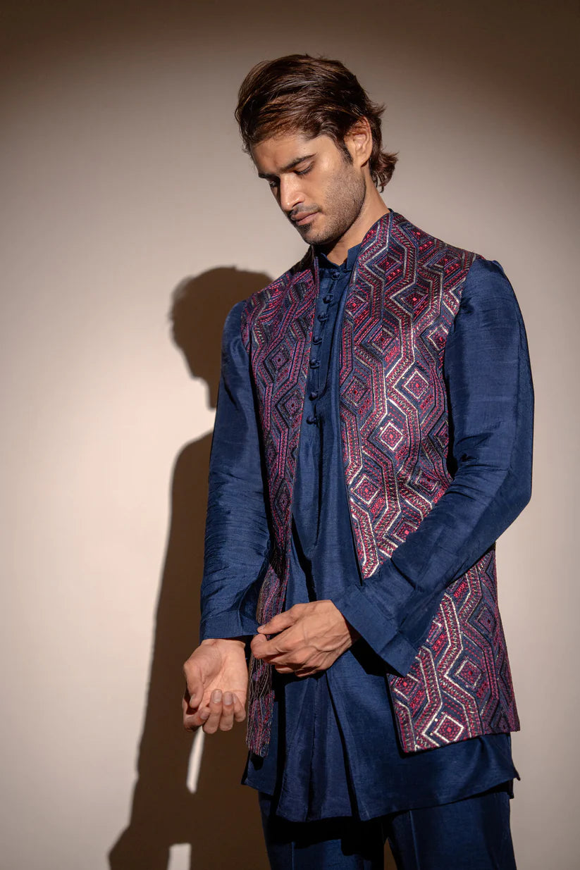 Navy blue cotton silk kurta with embroidered jacket