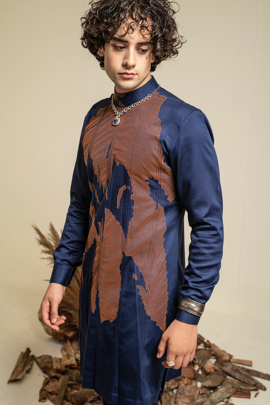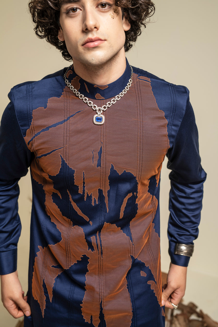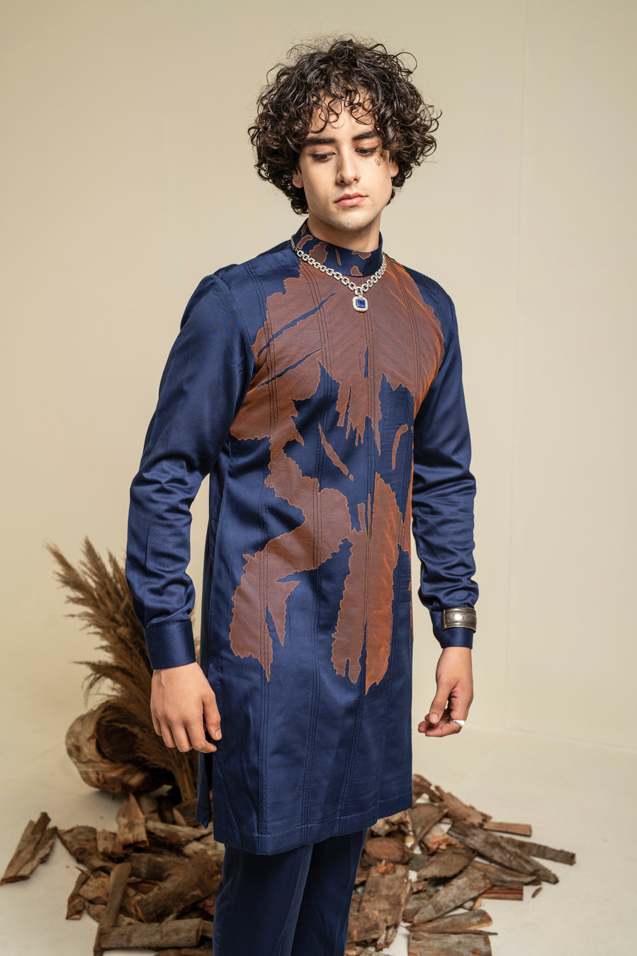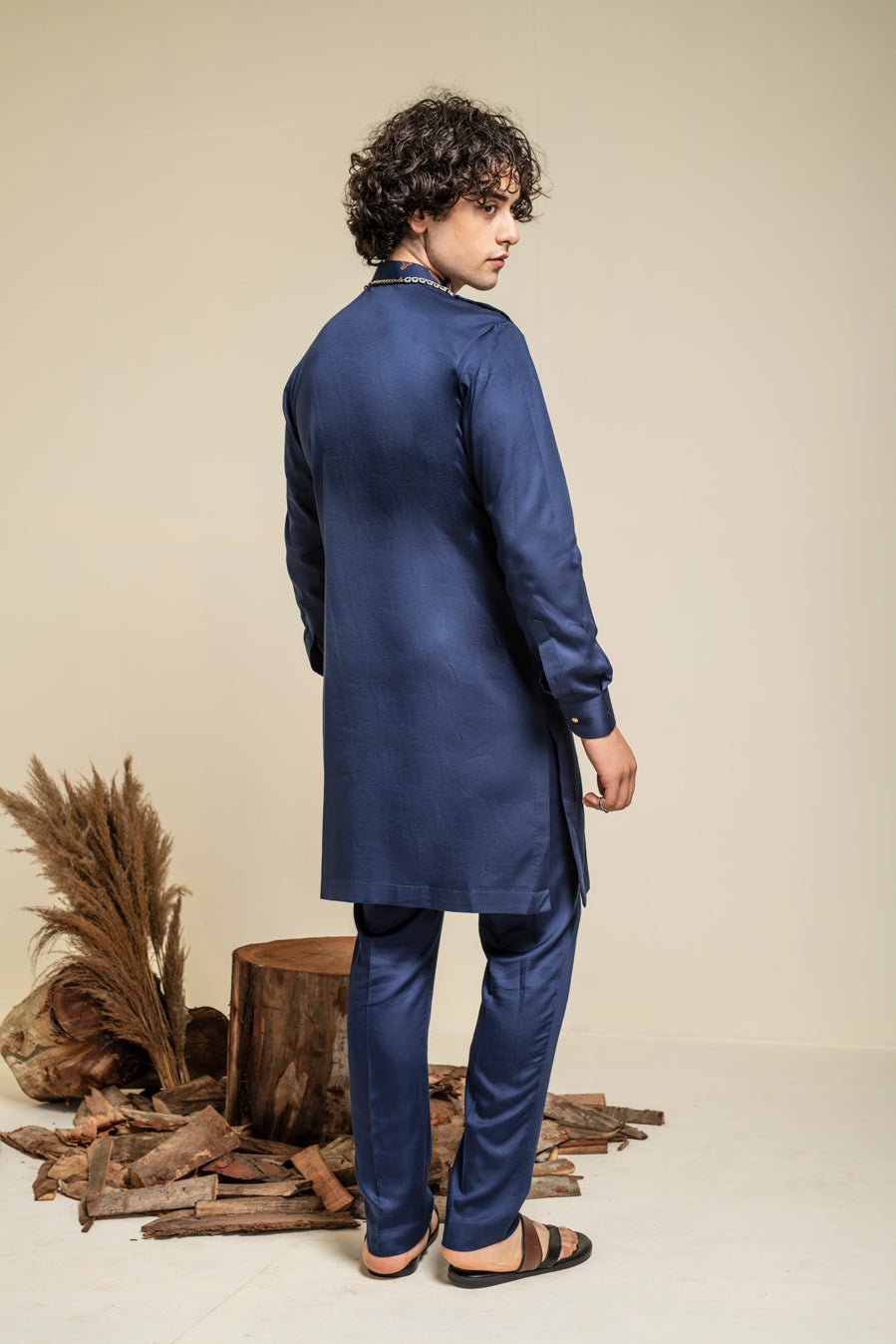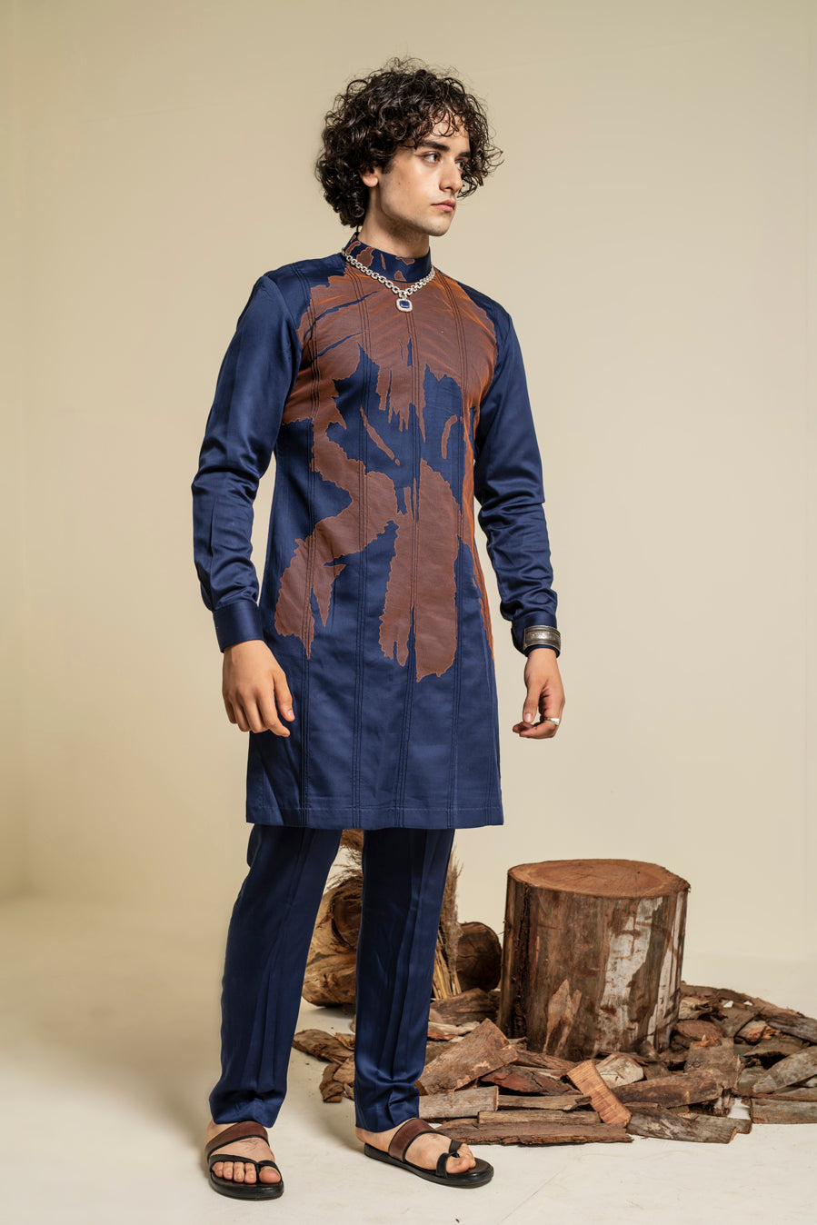 Featuring a navy blue kurta in cotton modal satin base with orange mesh organza embroidery. It is paired with matching pants.