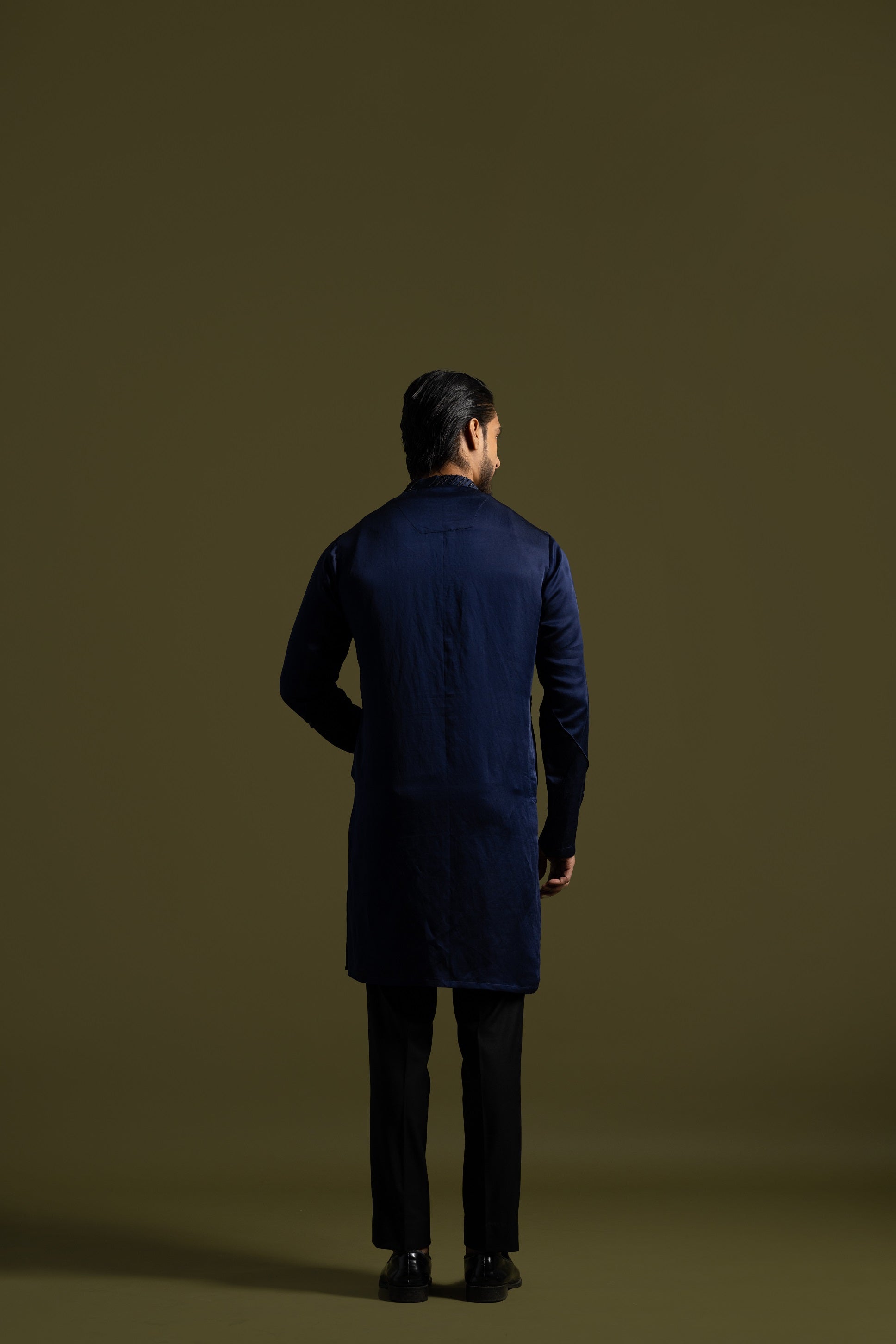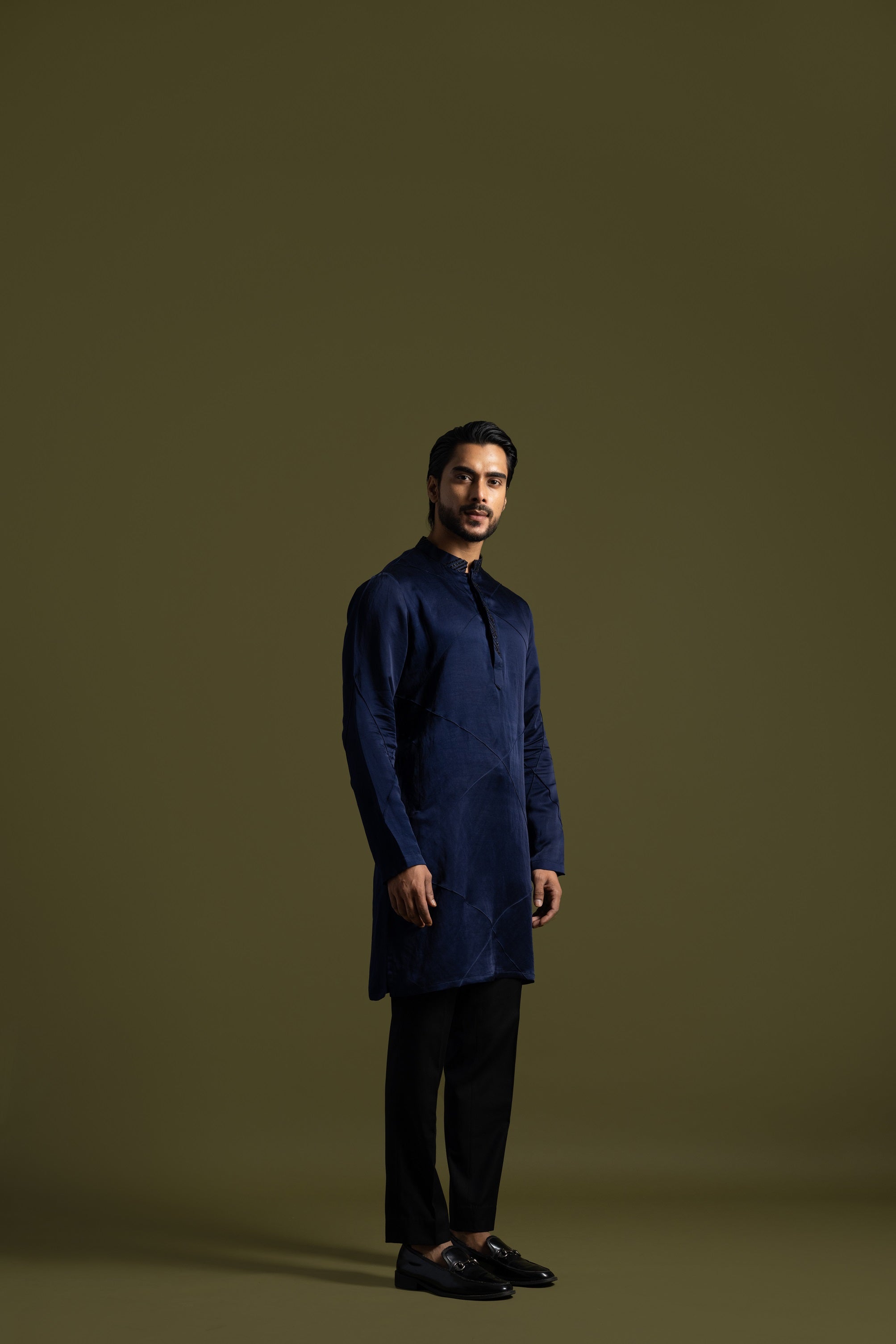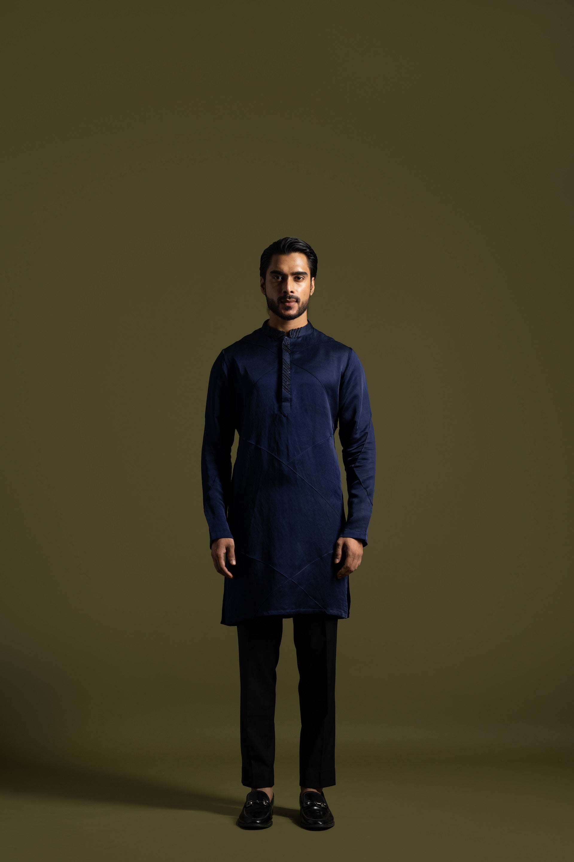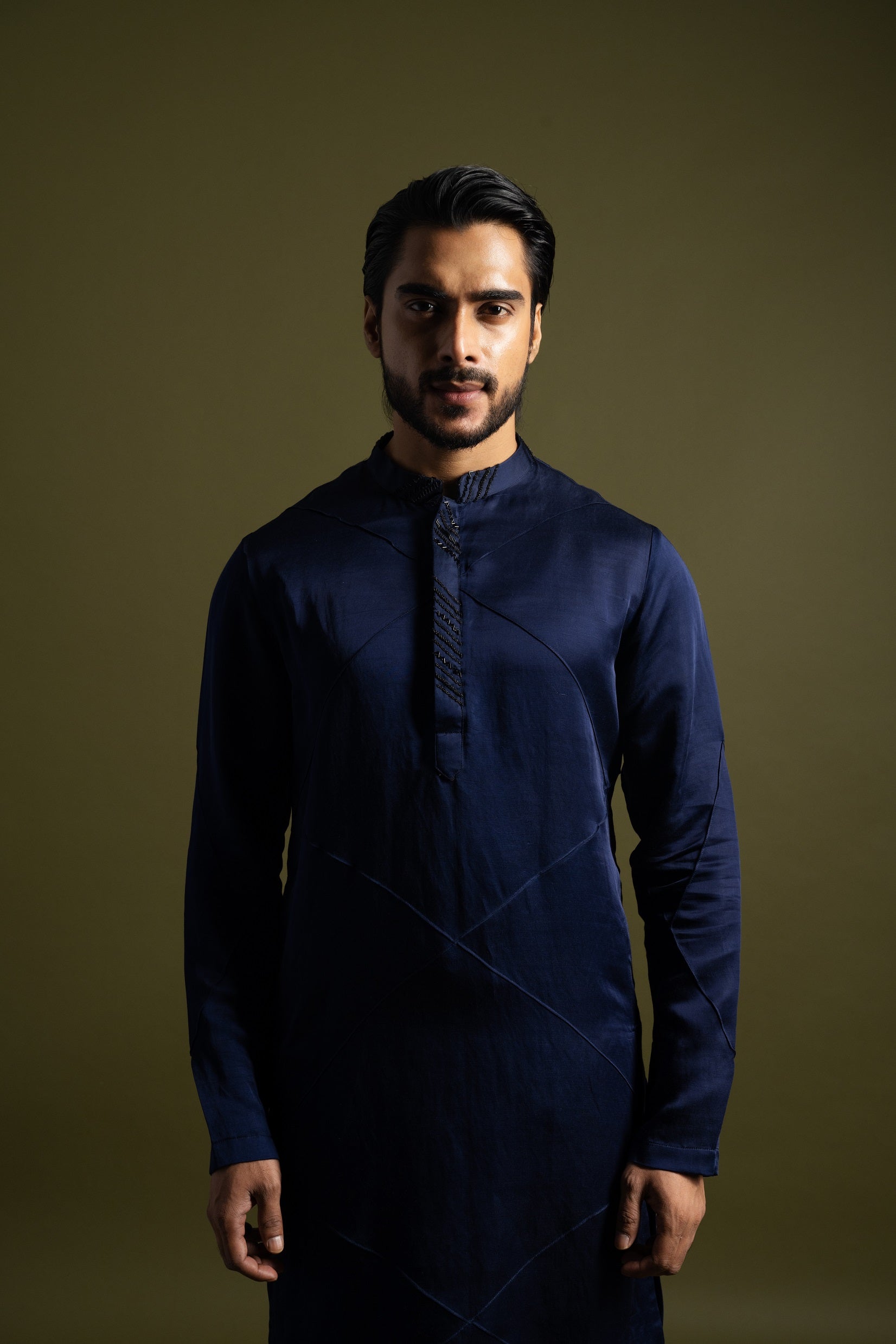 | NAVY BLUE LINEN SATIN KURTA WITH DIAGONAL CRISS CROSS PINTUCKS AND CHIR WORK EMBROIDERY ON THE PLACATE . PAIRED WITH SLIM FIT PANTS |