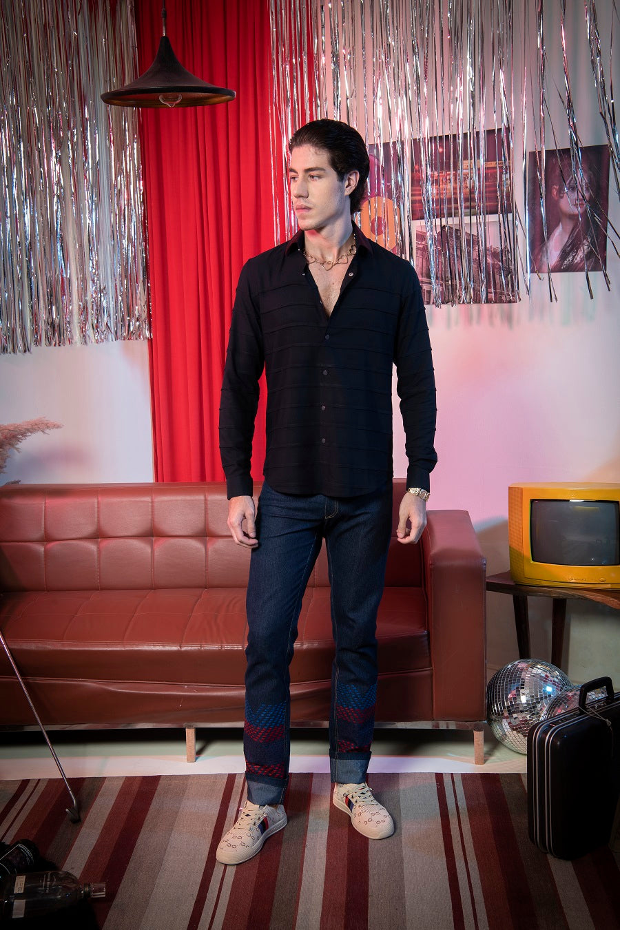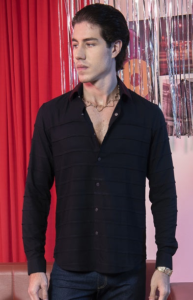 Featuring a navy blue shirt in stretch poly viscose base with snap buttons and embroidery. Ideal for casual wear and occasions that embrace a carefree spirit.NOTE: The pants in the image are for styling purposes only
