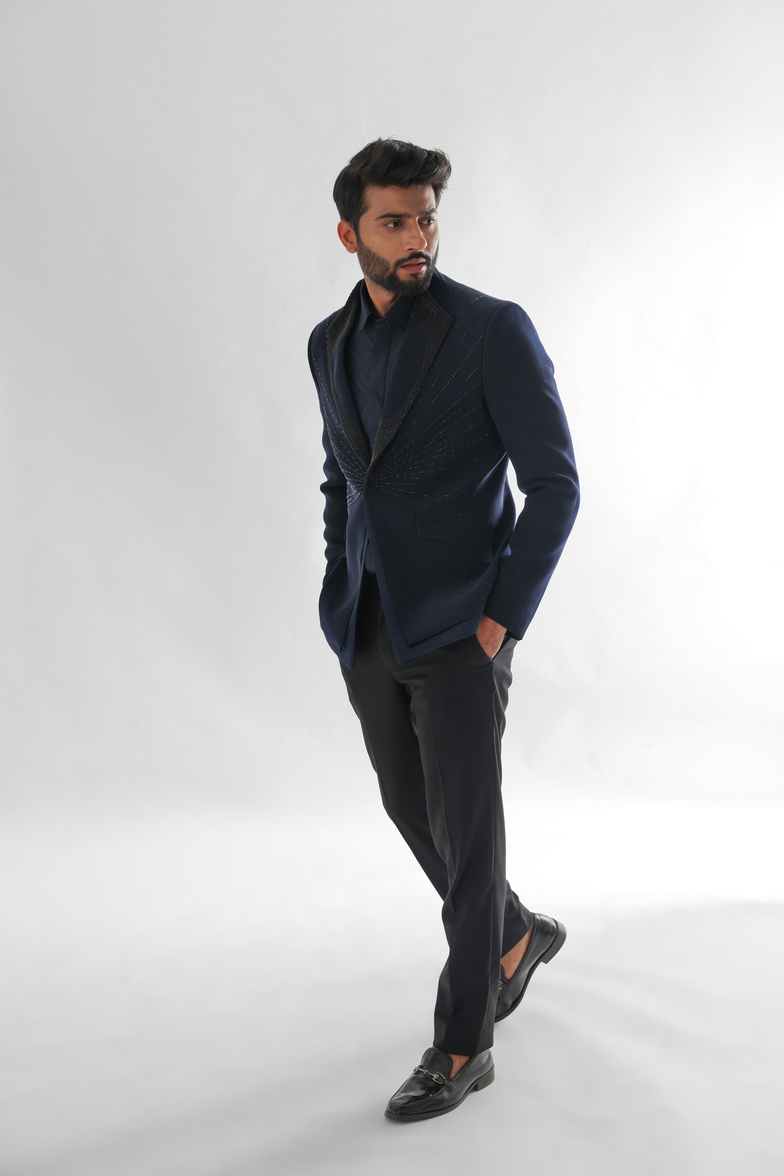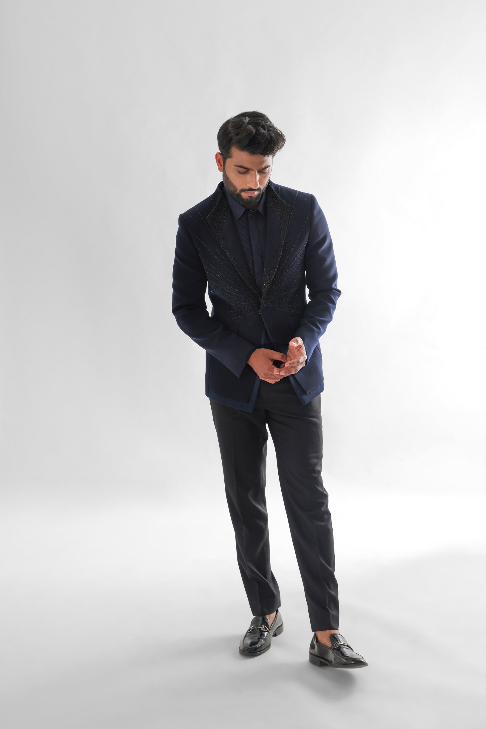 NAVY BLUE TUXEDO EMBROIDERED WITH THE USE OF KATDANA AND MAAL PAIRED WITH BLACK TROUSER. THIS SET INCLUDES JACKET AND TROUSER. PLEASE NOTE: SHIRT NOT INCLUDED IN THE SET