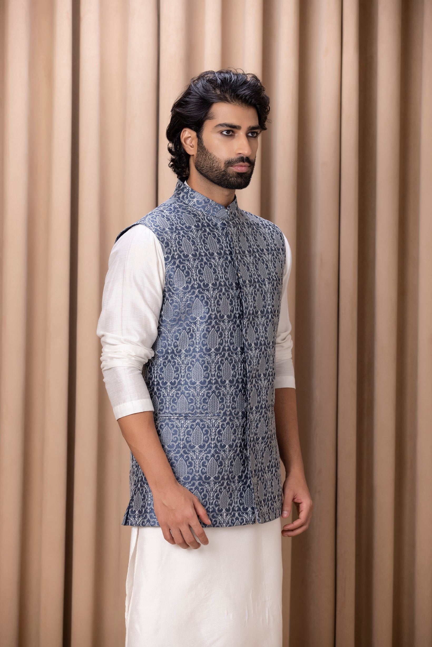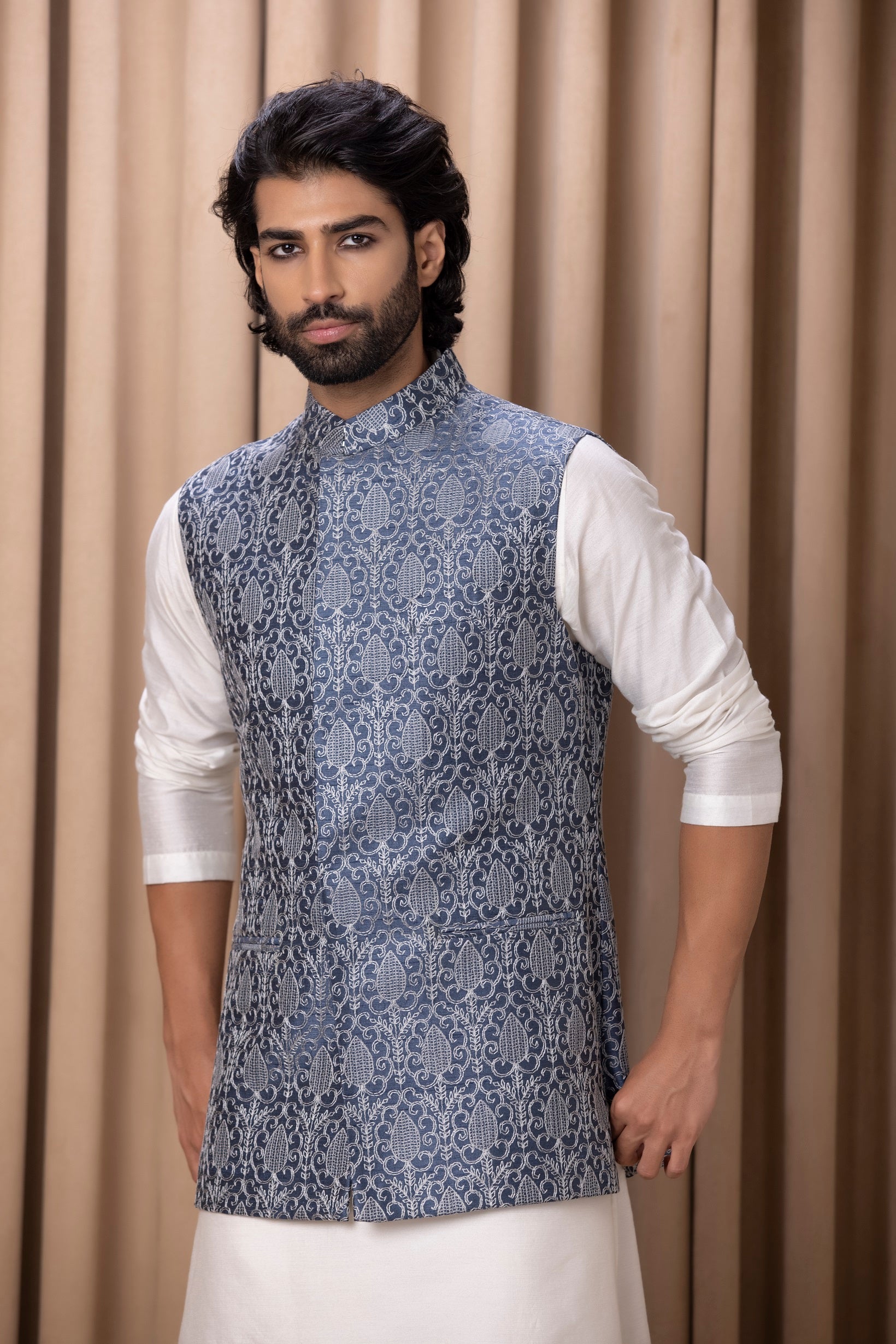 | Featuring a traditional cerulean blue nehru jacket with delicate machine embroidery and minimal details. Perfect for any indoor or outdoor occasion. Pair it up with Ankit V Kapoor's ivory Kurta Set |
