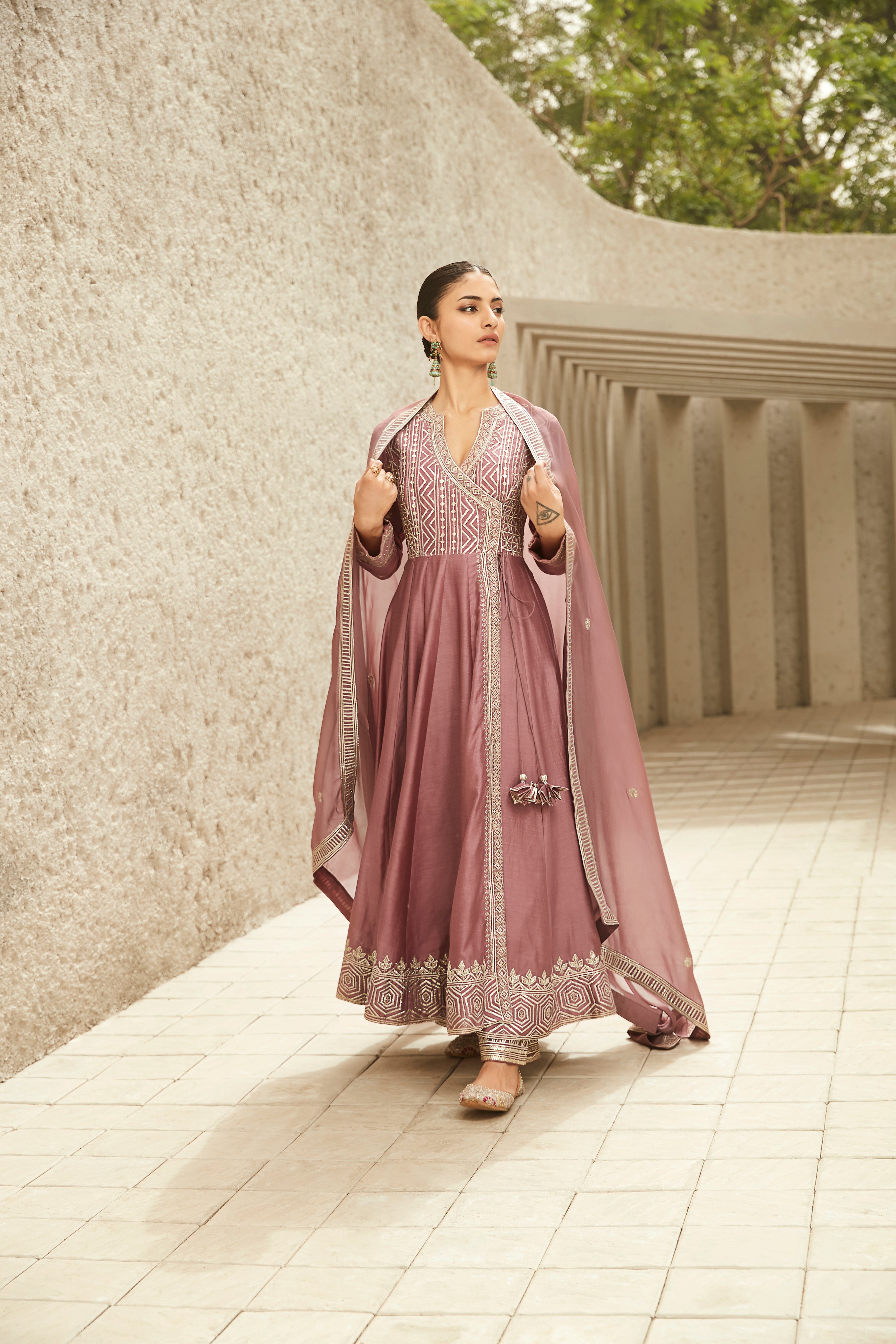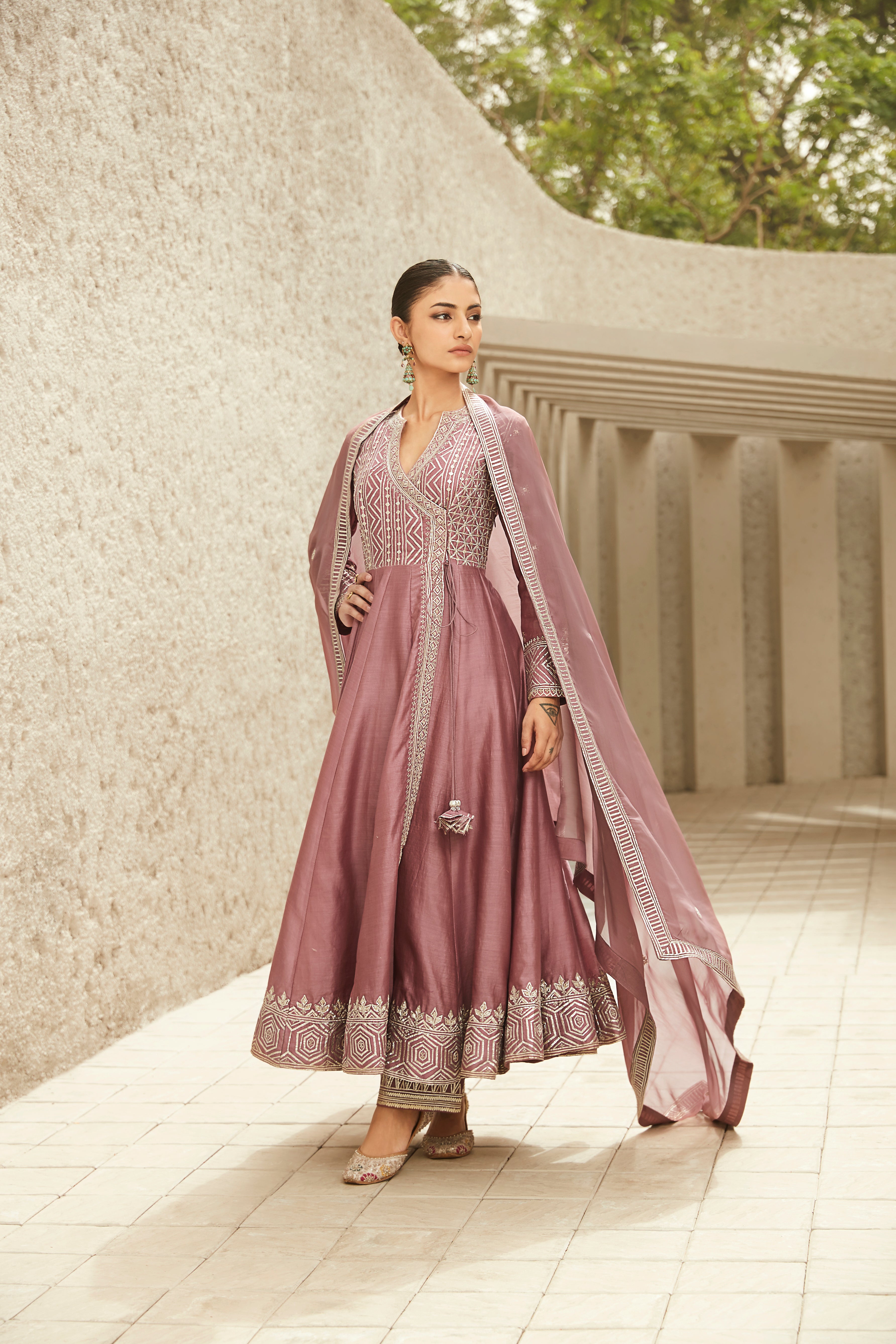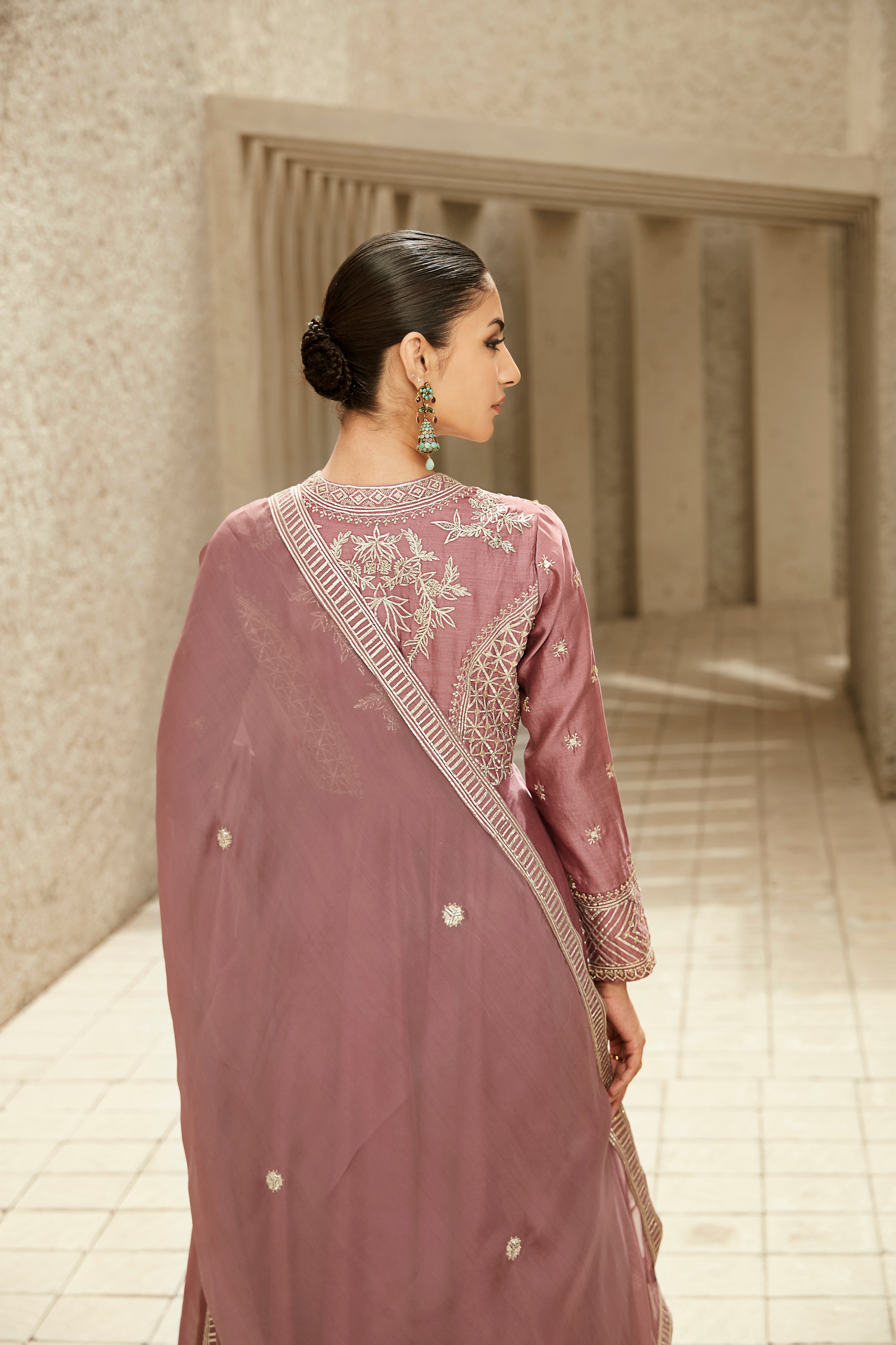Dipped in a timeless hue, this modern cultural masterpiece is made for the traditionally-rooted women of today. The Angrakha kurta, a longstanding Indian classic, is the highlight of the ensemble and flaunts our signature tarnished silver gota patti along with zari work. Paired with chanderi pants and an organza dupatta.