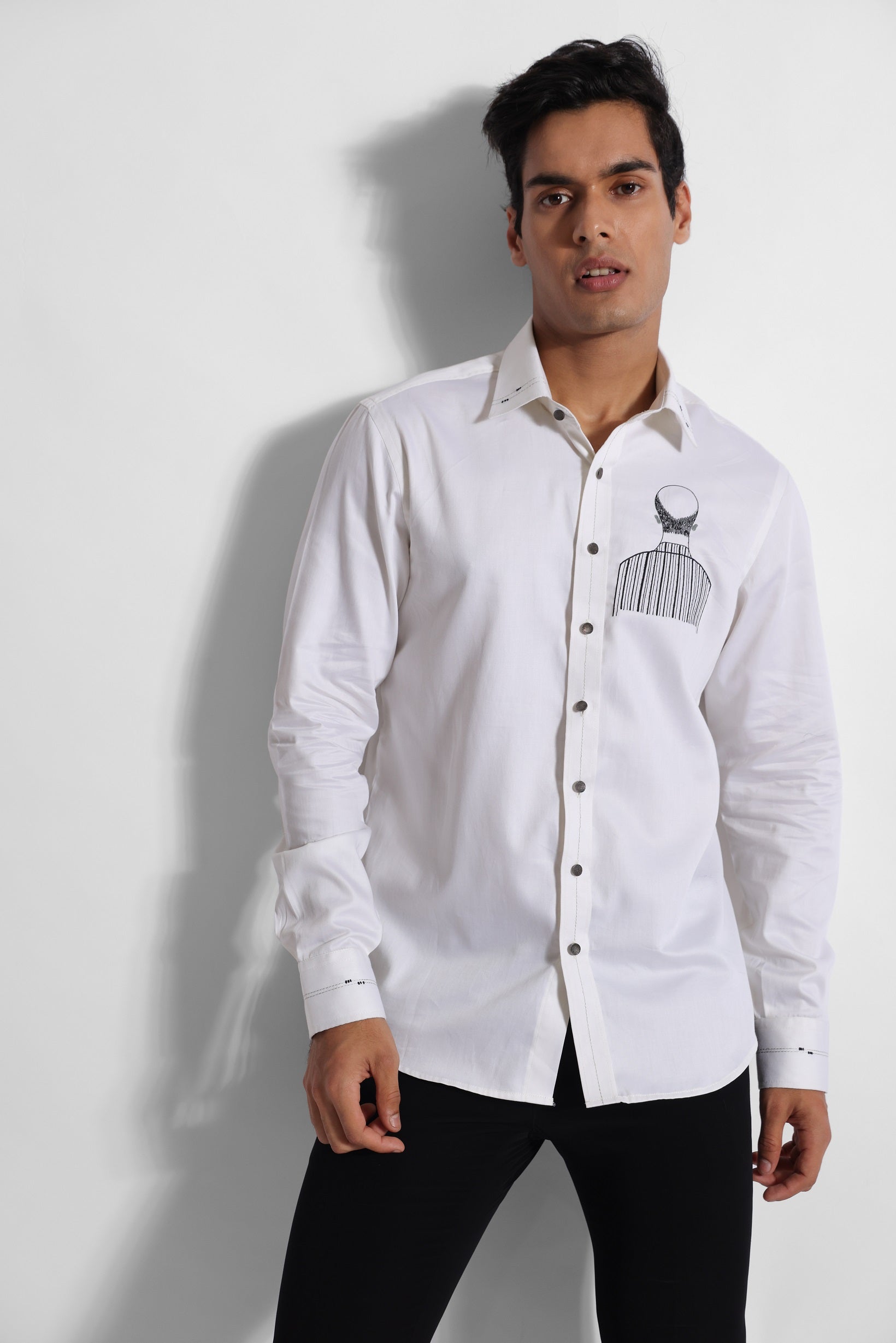 DEPICTION OF A BARCODE ON A MEN"S SHIRT BACK WITH DETAILS ON THE COLLAR AND THE BUTTON PLACKET