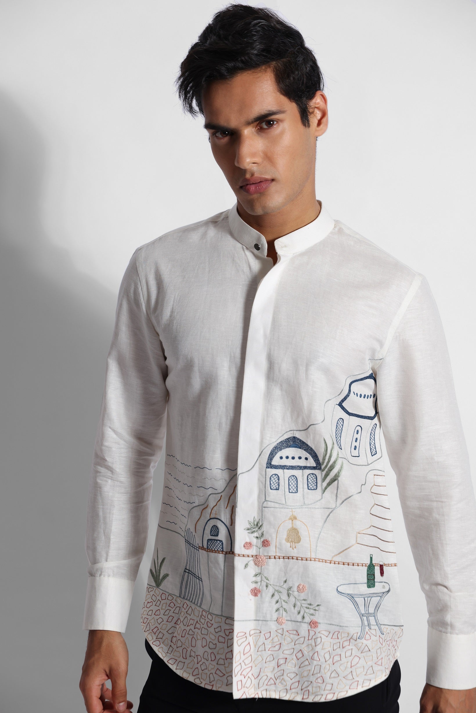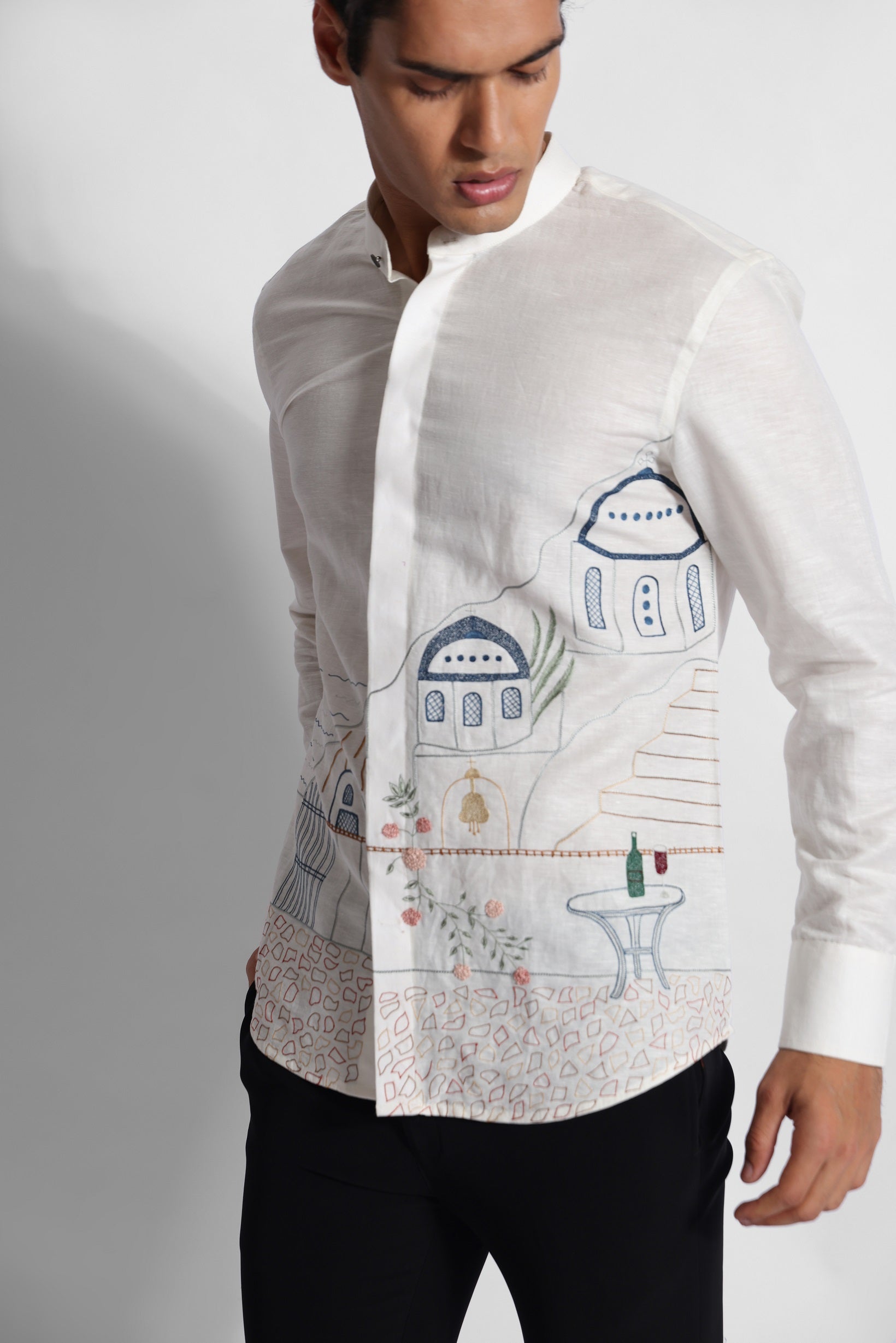 INTRICATE THREAD WORK DEPICTING AN EVENING IN SANTORINI , GREECE