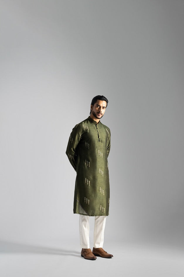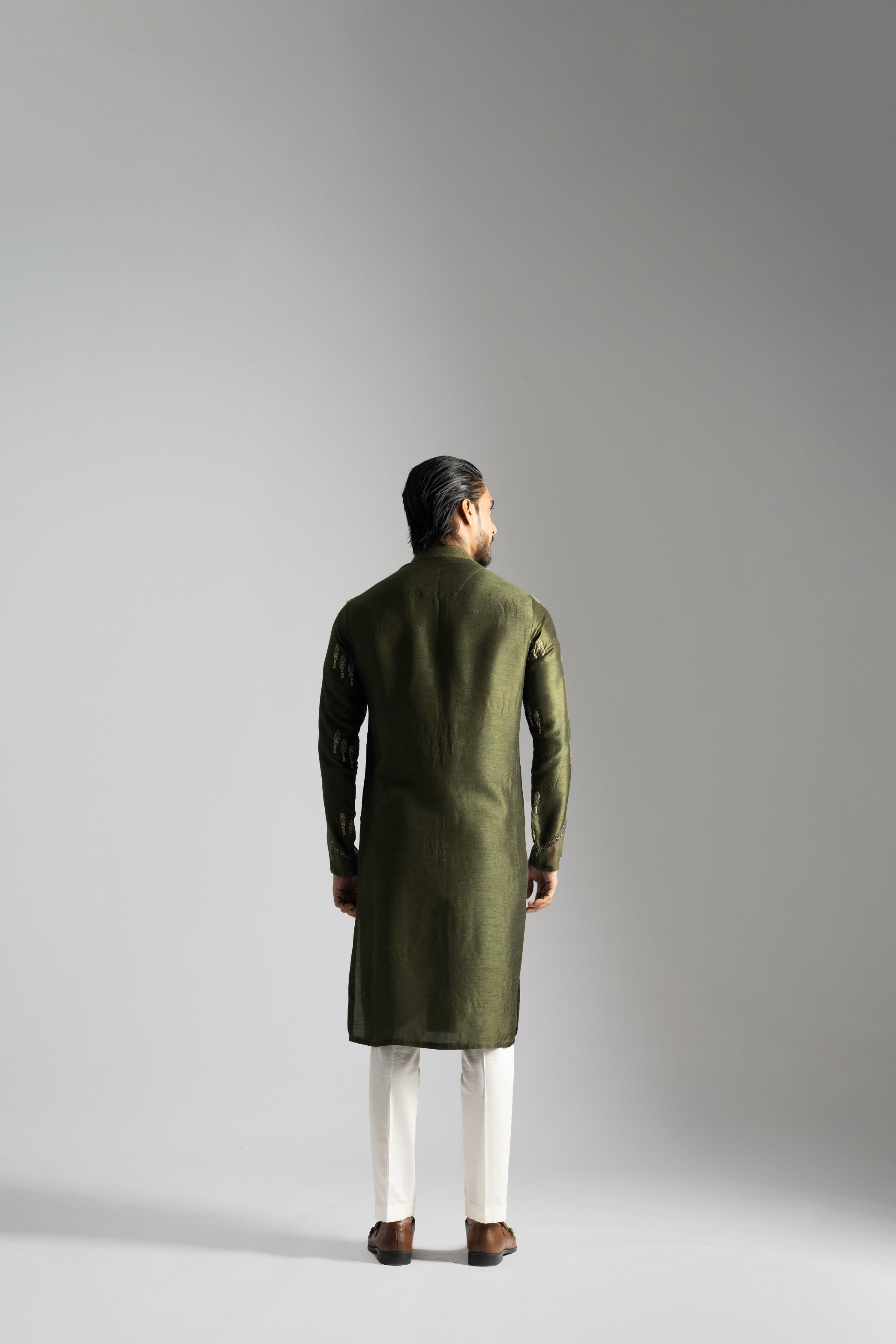 | OLIVE GREEN LINEN SATIN KURTA WITH HIGLIGTS OF CUTDANA AND MAAL ON DORI WORK FLORAL MOTIIFS WITH STITCHLINE DETAILING ON THE COLLAR AND ORGANZA DETAILS ON THE WRIST |