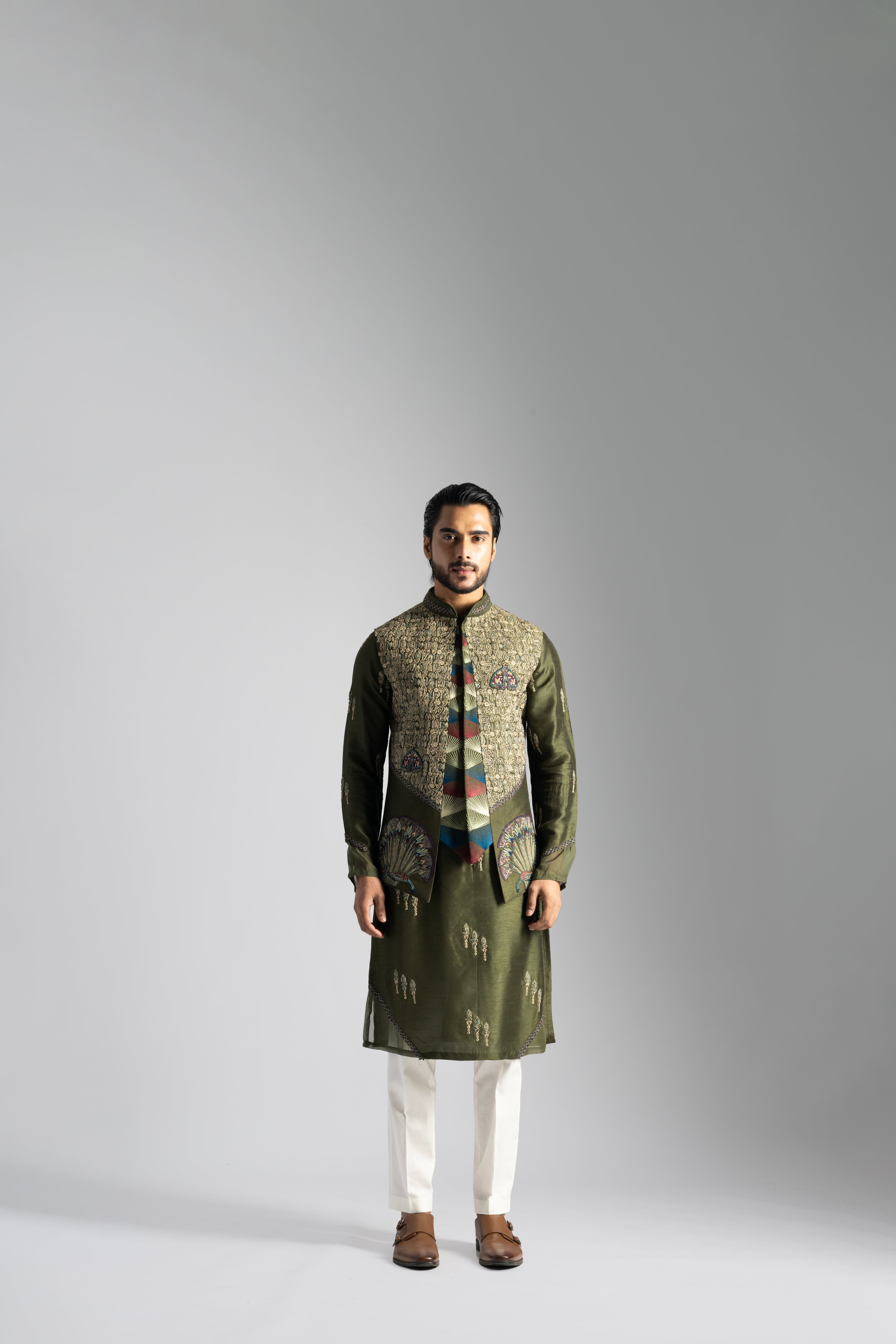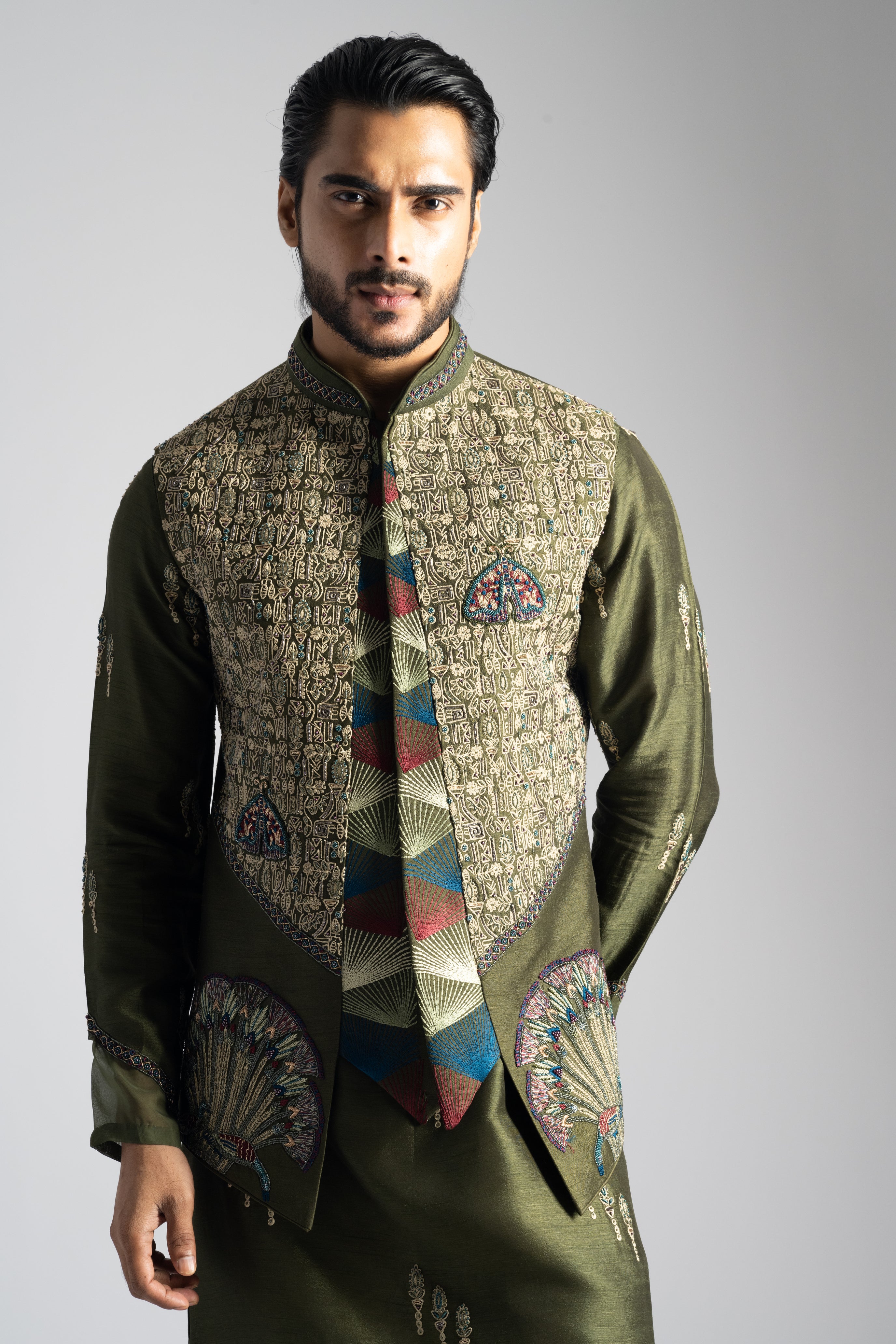 OLIVE GREEN NEHRU JACKET WITH EGYPTIAN SCRIPTURE INSPIRED EMBROIDERY.