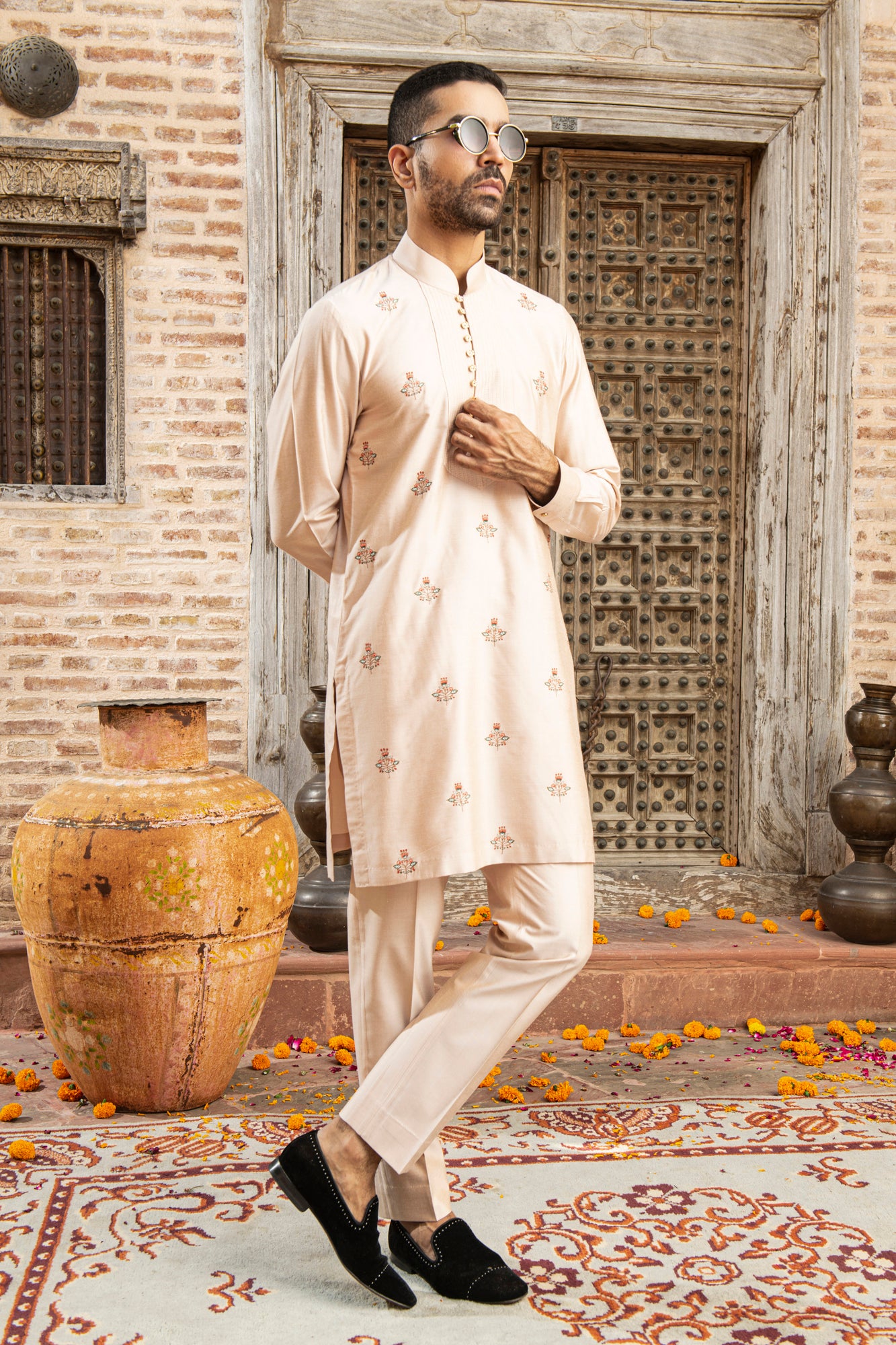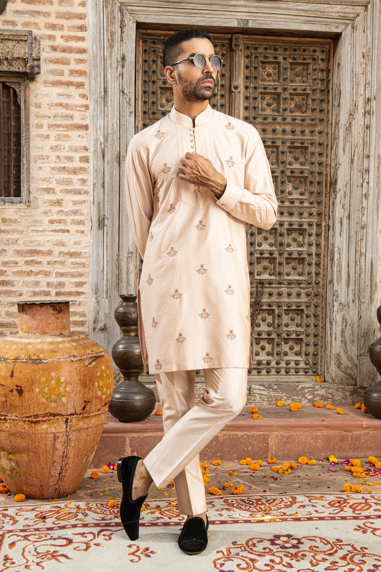Featuring a peach kurta in katan silk base with thread and floral embroidery. It is paired with pants. Perfect wear for festive or pooja ceremonies.