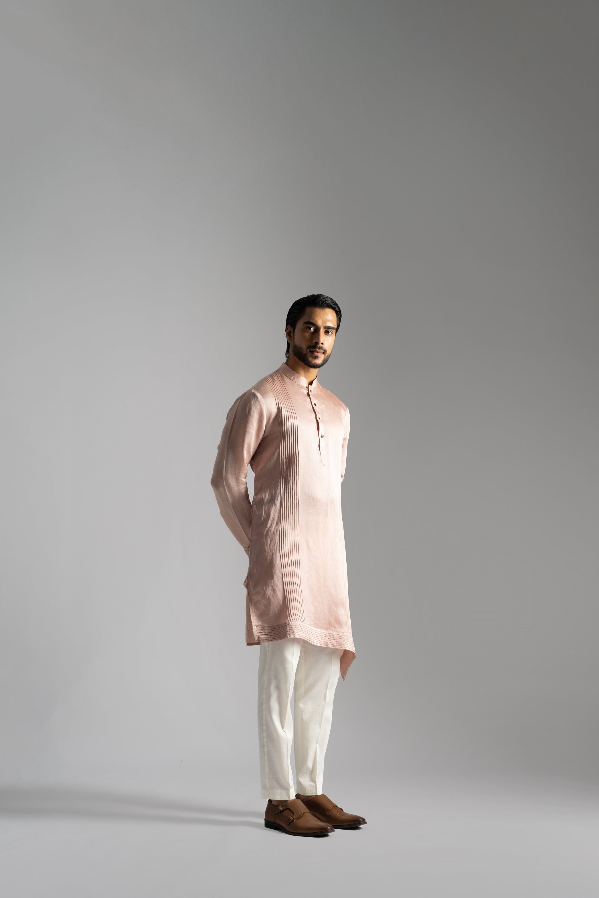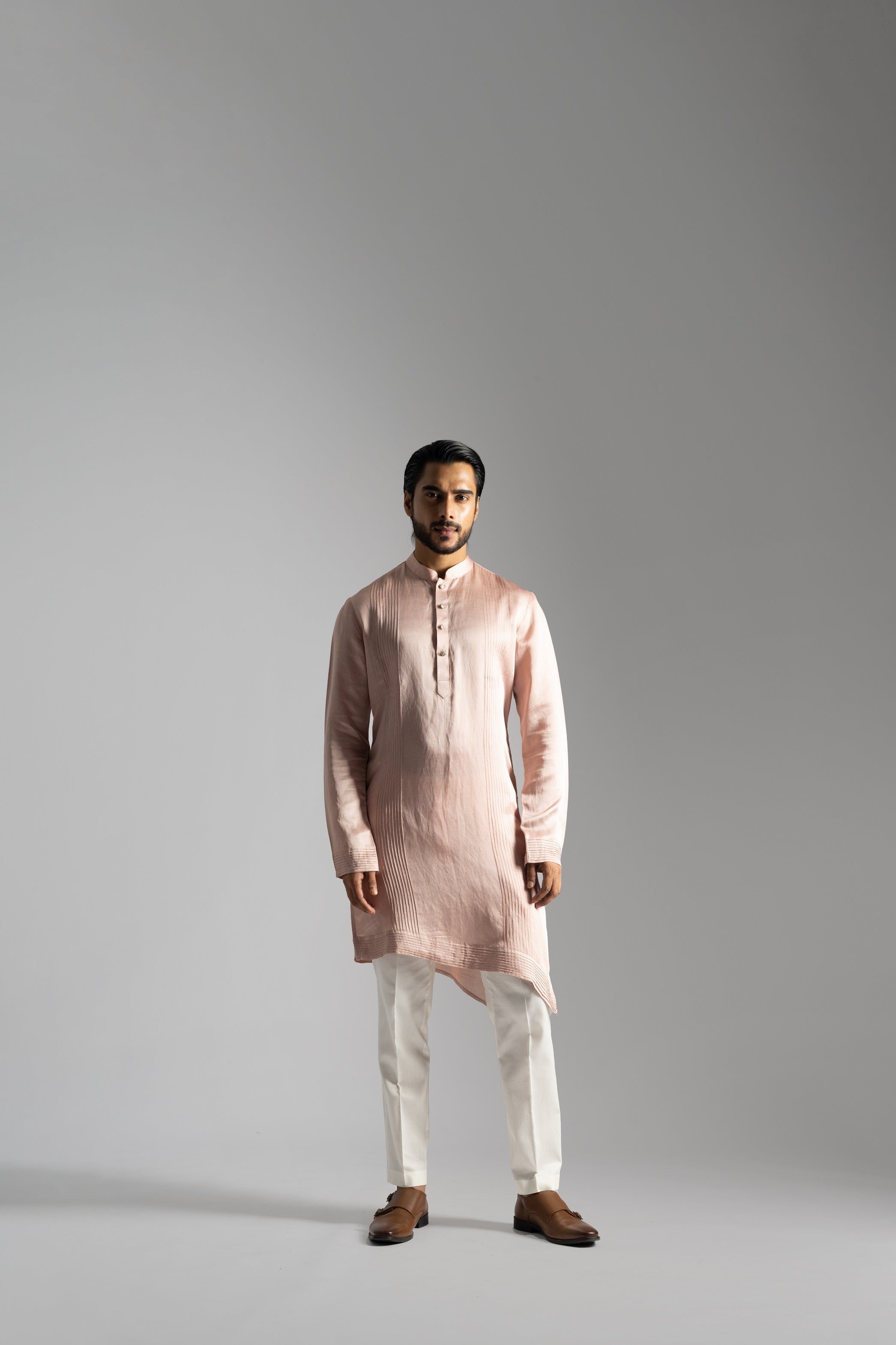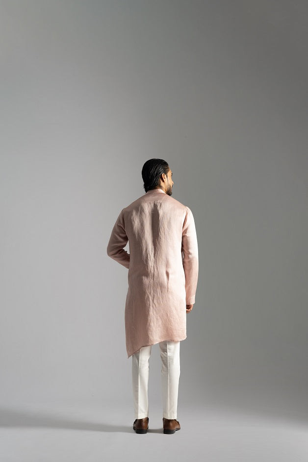 | PINK LINEN SATIN DIAGONAL CUT KURTA WITH VERTICAL PINTUCKS LINE ON THE CHEST |