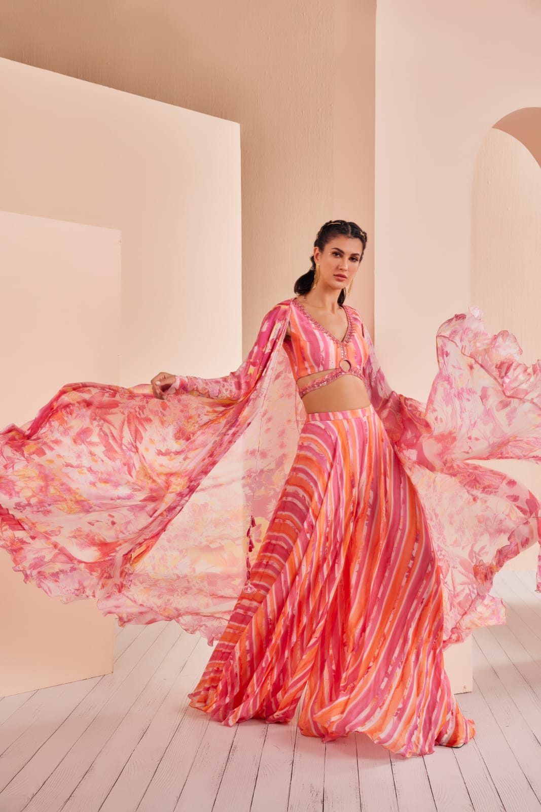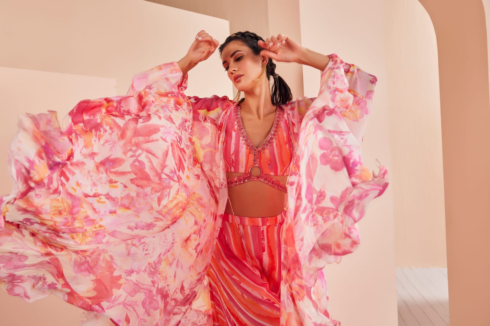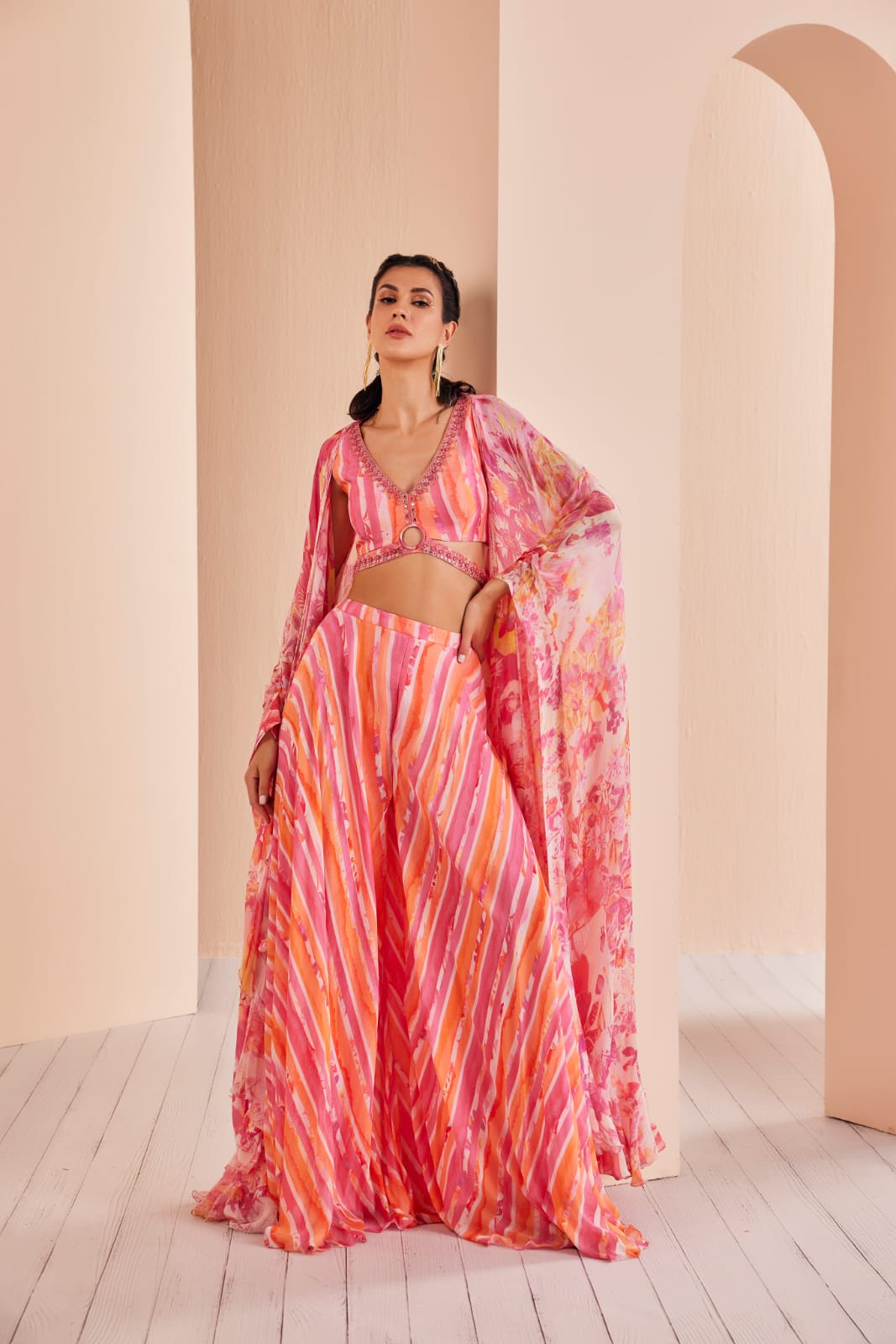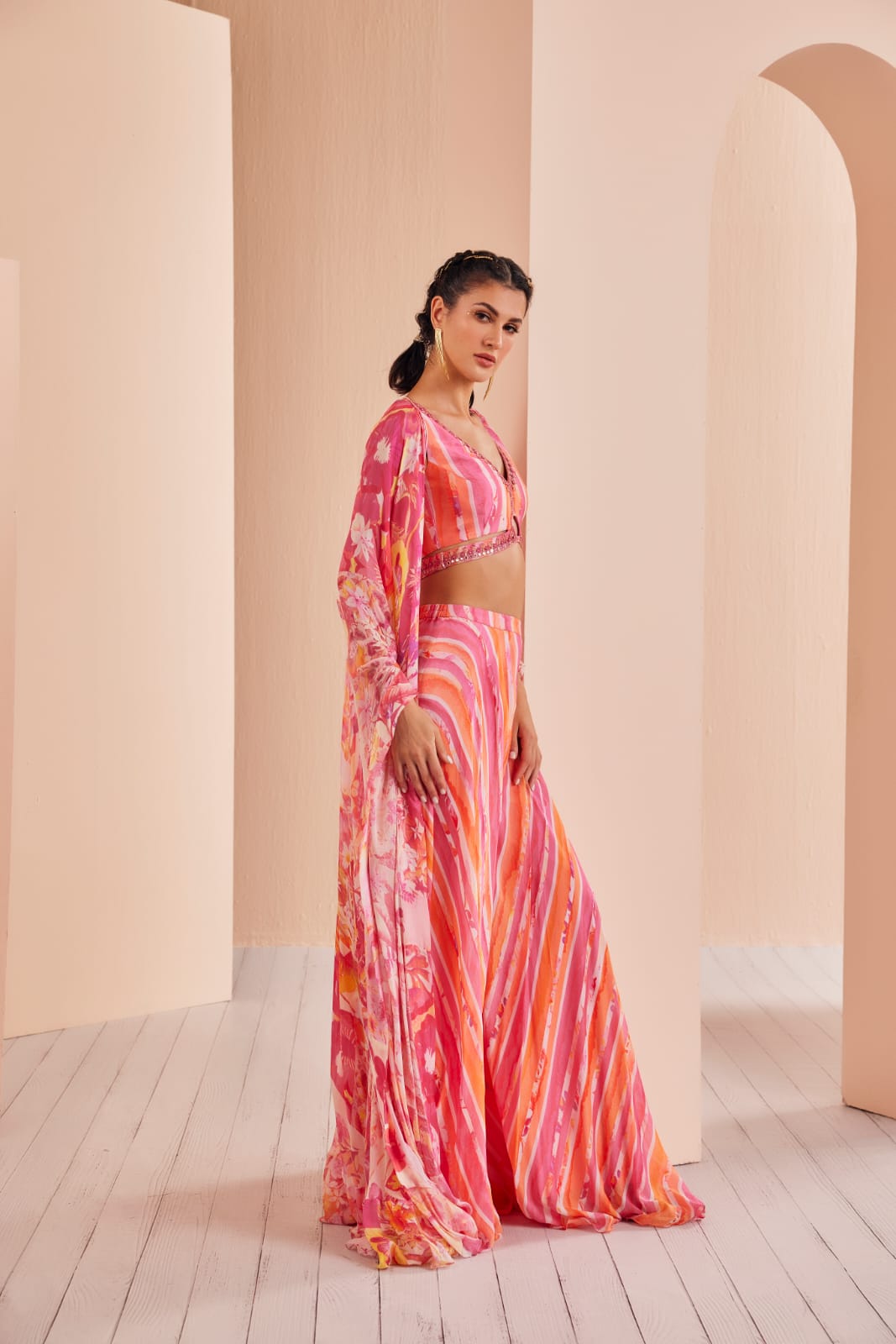 Pink printed chiffon blouse stylized with gold ring with sharara and cape
