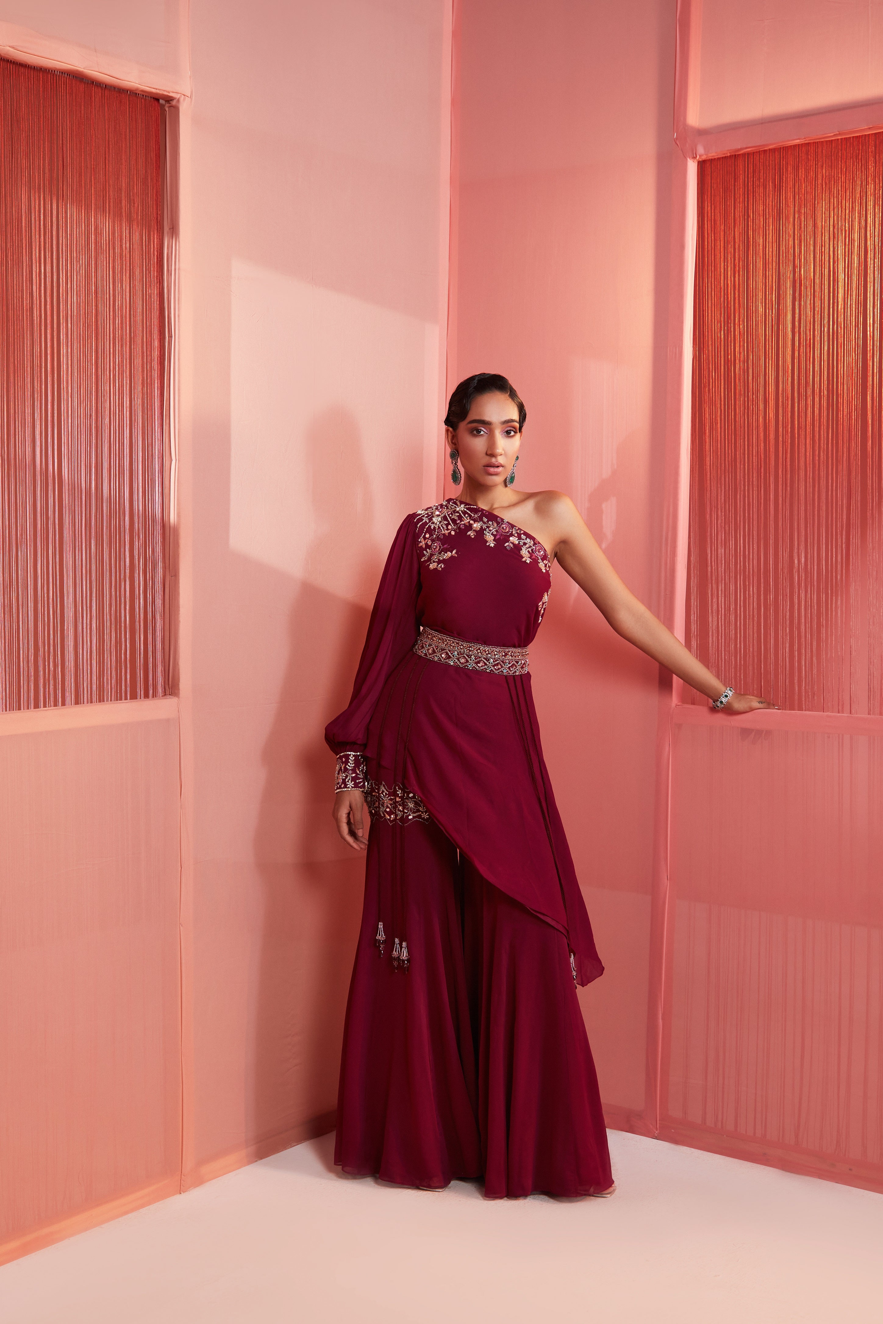 Plum georgette one shoulder cape with embroidery detailing at the neckline, it has a balloon sleeve and embroidered cuffs, it is paired with a hand embroidered sharara and a broad belt.