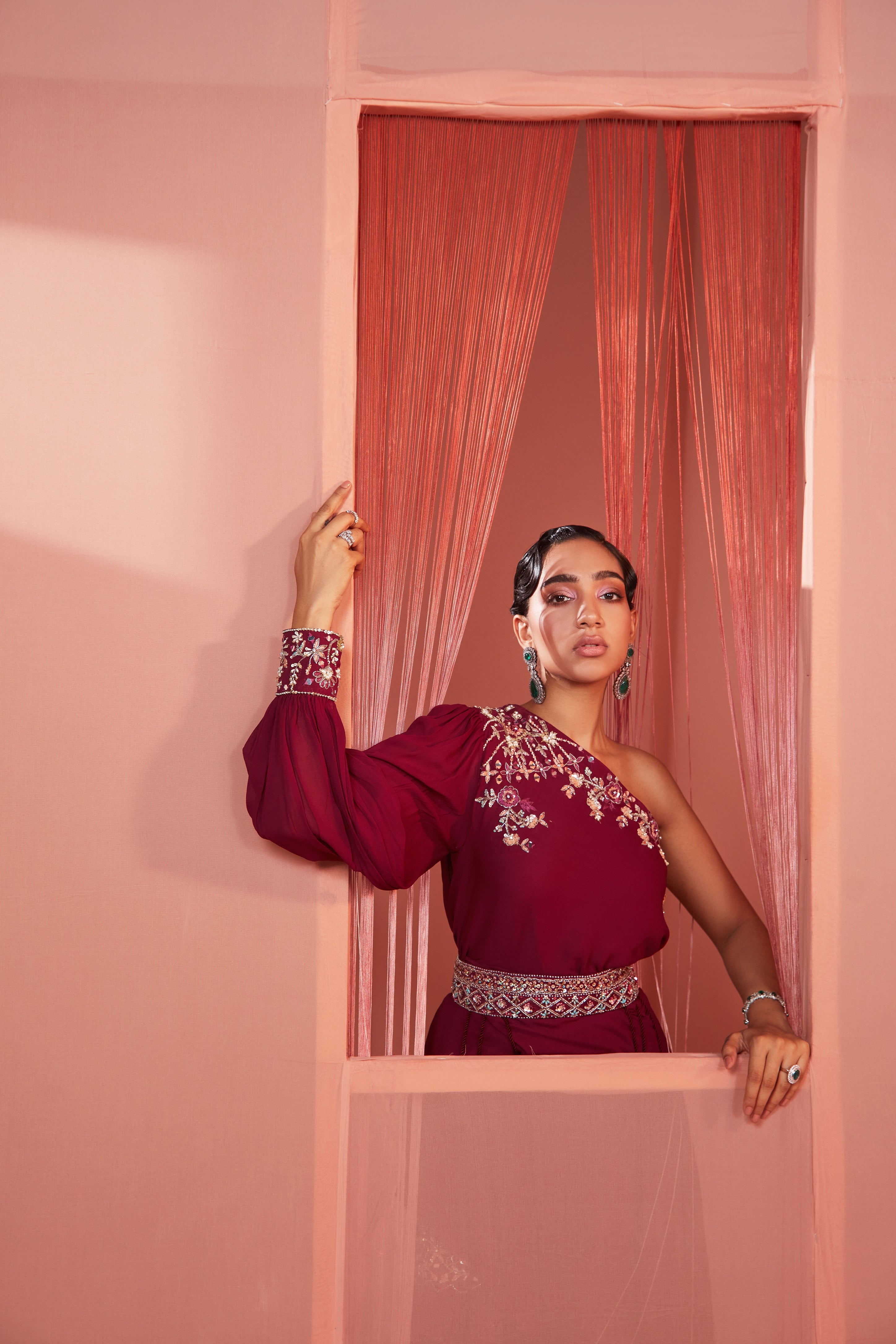 Plum one shoulder cape and sharara