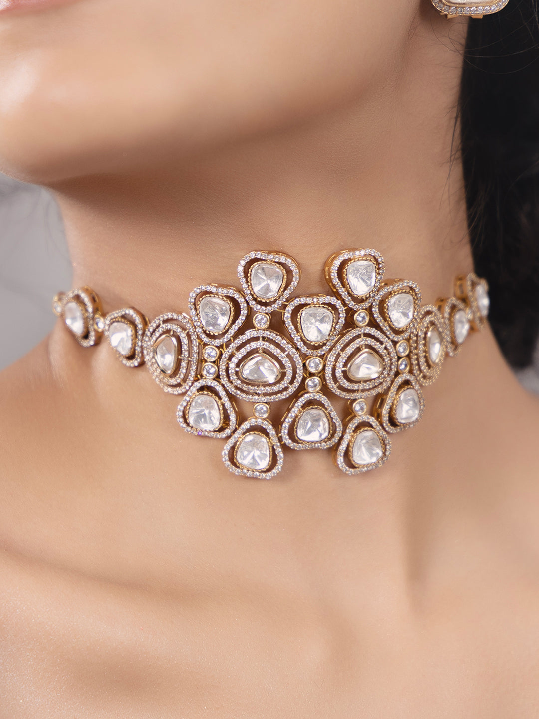 | An elegant choker necklace adorned with polki pearls and white stones. |