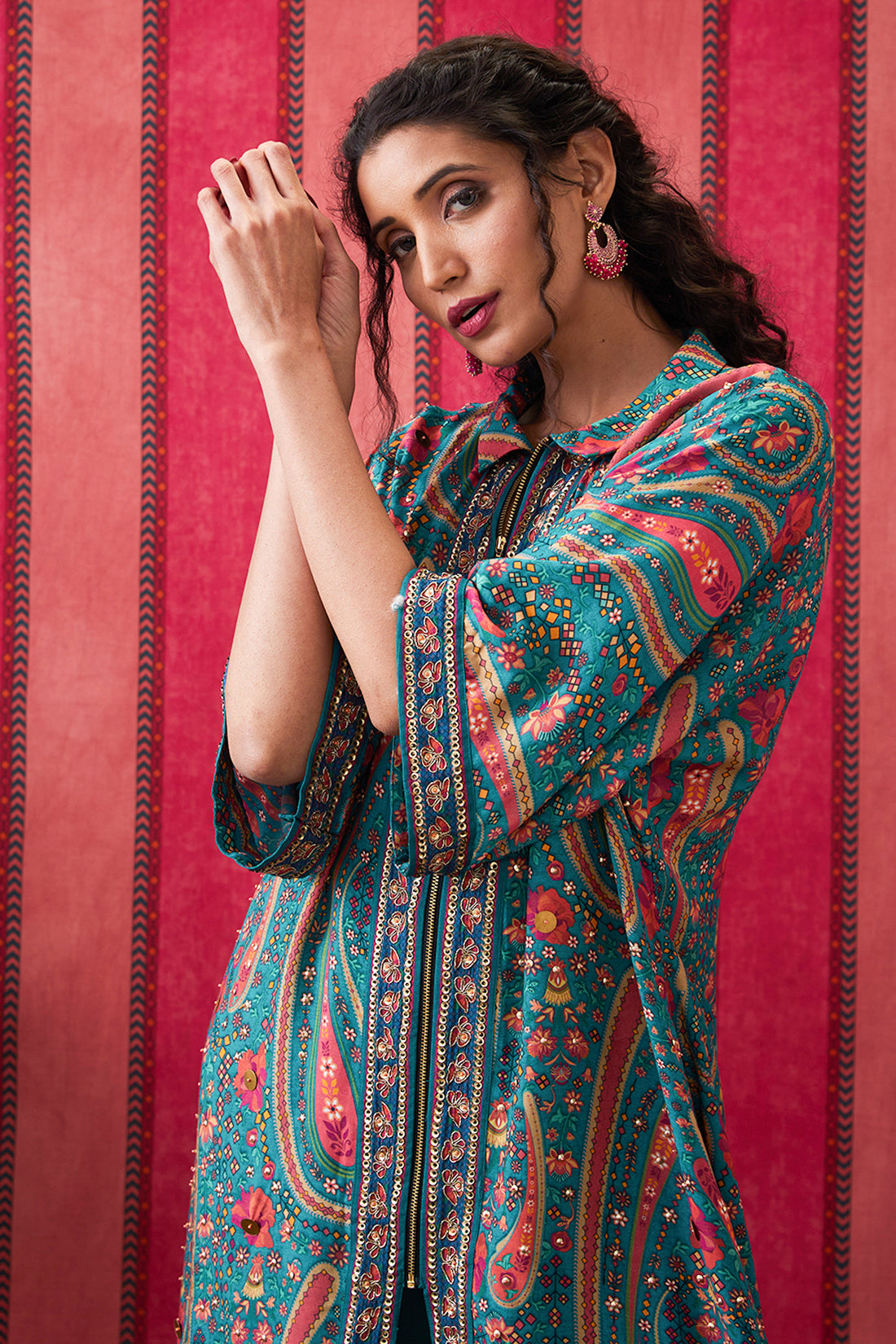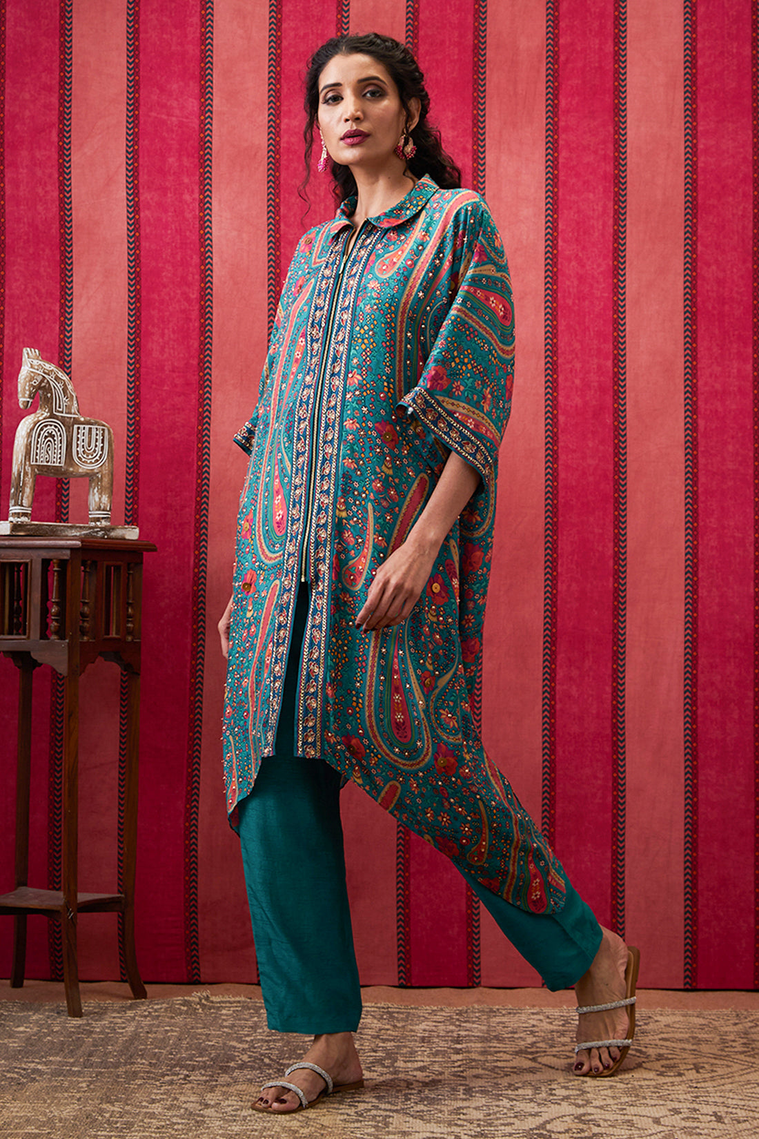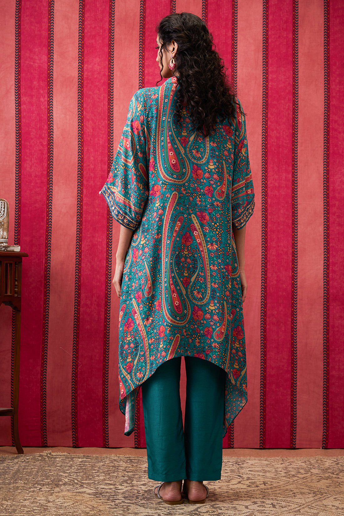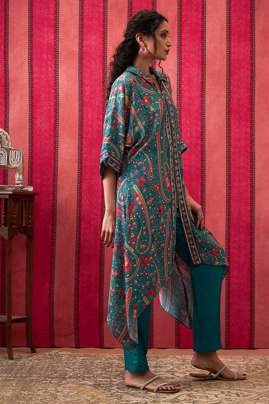 Featuring a teal green Asymmetic Kurta set in crepe fabric. It is paired with a straight pant.