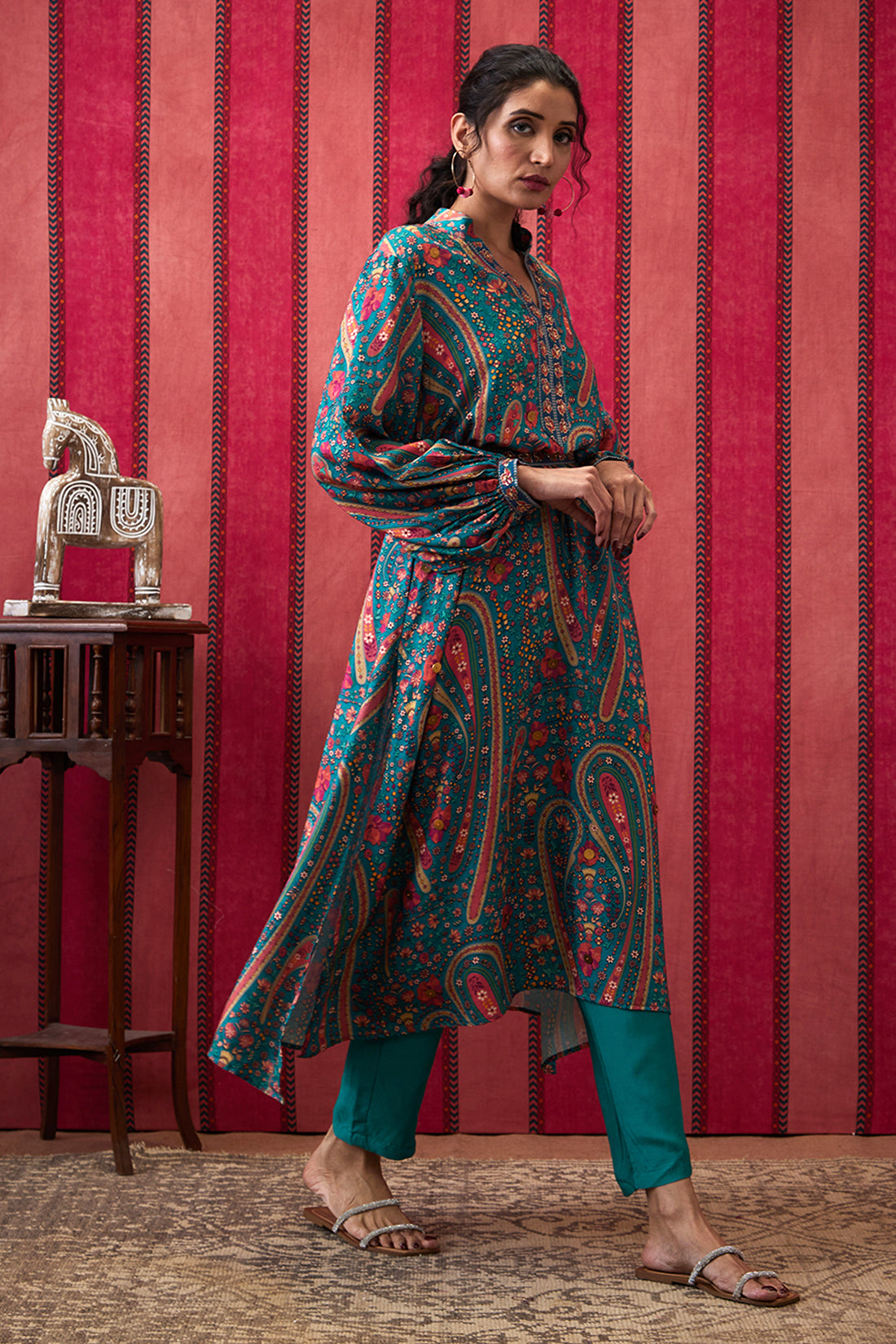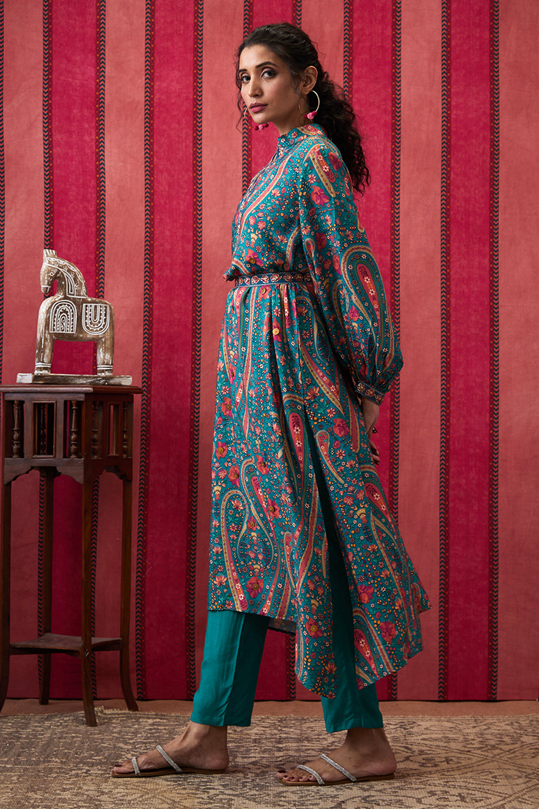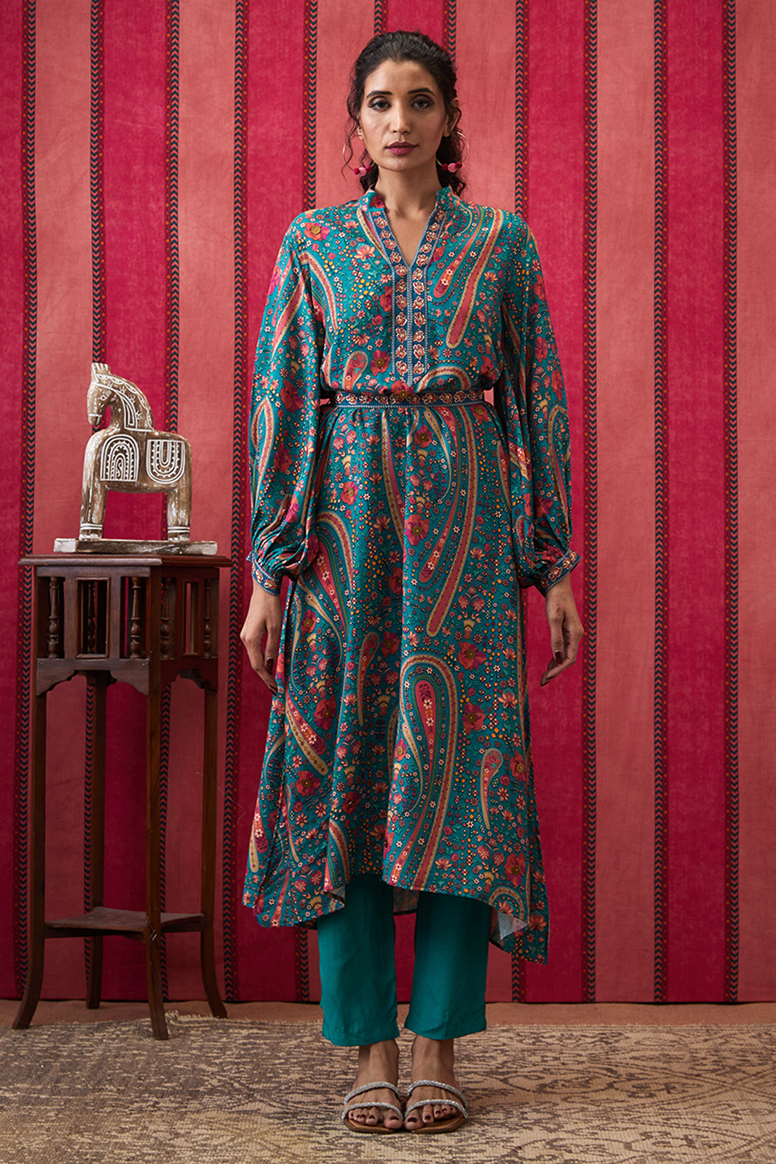 32. Featuring a teal green Embroidered Kurta set. It is paired with a straight bottom pant & belt.