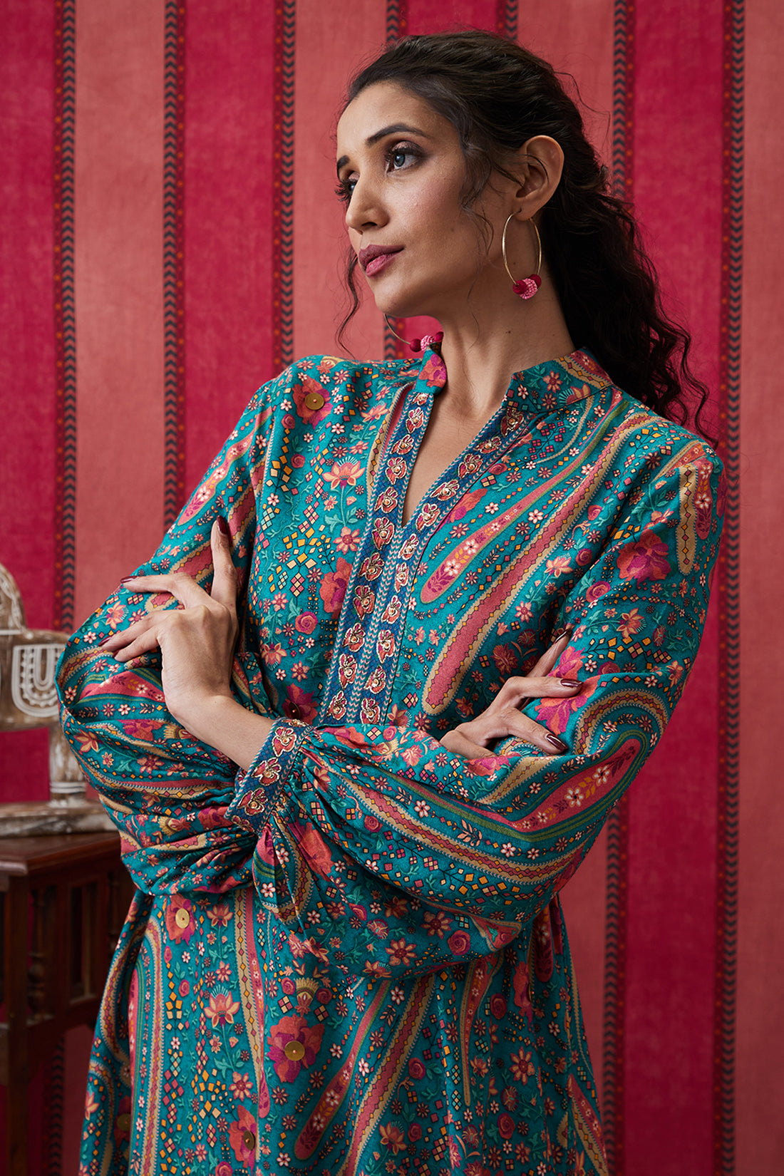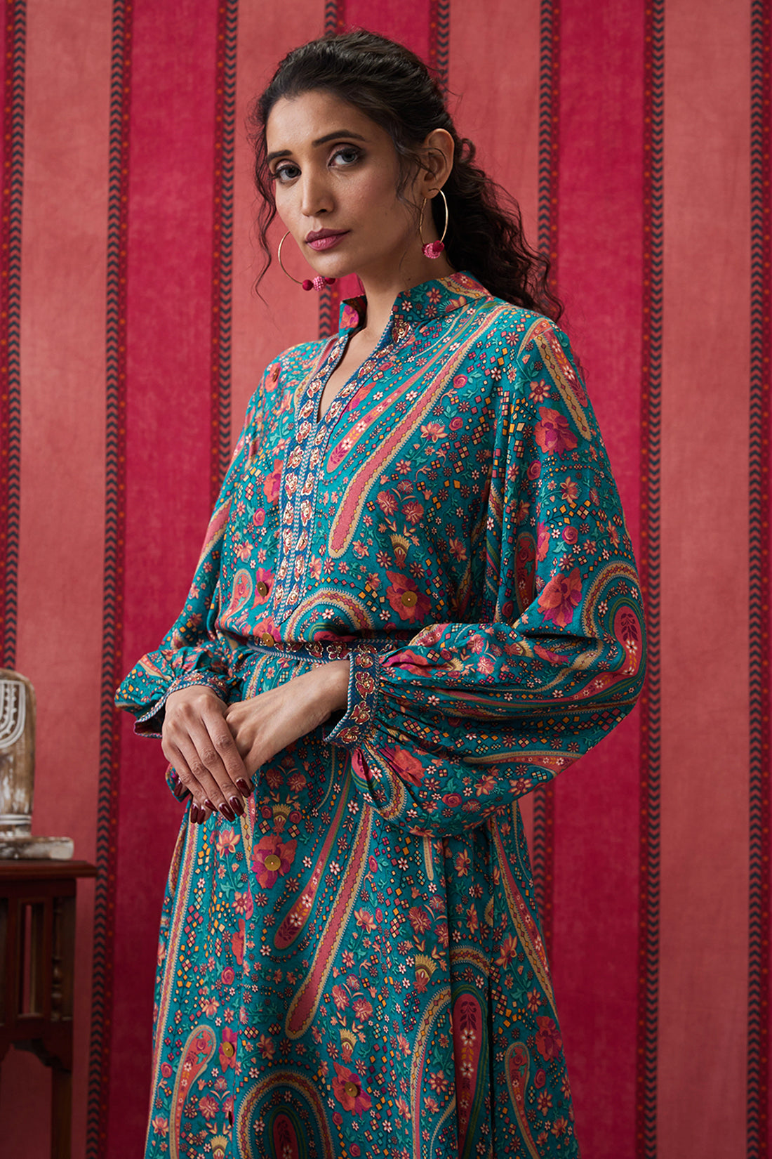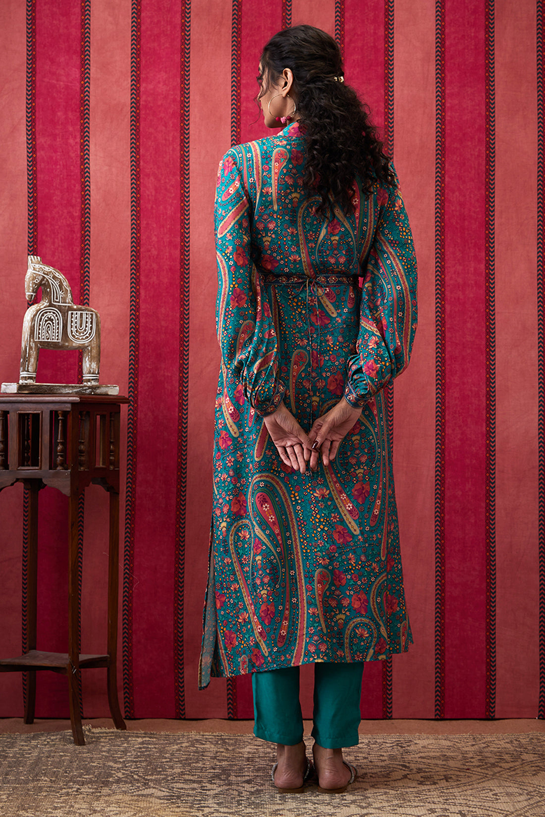 32. Featuring a teal green Embroidered Kurta set. It is paired with a straight bottom pant & belt.