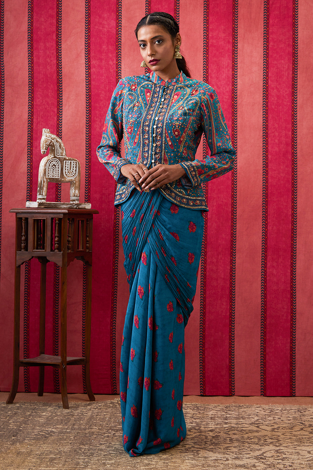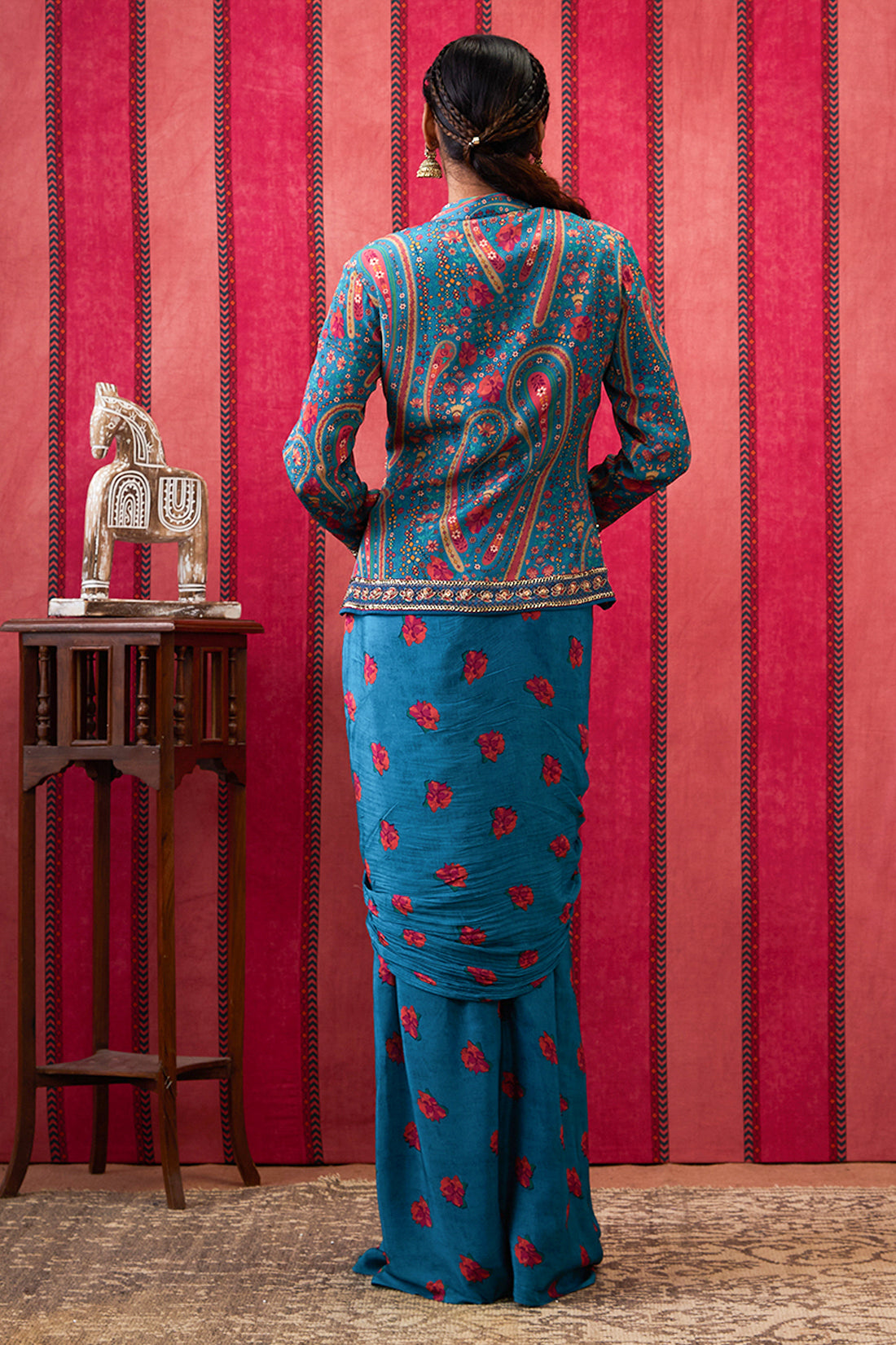 Featuring a teal green Drape skirt in crepe fabric. It is paired with a hand embroidered top jacke