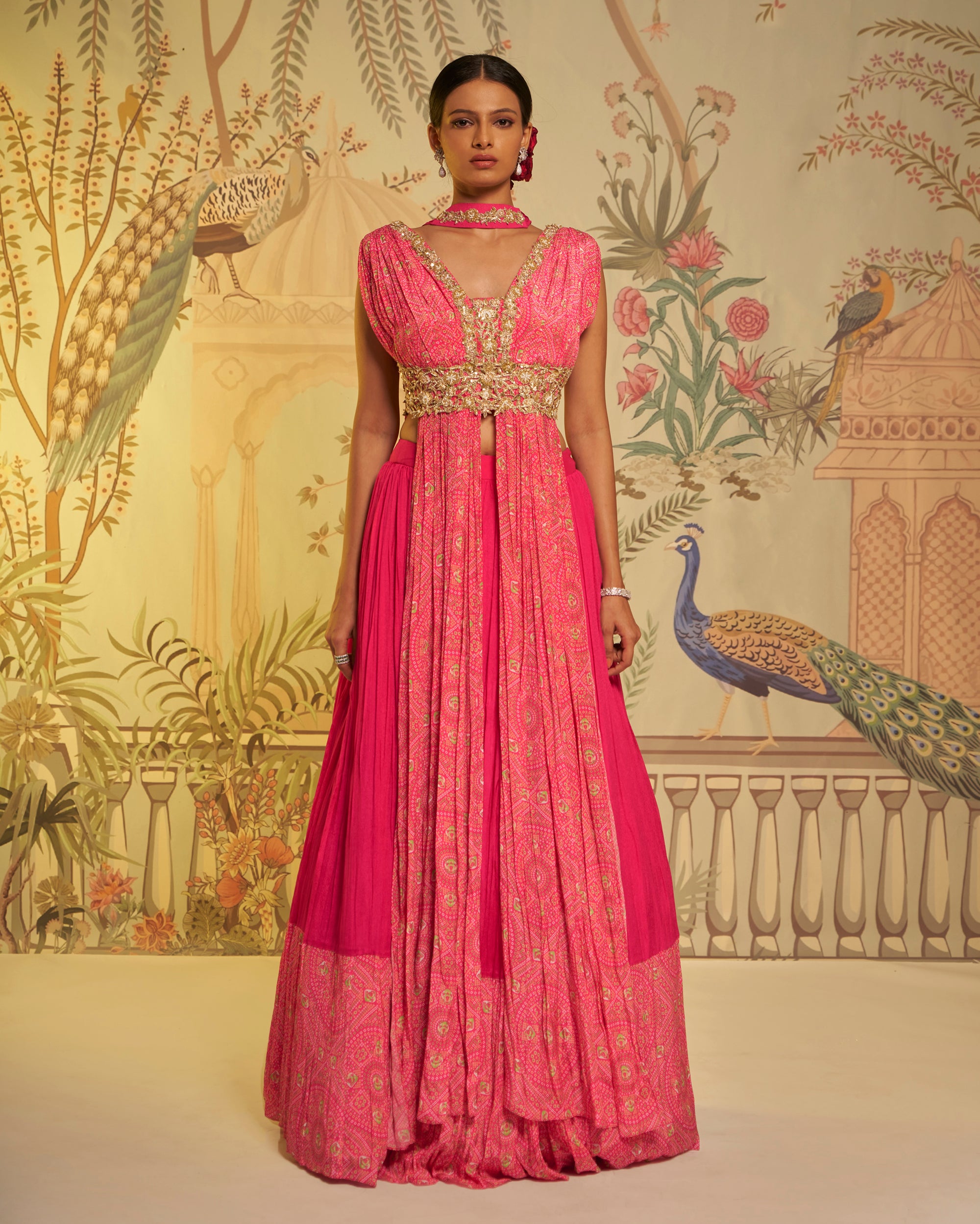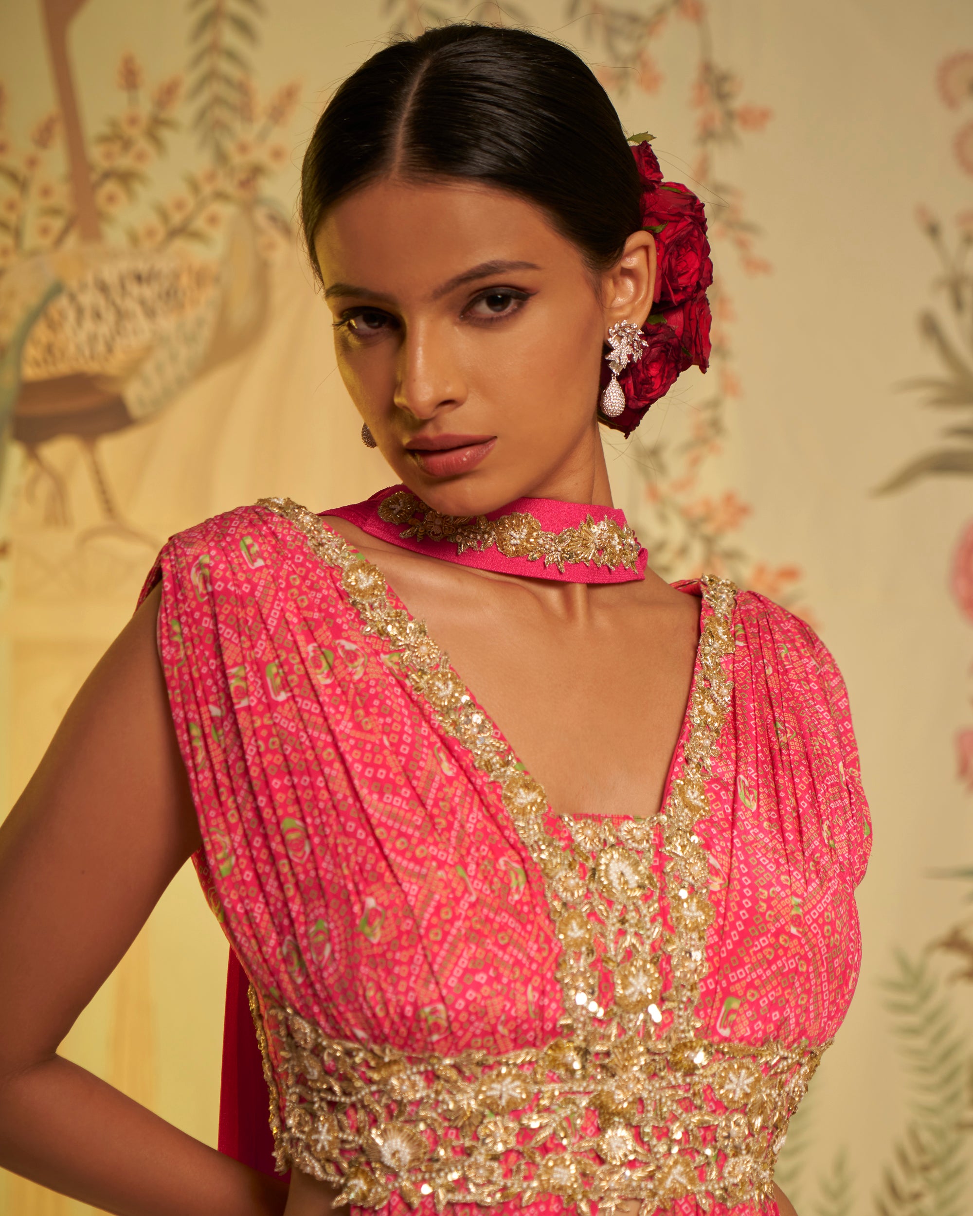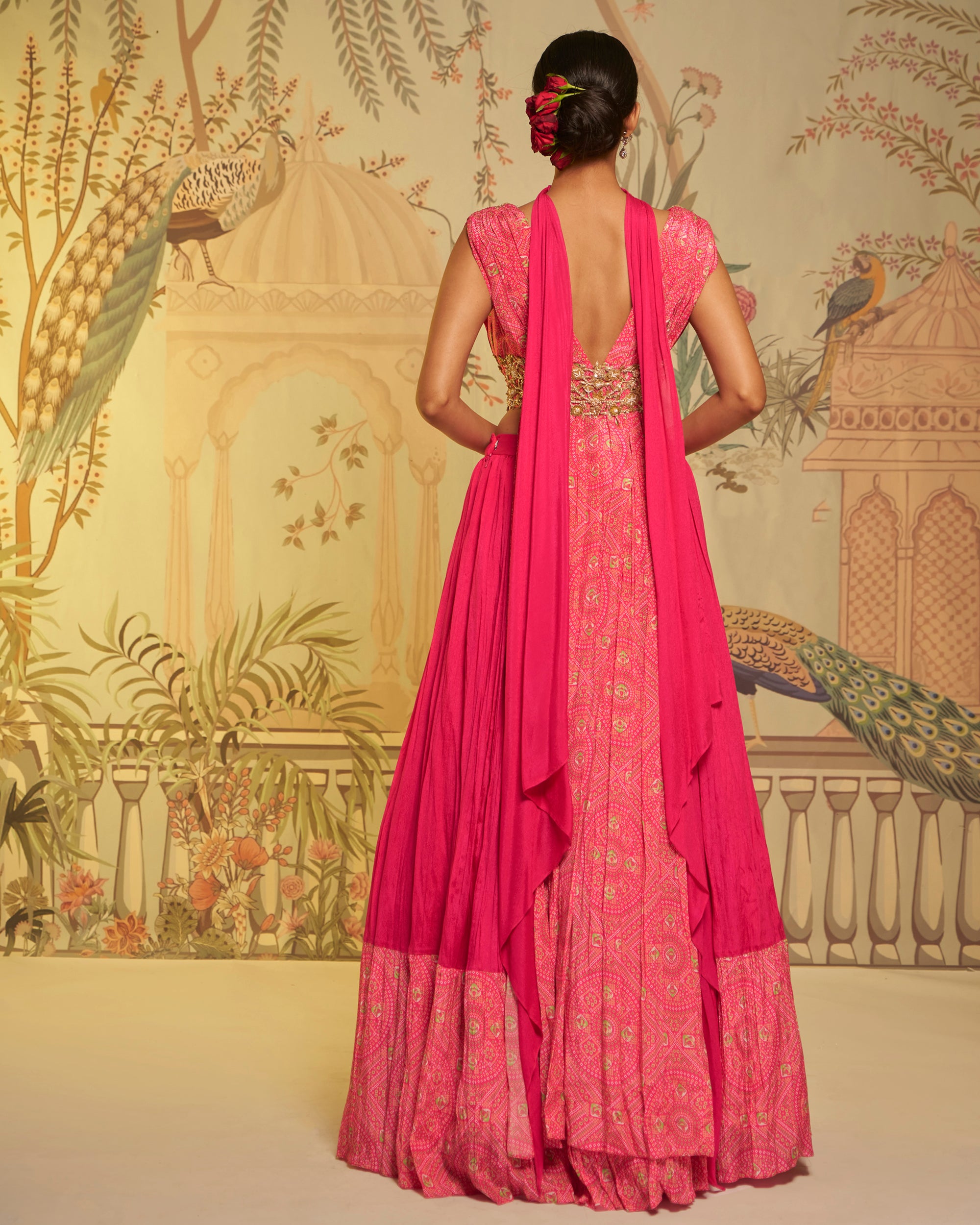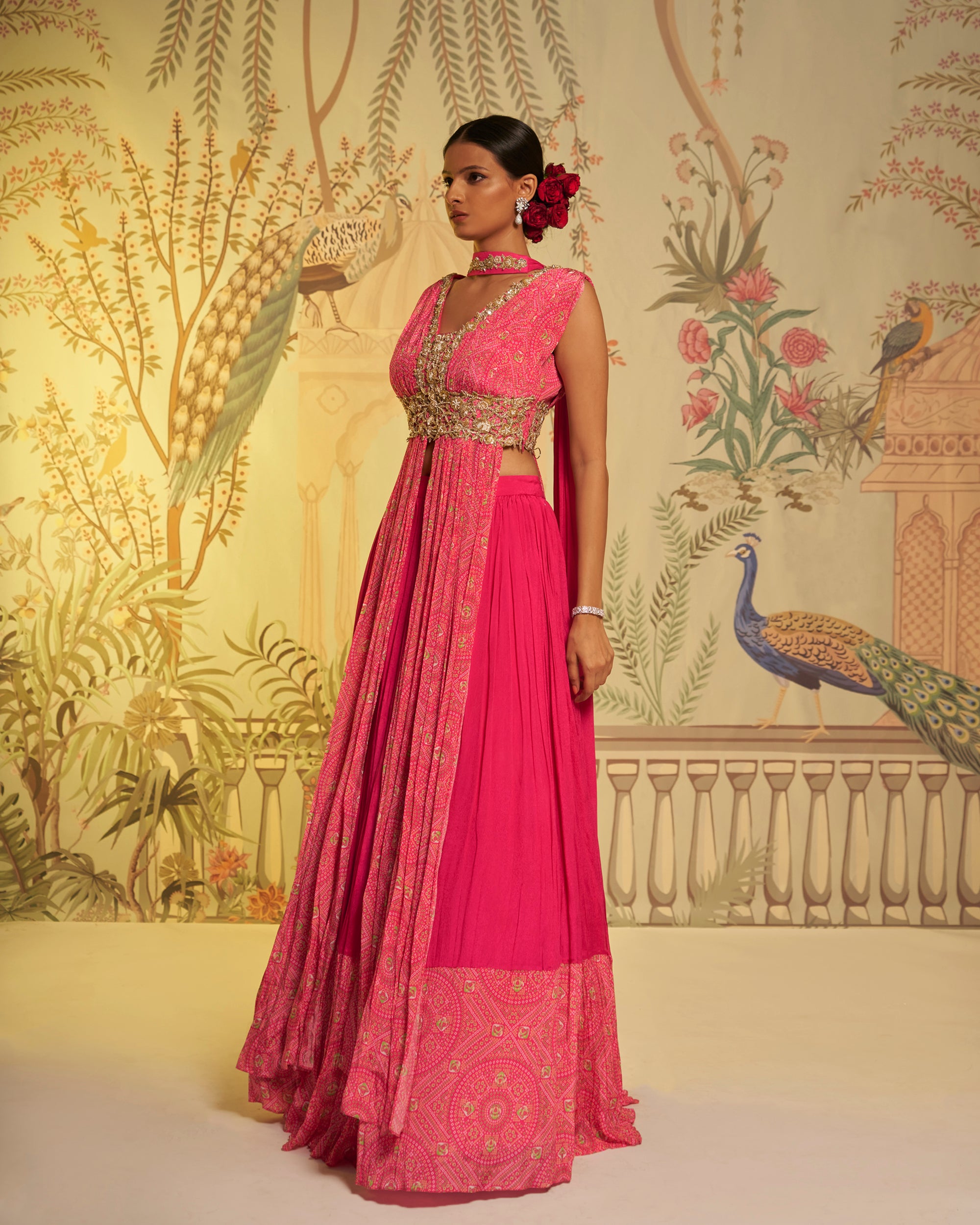 Featuring a pink bandhani hand embroidered Anarkali. It is paired with a net dupatta.