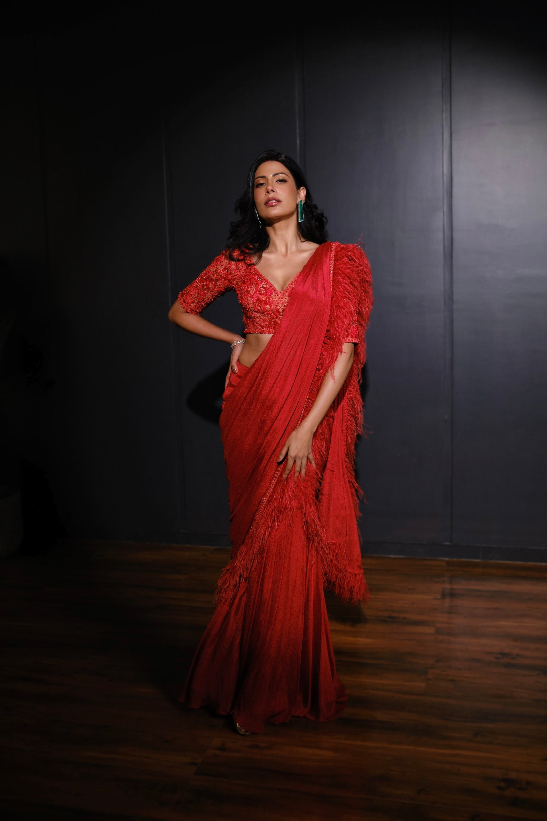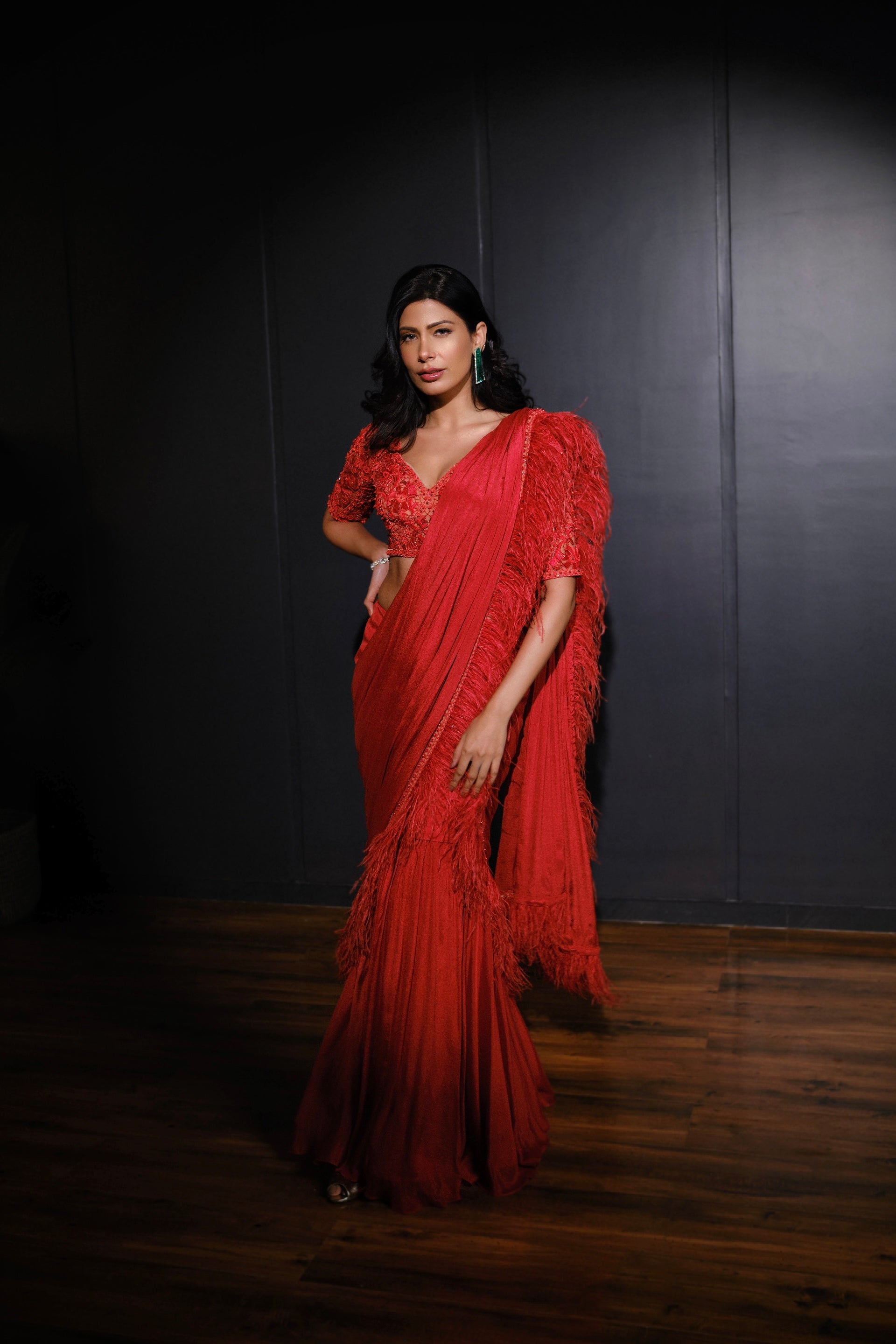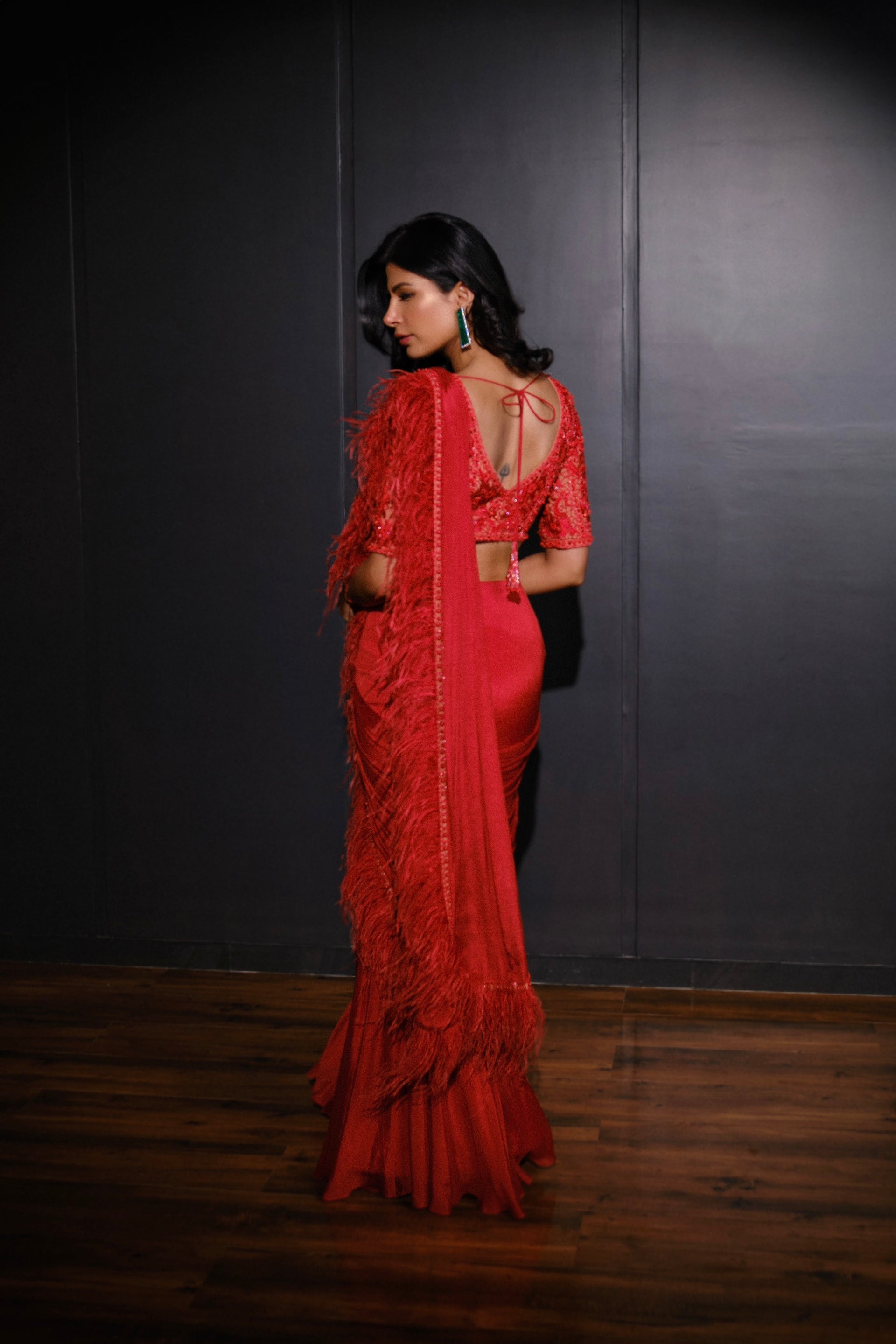 | Red Chiffon & Tulle Hand Embellished Pre-Draped Saree Set Featuring a red pre-draped saree in chiffon and tulle base with feathers, thread and beads hand embellishment. It is paired with a blouse. Perfect wear for cocktail events. |