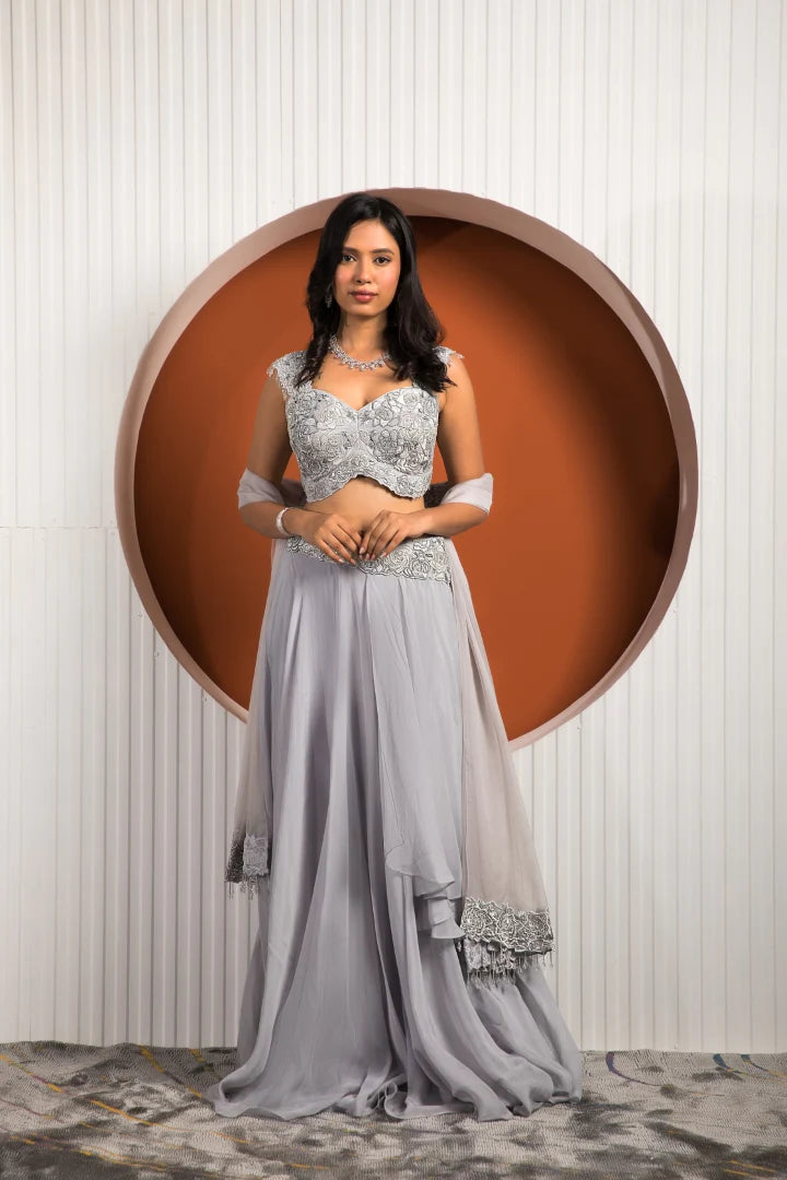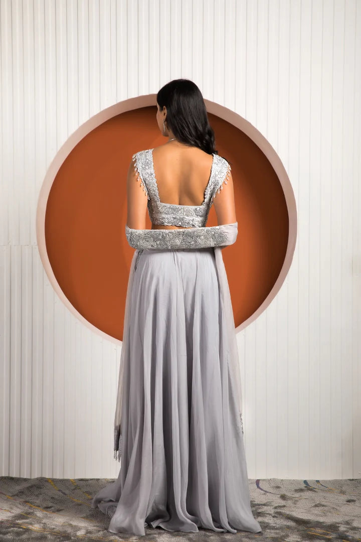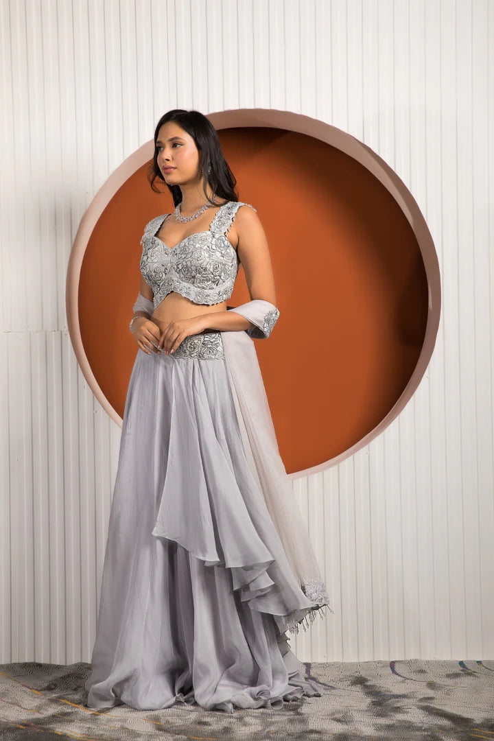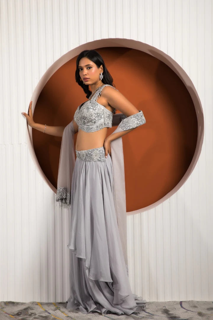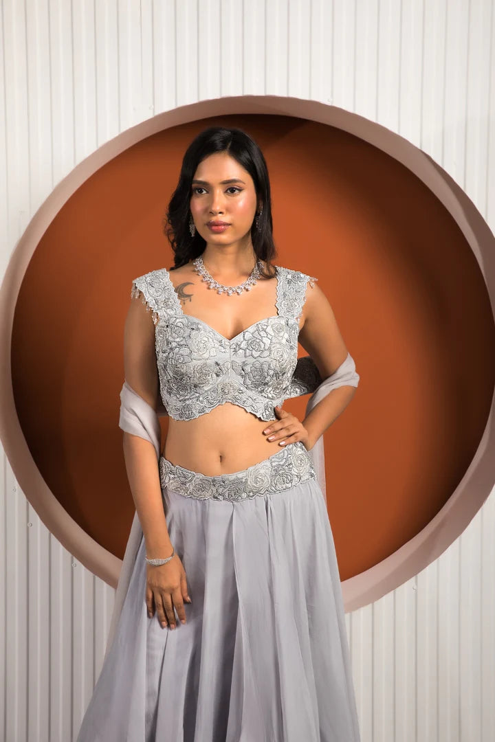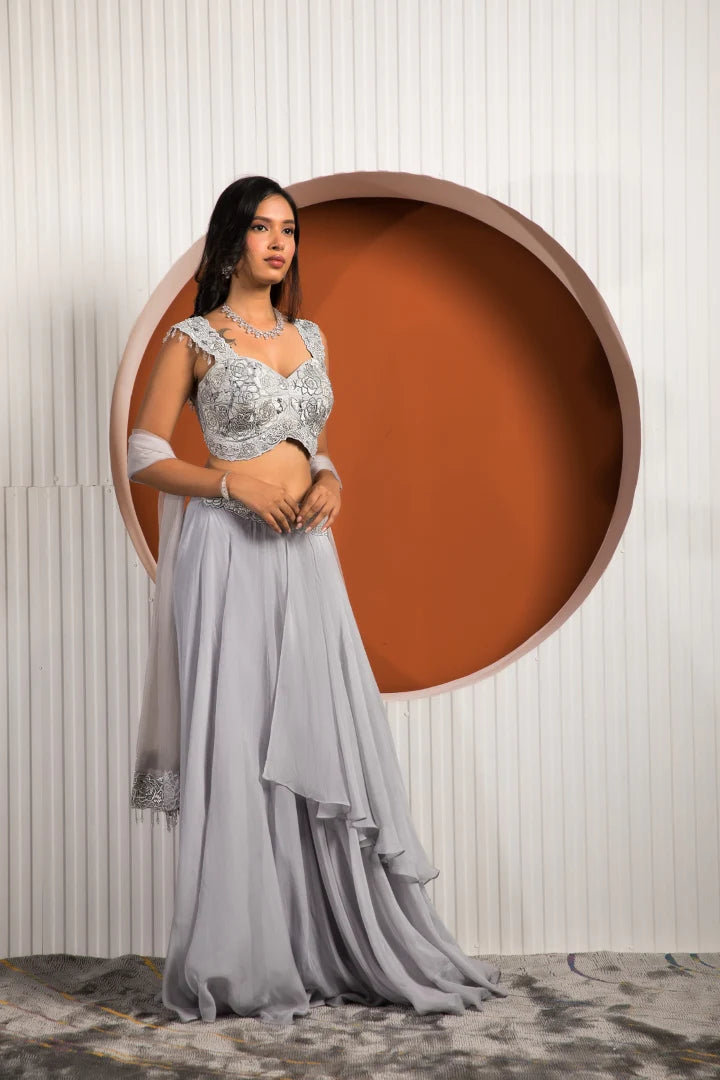 | Featuring the elegance of powder blue on the lovely silhouette of georgette and crepe is this beautiful outfit to transform you into a headturner. The exquisitely crafted Rose blouse and pleated skirt put together a beautiful visage while the organza dupatta completes the mesmerizing look for your next special festivity. |