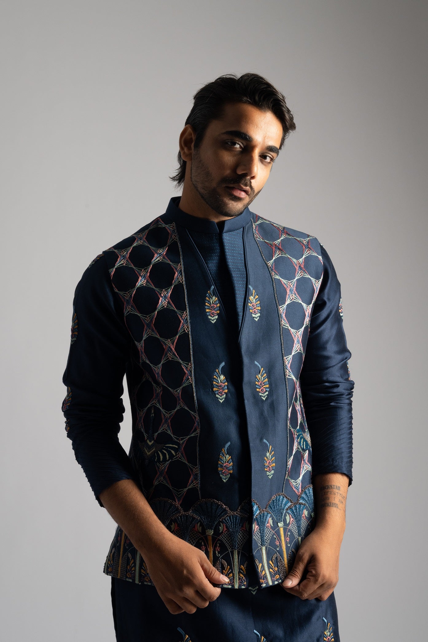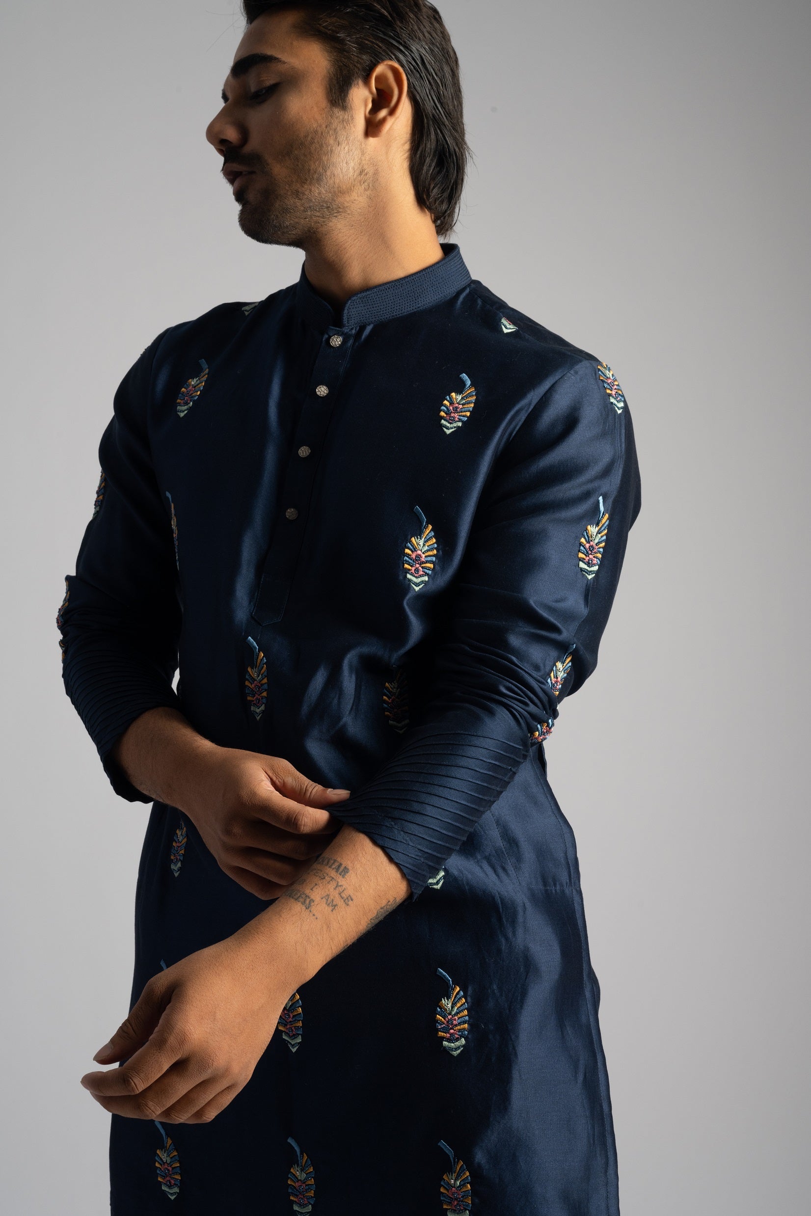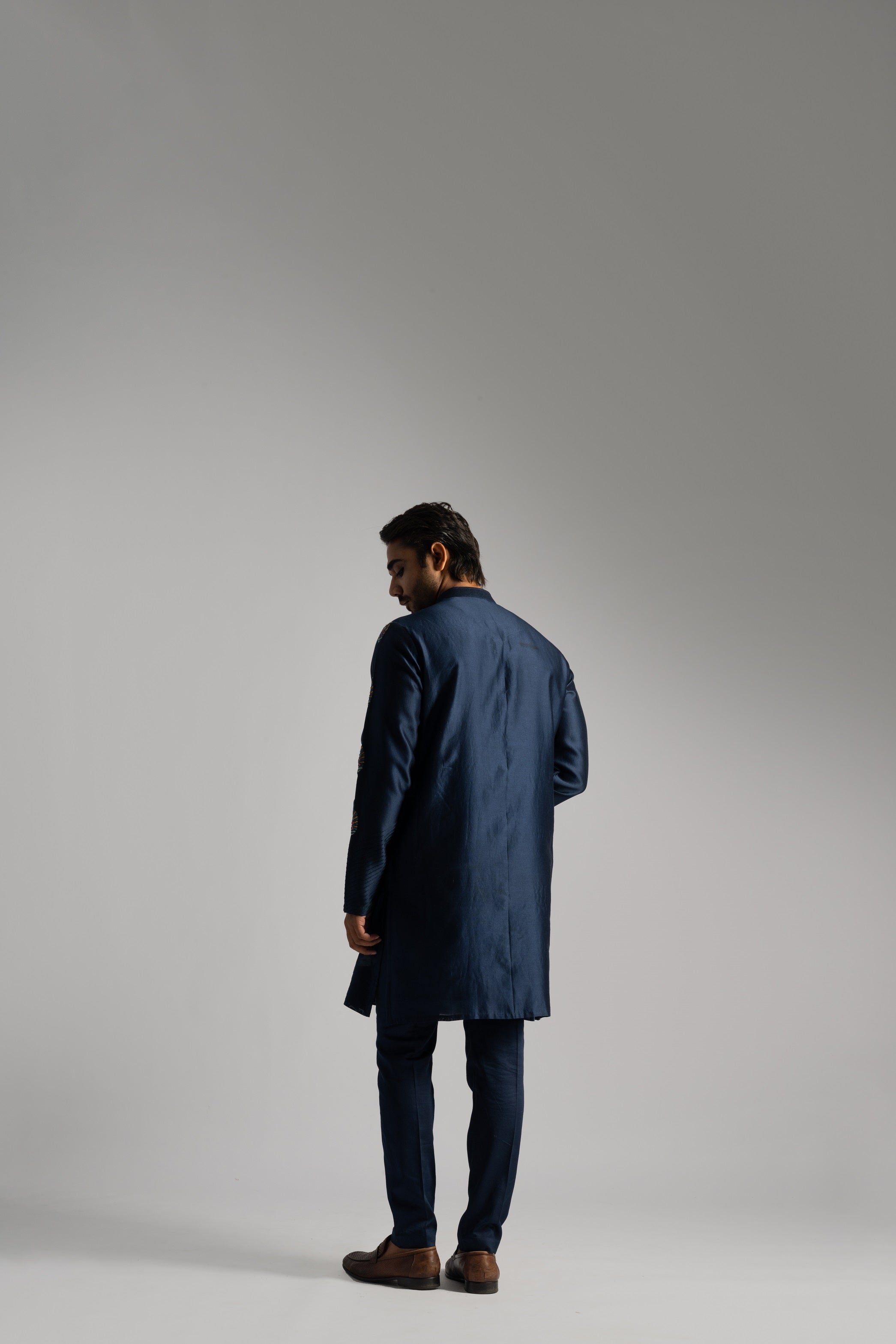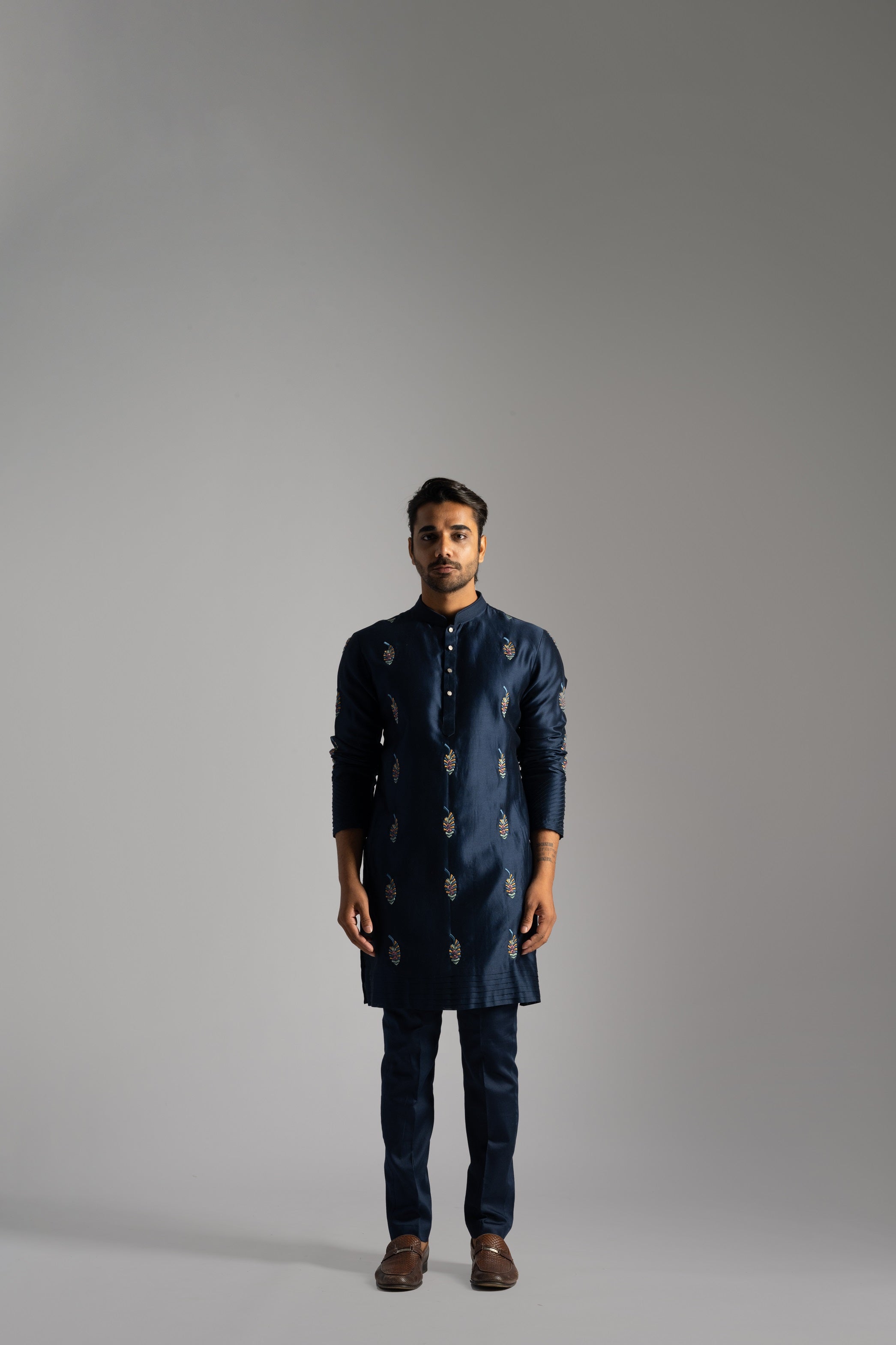 | ROYAL BLUE KURTA IN CHANDERI WITH MOTIFS ALL OVER THE FRONT AND SLEEVES WITH PANT PAJAMA IN THE SAME COLOUR. |