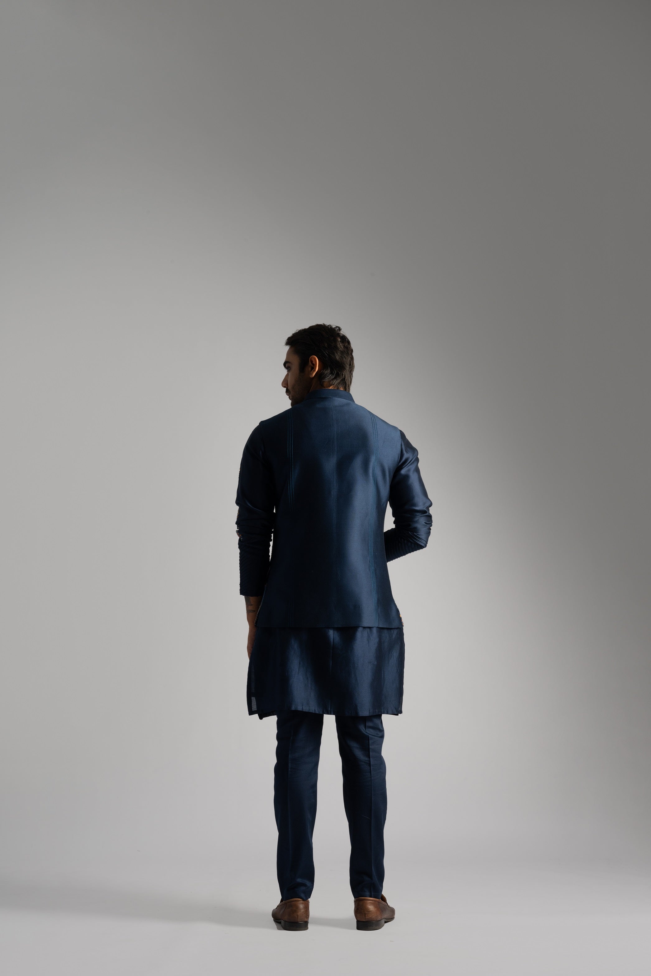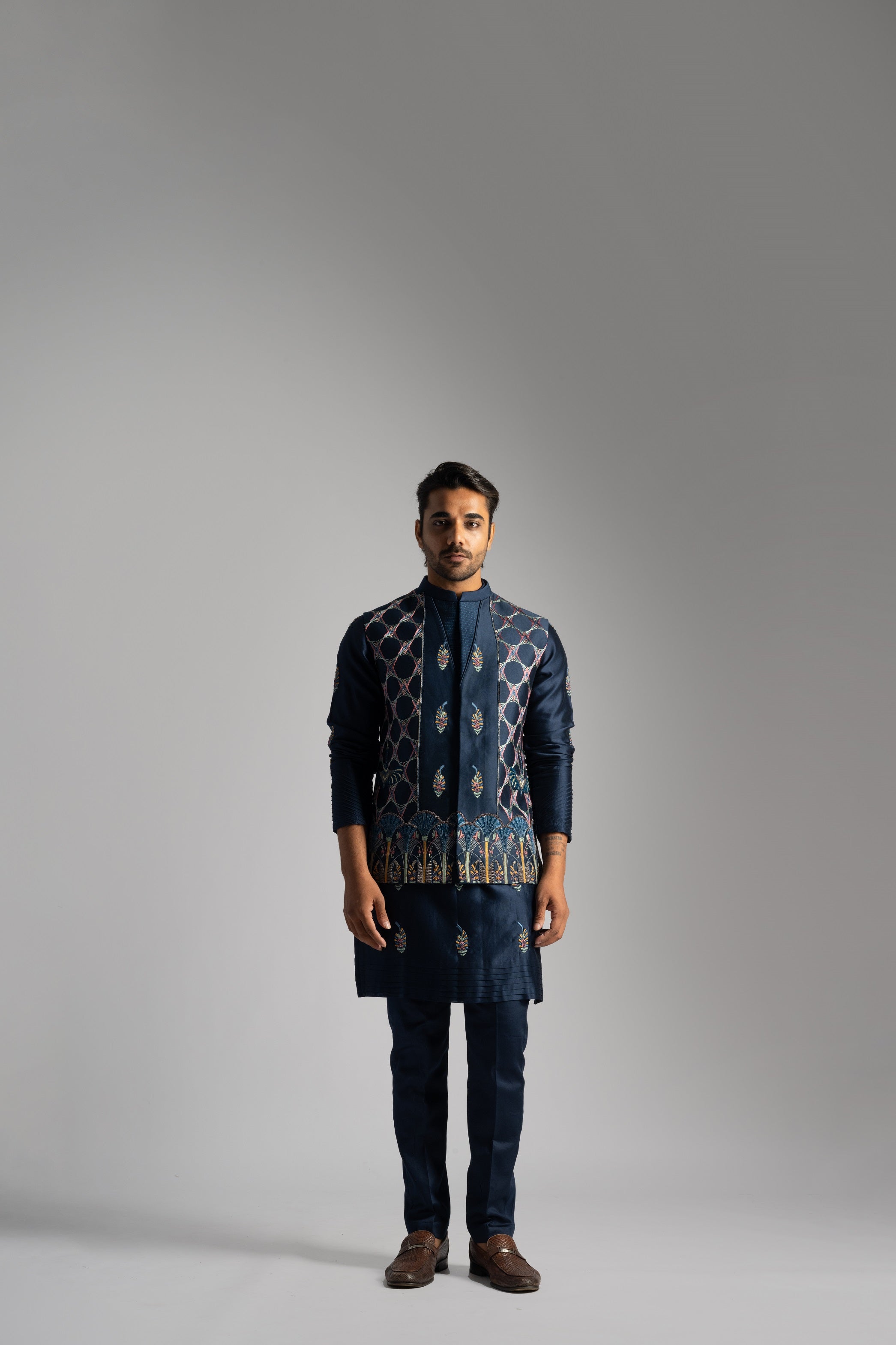 | ROYAL BLUE NEHRU ON CHANDERI FABRIC WITH EGYPTIAN INSPIRED MOTIFS HIGHLIGHTED WITH COLOURFUL THREADWORK. PAIRED WITH ROYAL BLUE KURTA IN CHANDERI WITH MOTIFS ALL OVER THE FRONT AND SLEEVES WITH PANT PAJAMA IN THE SAME COLOUR. |