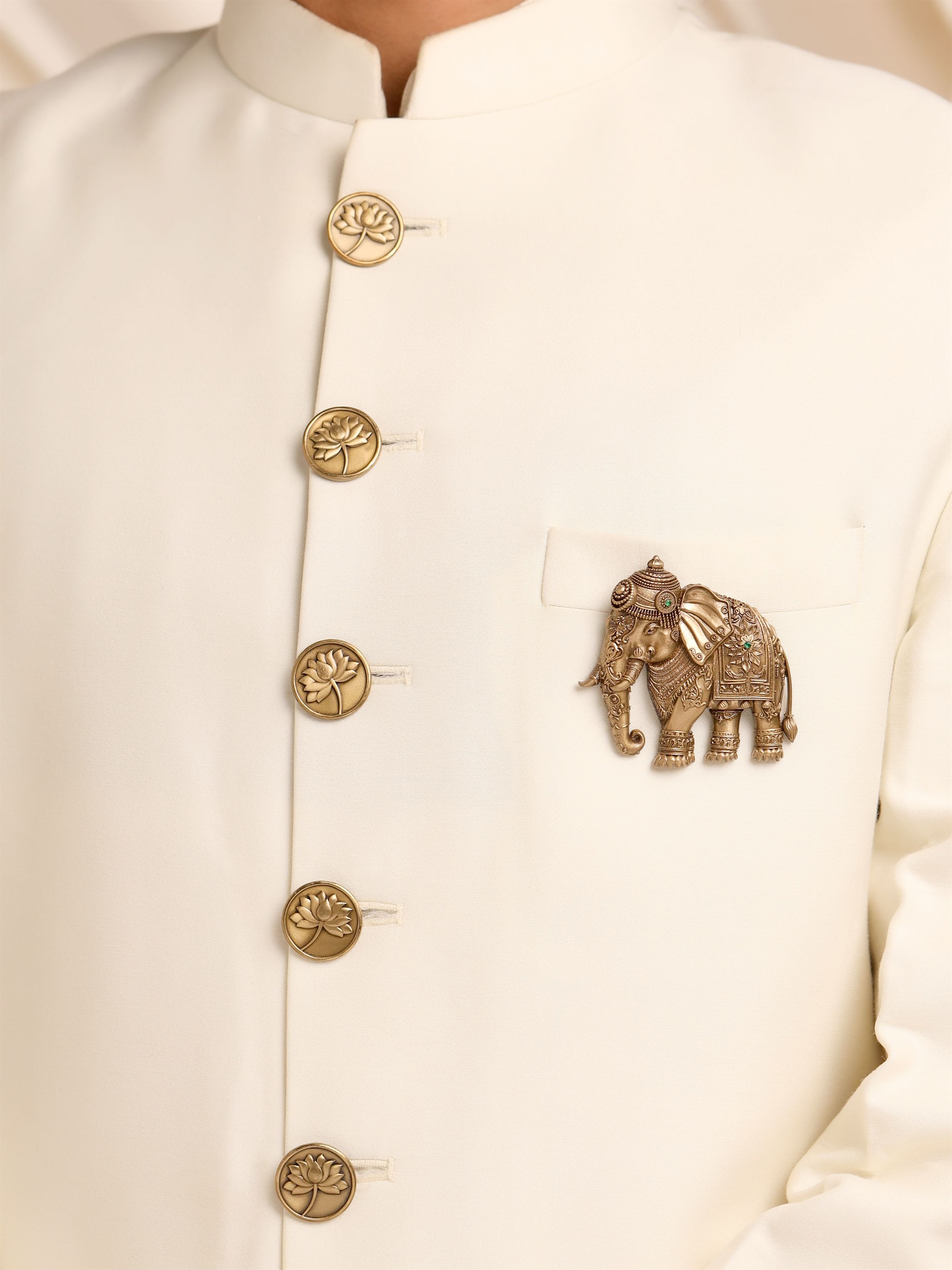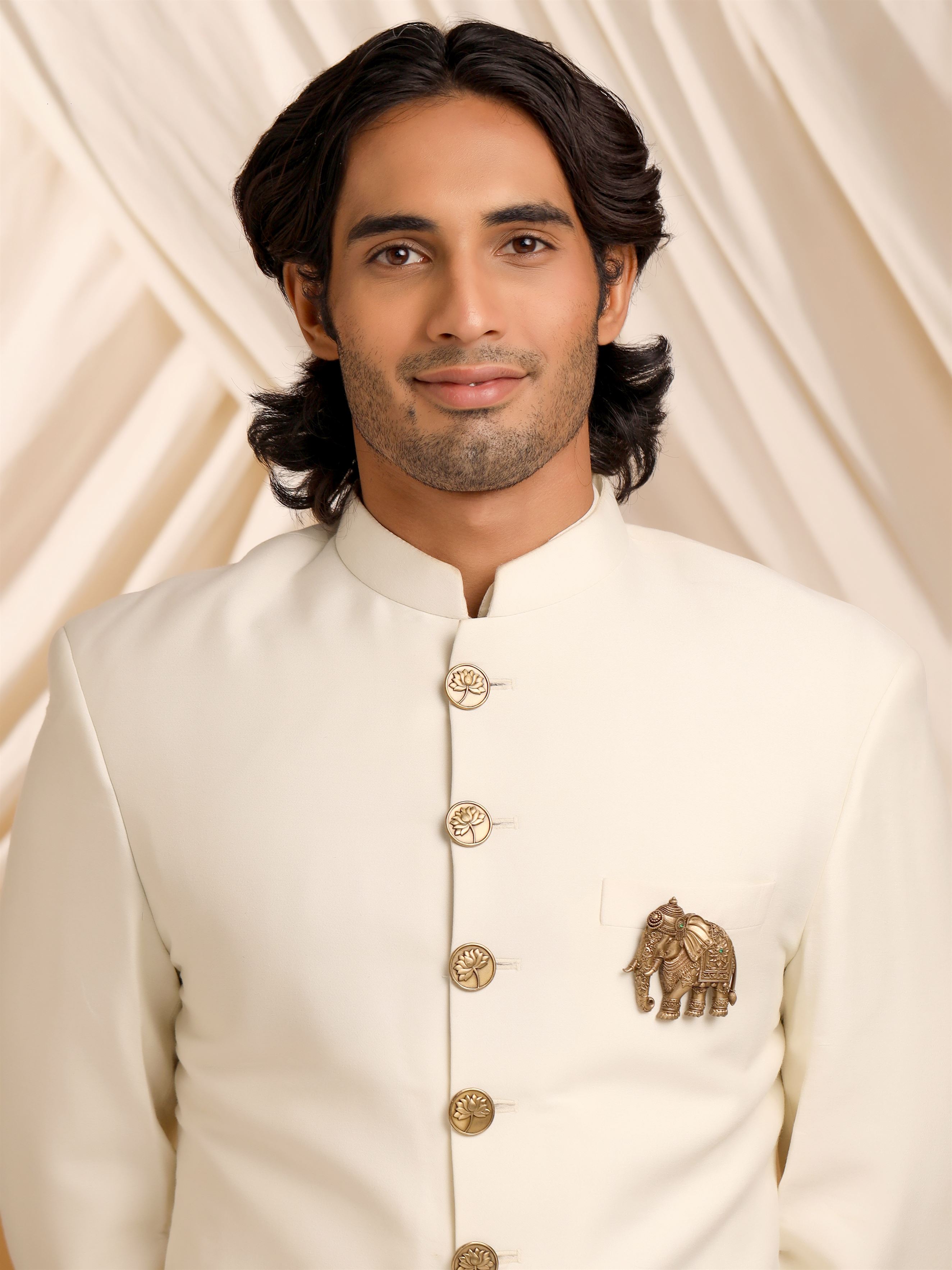 | This lightweight, exquisitely designed brooch features a beautifully detailed elephant adorned with traditional Indian motifs and emerald-like accents. Perfect for adding a touch of cultural elegance to coats, jackets, and bandhgalas, the brooch is a reflection of timeless craftsmanship. Its intricate patterns and historical symbolism make it a unique accessory for both formal and traditional attire. |