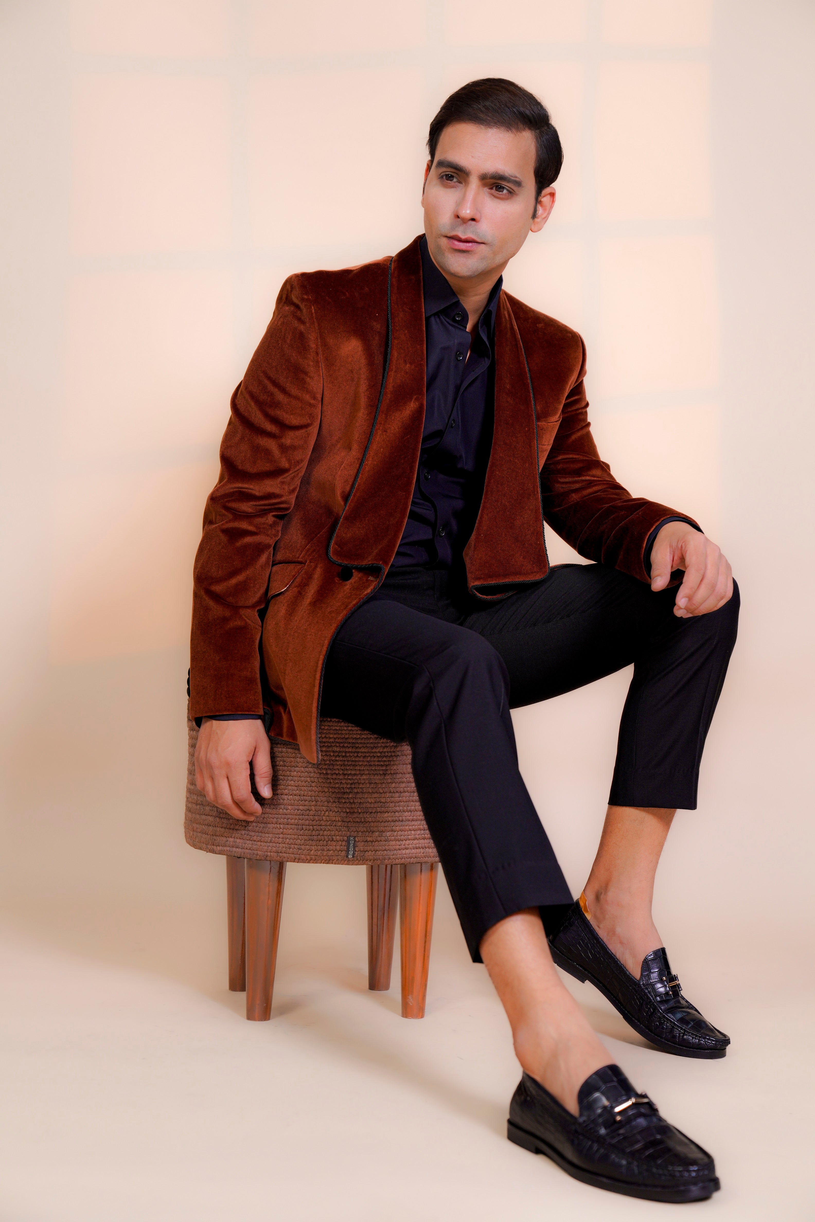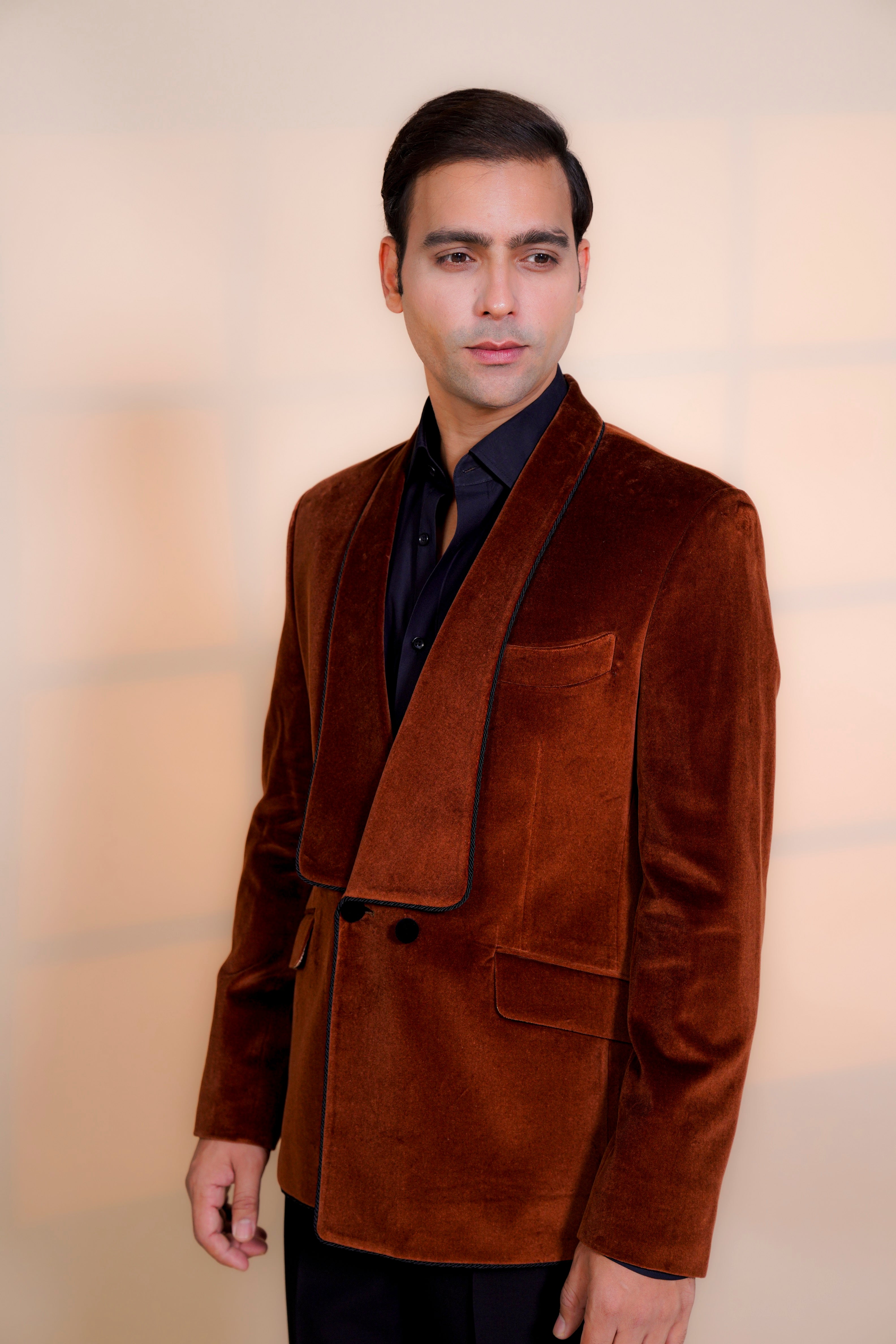 | Featuring the Rust Colour Pure Velvet Suit set with long lapel and Dori Piping .it is paired with Trouser. |