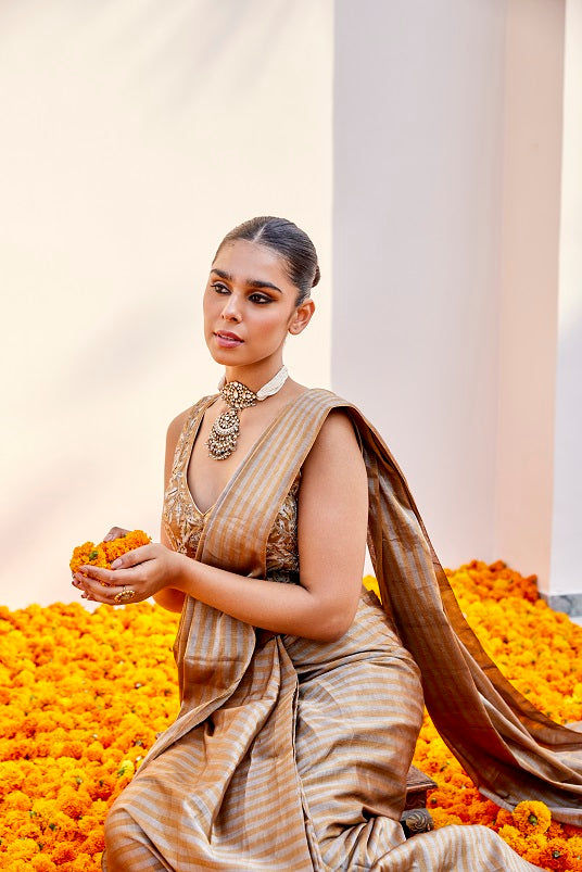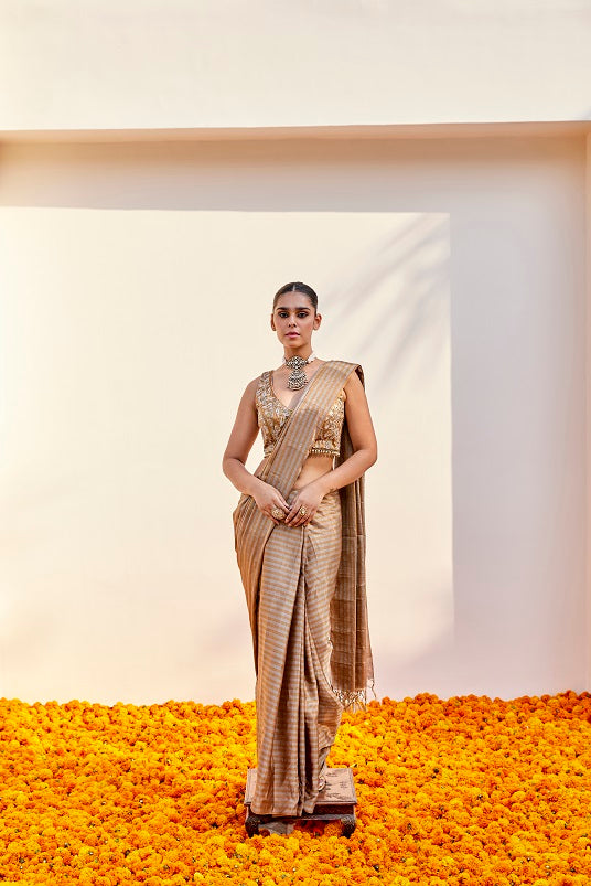 Featuring a Gold Colour Saree set with unique design and grey silver stripes work and pure handwown tissue zari fabric it paired with saree and blouse.
