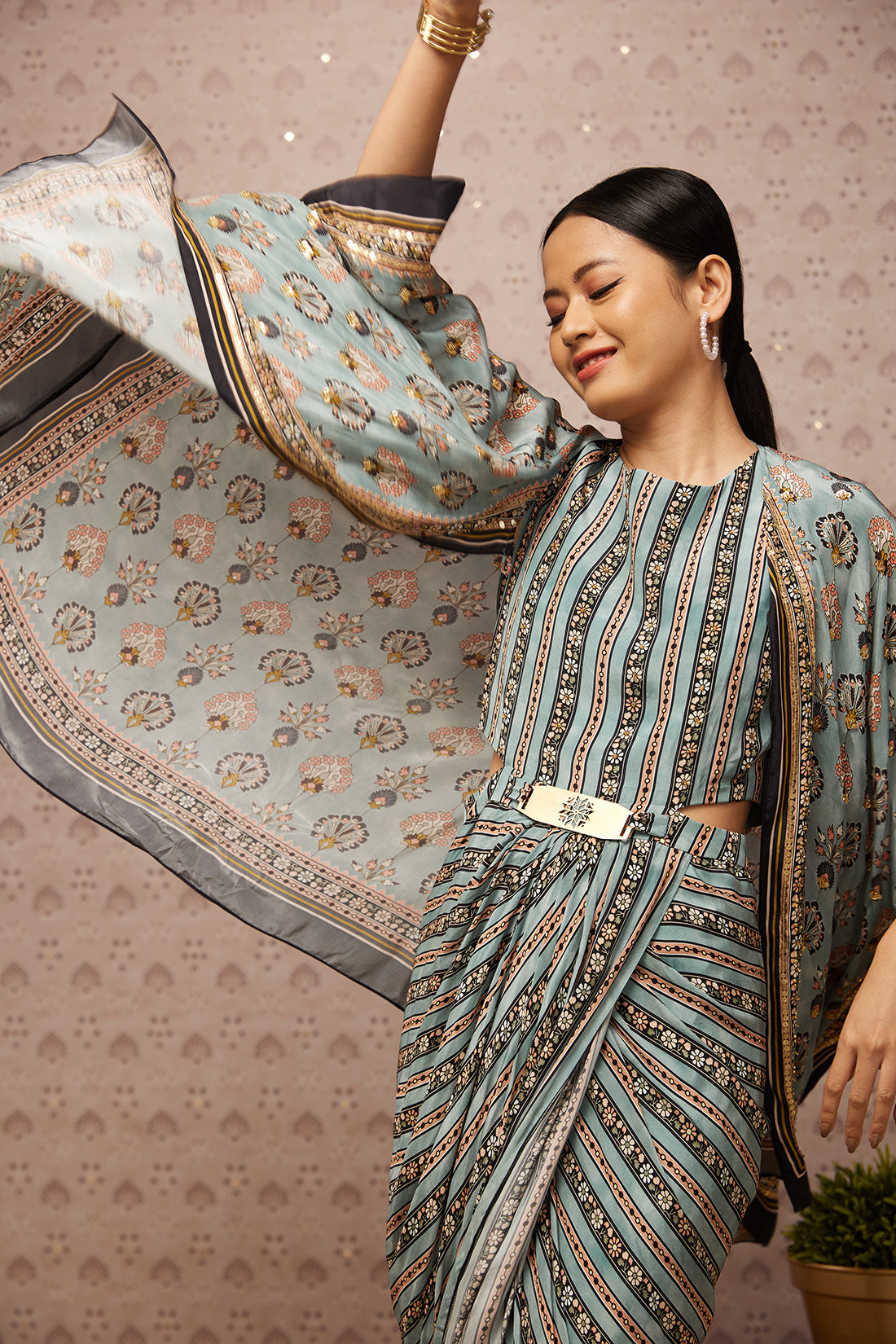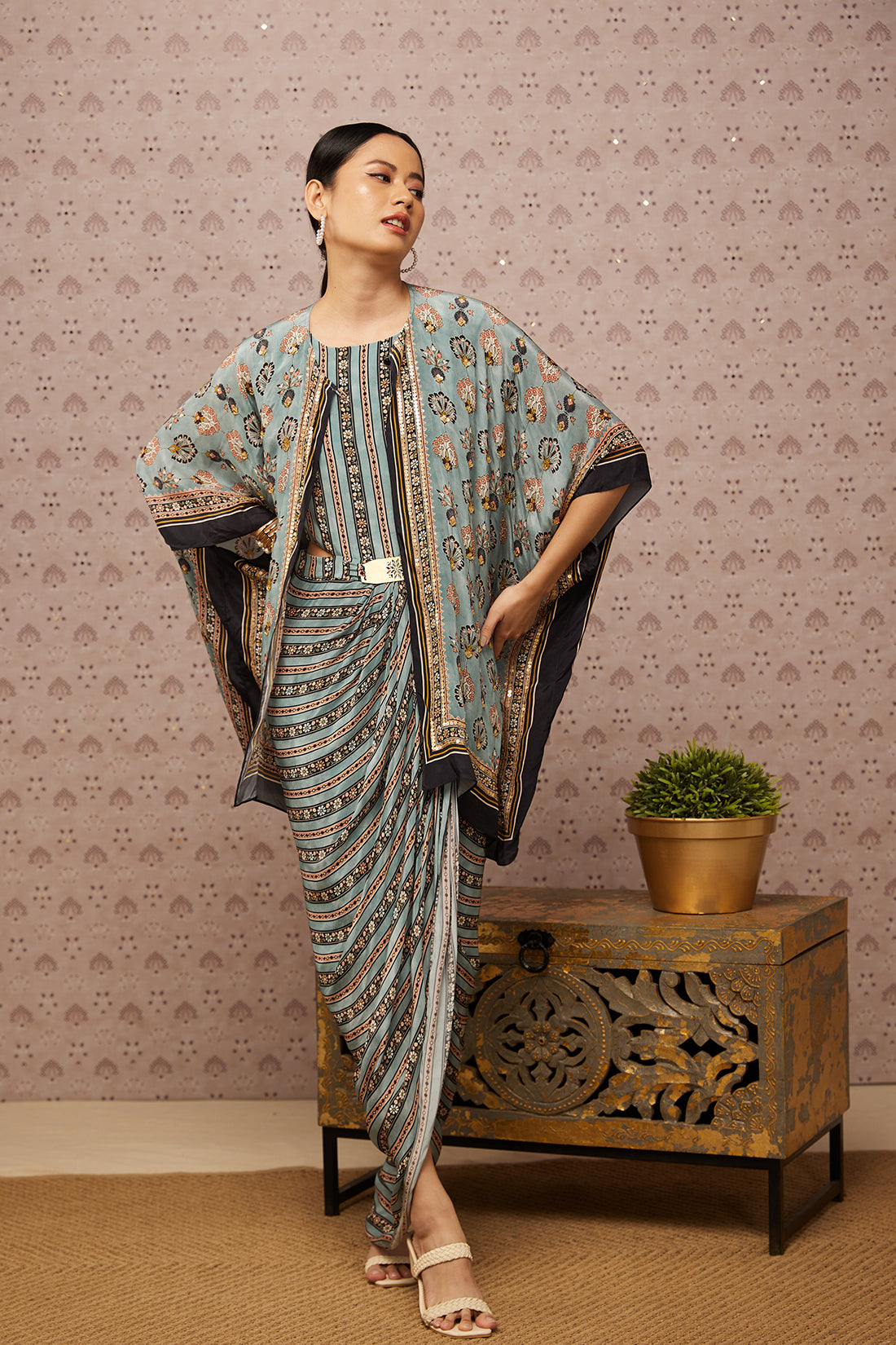 Featuring a crepe fabric Draped dress. It is paired with a cape with embroidered border.