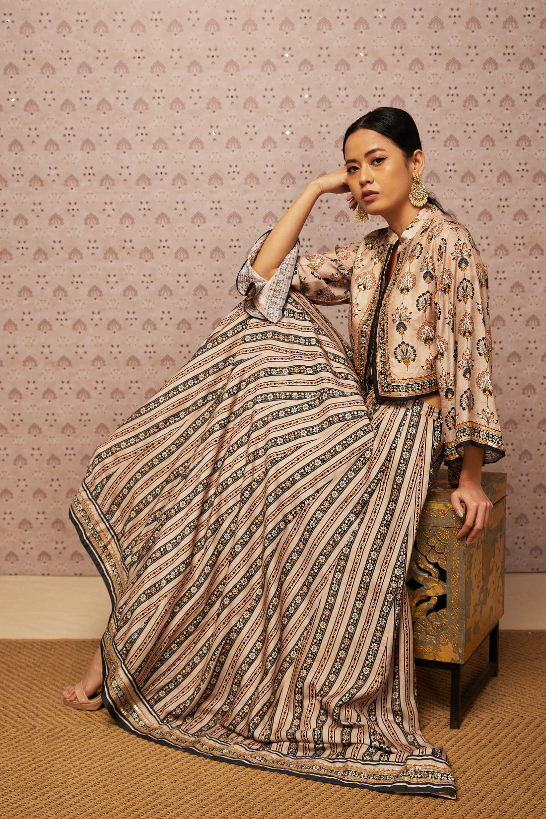 Featuring a beige embroidered lehenga set. It consists of crop top, skirt & jacket. It is silk based fabric.