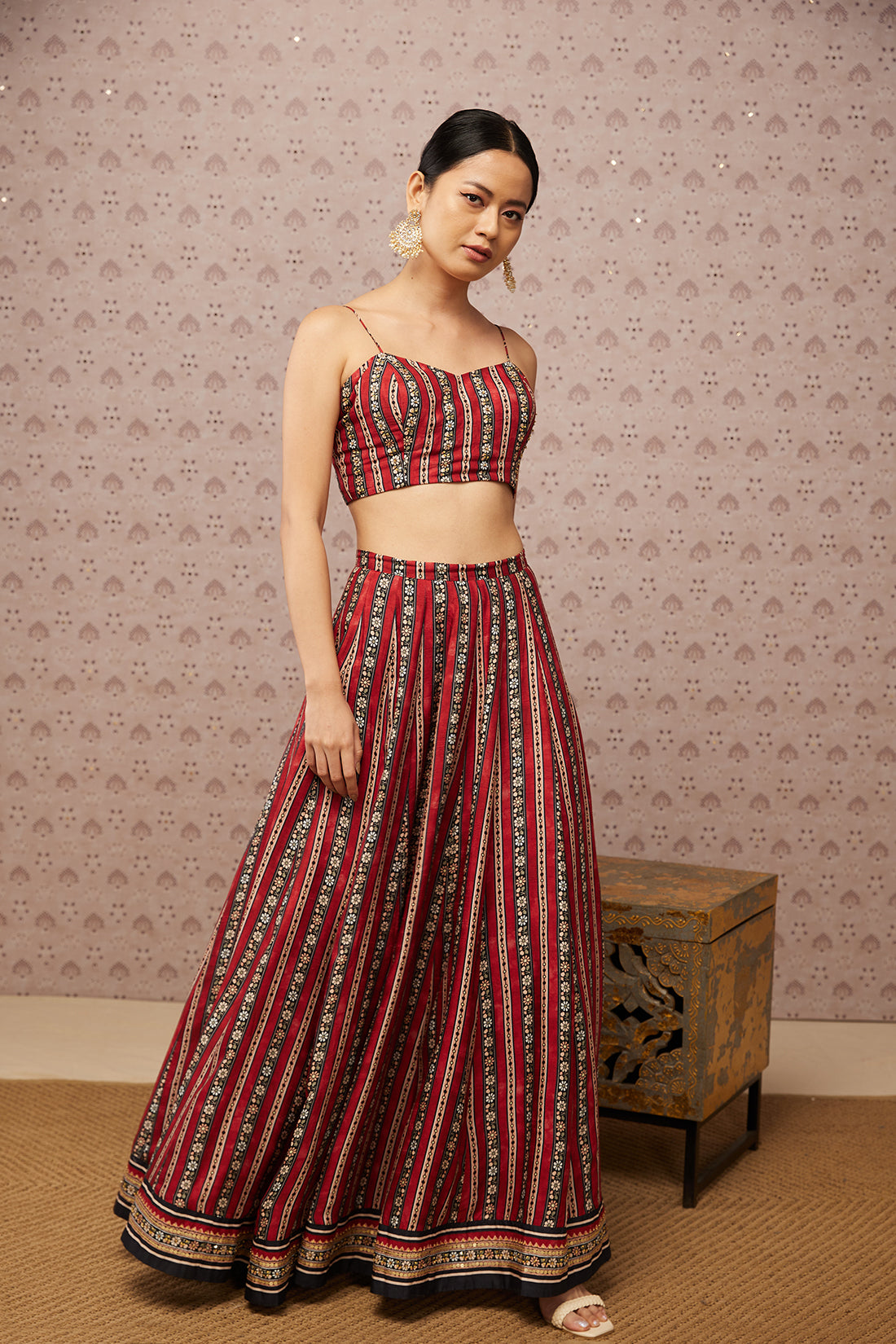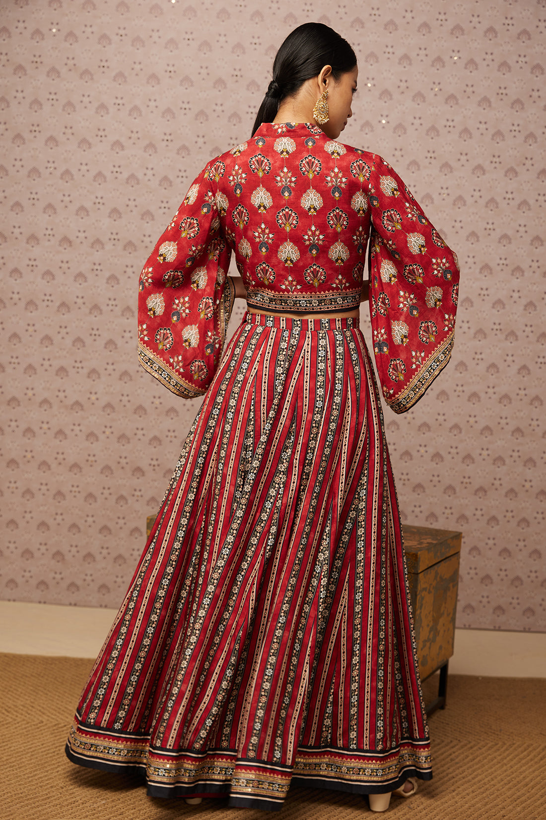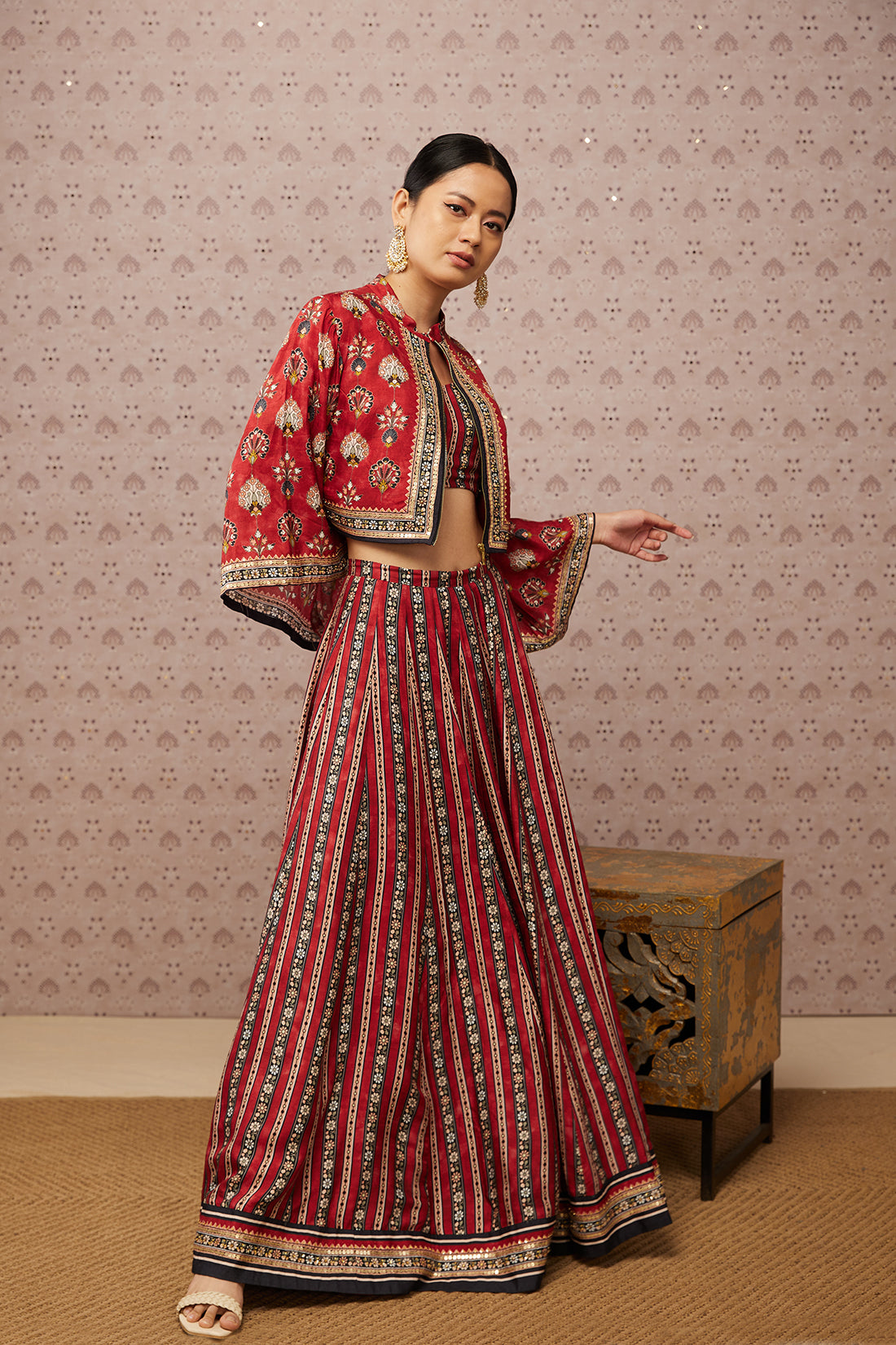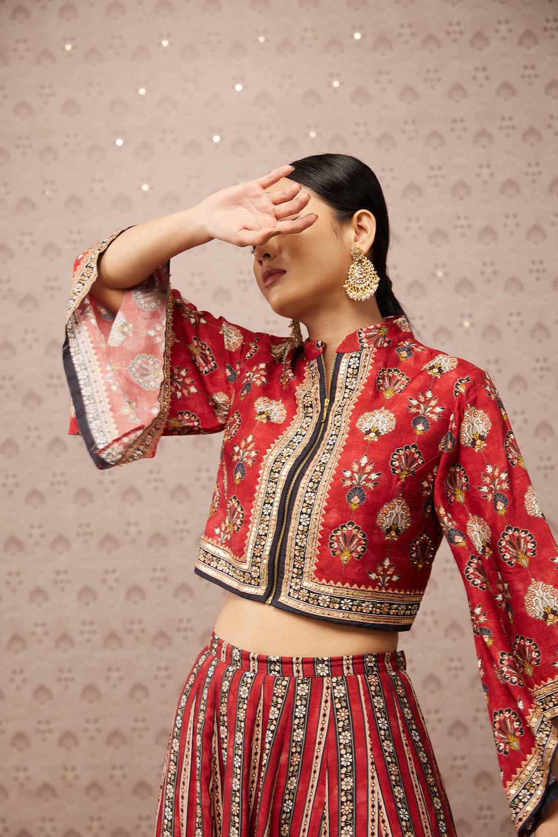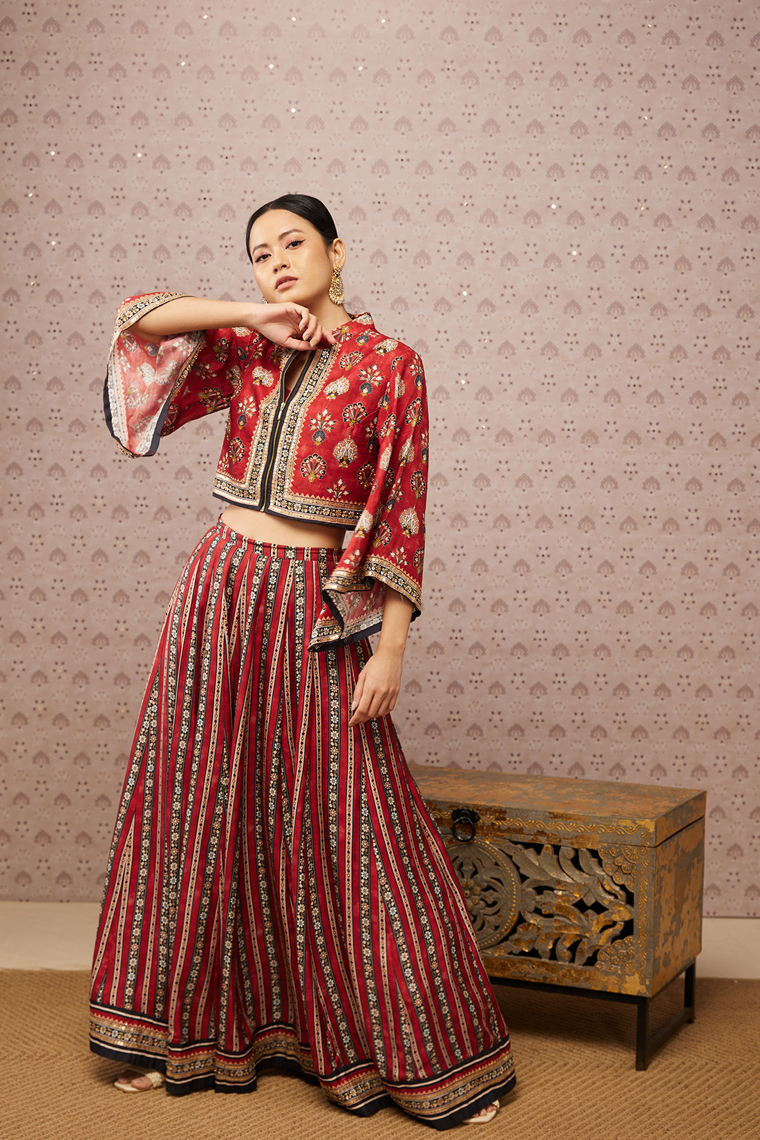 Featuring a silk based lehenga set. It is paired with a crop top and an embroidered jacket.