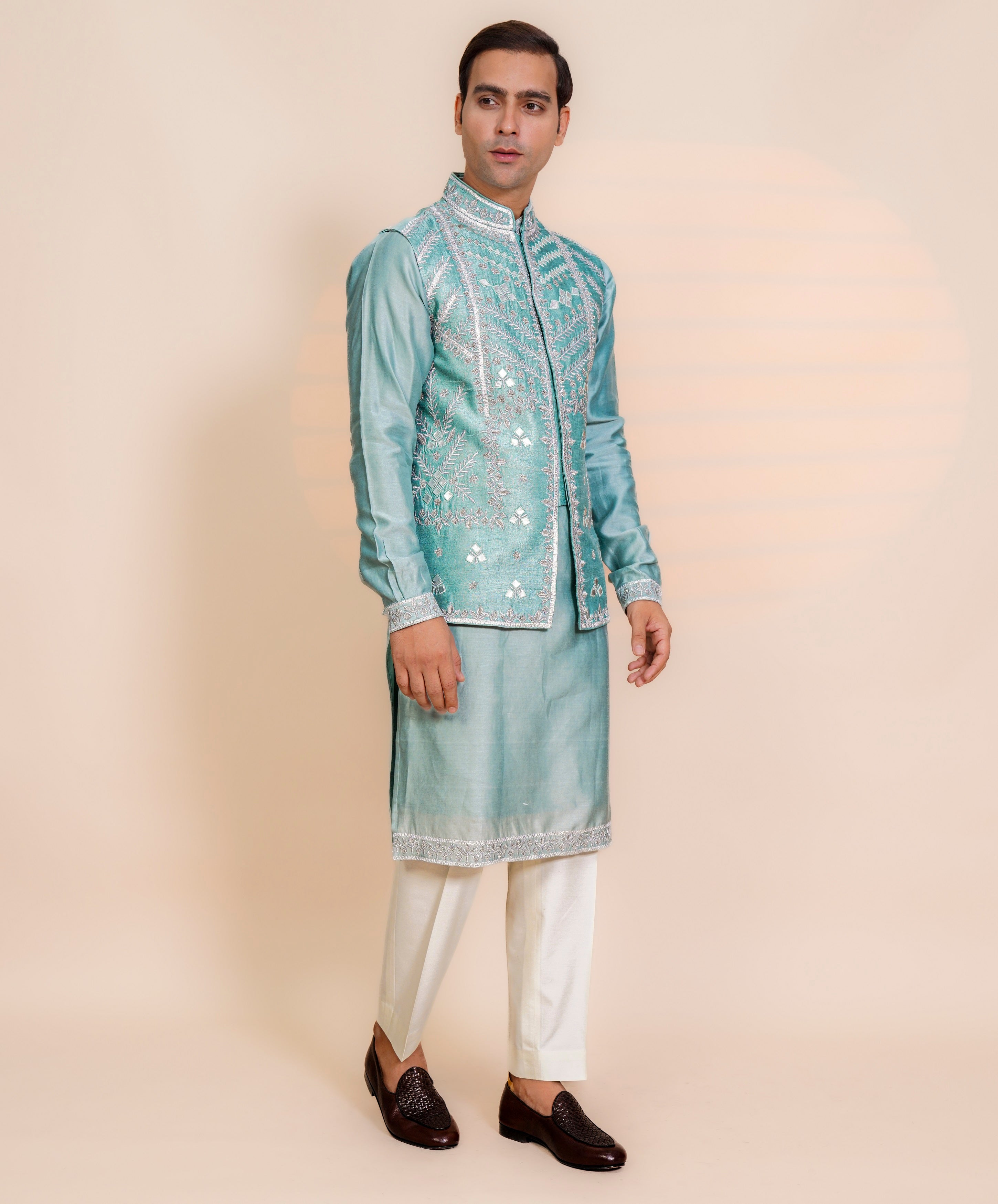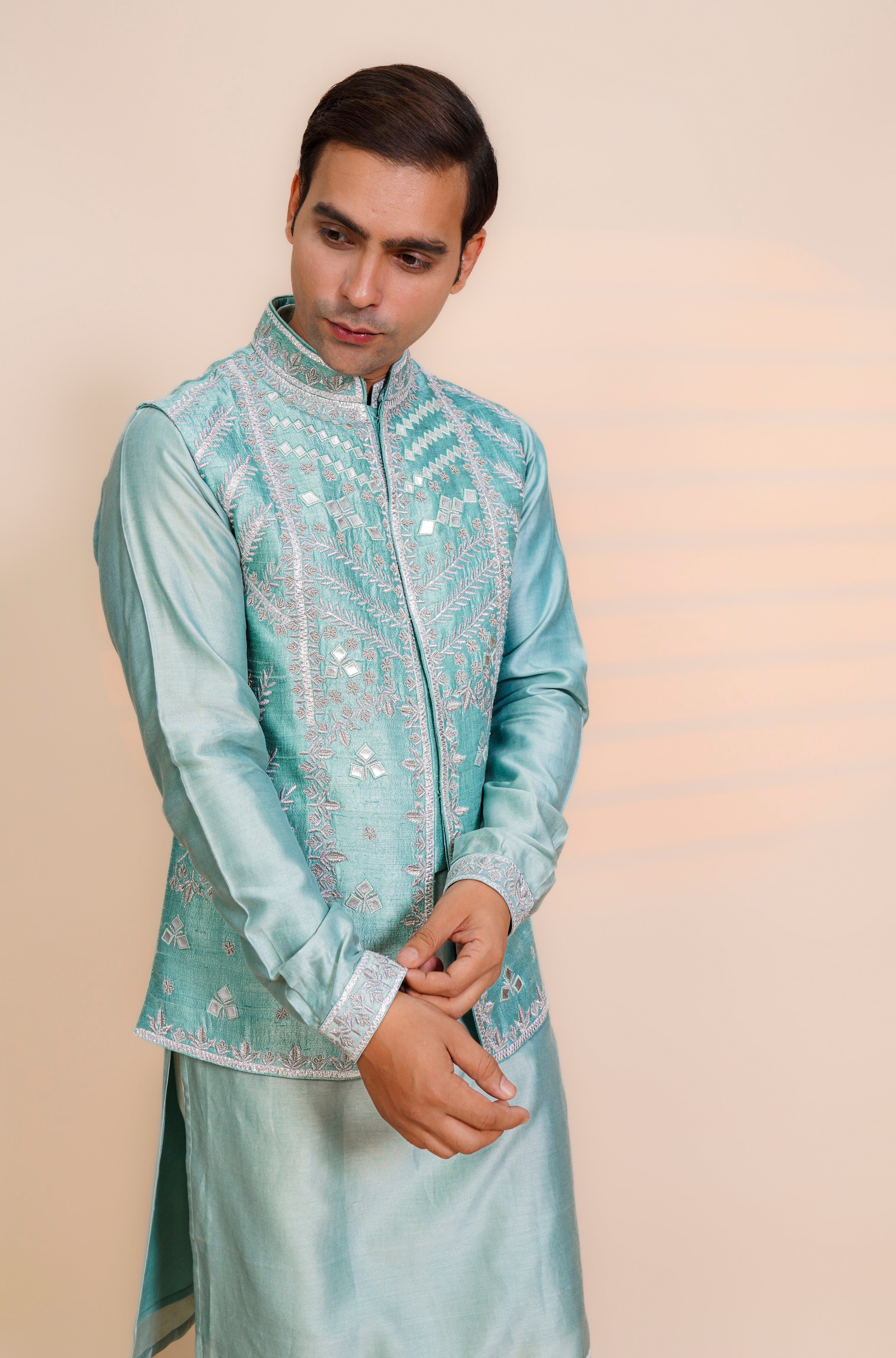 | Featuring the Sea green colour embroided thread and silver Leather work on Nehru jacket set Paired with kurta and Pajama |